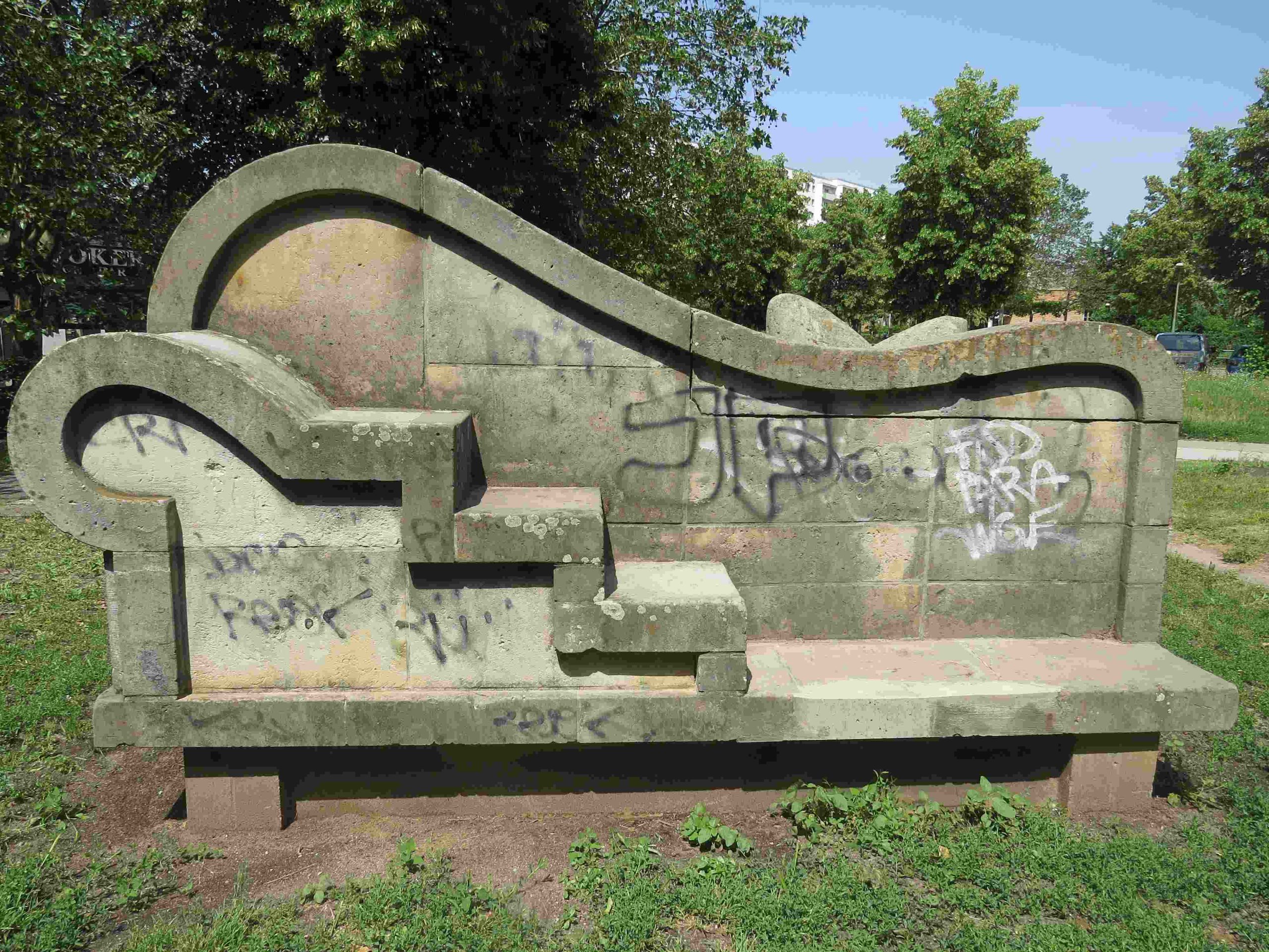 ein wenig vom eigentlichen Sockel absteht und so ein eher dekoratives als tragendes Element darstellt.Gleich darüber liegt eine Sockelplatte auf. Auf ihm ruht das eigentliche Sofa, das drei Polsterelemente in der Sitzfläche darstellt. Es gibt eine einseitig positionierte – rechts, in Frontalansicht,gelegene – Armlehne, die eine abgerundete Dreiecksform aufweist und aus zwei massiven Teilen zusammengesetzt ist. Frontal ist eine dekorative Aussparung eingelassen, die die Form der Lehne in minimierter Größe imitiert. Die Rückenlehne beginnt linksseitig in einer Rundung, die in eine deszendente Schwingung mündet und somit in ein „Tal“ führt, welches sich anschließend exponentiell in eine weitere, wesentlich erhöhte Rundung – rechtsseitig – aufschwingt. Die Lehne ist deutlich sichtbar aus fünf Einzelteilen zusammengesetzt. Die dazwischen sitzenden Fugen sind ebenfalls deutlich sichtbar. Exakt im linken Drittel der Sitzfläche ist einrechteckigessteinernes Kissen arrangiert, auf dessen Oberseite mittig eine dekorative Falz eingelassen ist. Rückseitig dehnt sich der Sockel etwa 50 Zentimeter über die Länge des eigentlichen Sofas aus und bietet damit Platz für drei – posterior betrachtet – linksseitig installierte Stufen, die in die überstehende Armlehne münden. Die Stufen nehmen exakt die linke Hälfte des Sockels in Beschlag; die rechte Seite ist komplett frei und gibt somit den Blick auf die Sockelplatte frei. Durch diesen freistehenden Bereich fällt auf, dass der Sockel – und insbesondere die Sockelplatte – eine wesentlich glattere Struktur aufweist, als der Rest der Skulptur. Unter dem letzten Stufenabsatz ist zudem eine hellere Stelle sichtbar, die bei genauerer Betrachtung aus Beton besteht. Hier wurde also vermutlich die Ausbesserung einer bestehenden Beschädigung des Ursprungsmaterials vorgenommen.An der Armlehne sind auchhier Aussparungen vorgenommen, wie sie auch auf der Frontalansicht der Lehne beobachtbar sind, nur das hier die Form der Stufen einbezogen wurde. Die gleiche Art von Aussparungziert zudem die Rückseite der Rückenlehne. An dieser fällt zudem auf, dass sie aus mindestens sechs weiteren rechteckigen Steinen besteht, als frontal vorerst sichtbar sind (Fabian Stammen).
