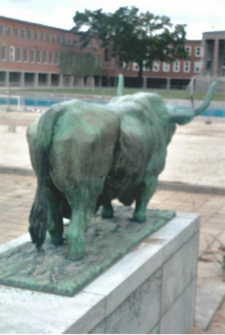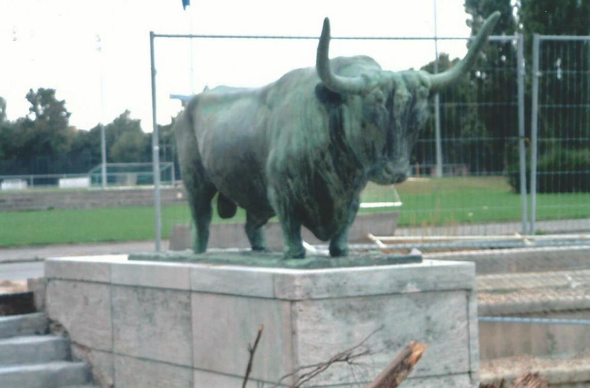 Die Bronzeplastiken „Stier“ und „Kuh“ flankieren auf den Treppenwangen aus Muschelkalk stehend den offenen Zugang an der südwestlichen Seite des Jahnplatzes. Die sich vom Platz aus gesehen an der rechten Seite befindliche Kuh hatte ursprünglich ein Kalb neben sich stehen, dessen Verbleib heute unbekannt ist. Die Markierungen auf der Plinthe hierfür sind noch vorhanden (Susanne Kähler).