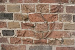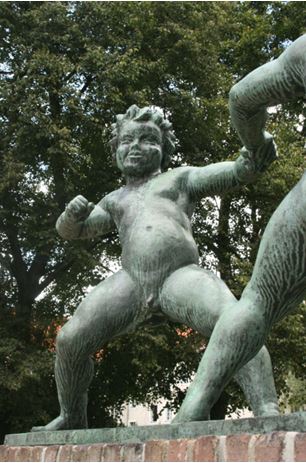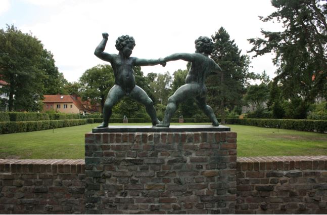 Auf einer aus rustikalen Klinkern gefügten Brunnenarchitektur, deren hinterfangende und gleichzeitig als Substruktionsmauerverkleidung dienenden Mauer mit Ziegelreliefs (Vogel, Fisch, Eichhörnchen, Hase) verziert ist, steht auf längsrechteckiger Plinthe die Bronzegruppe zweier kämpfender („streitender“) Knaben („Putten“) (Susanne Kähler).