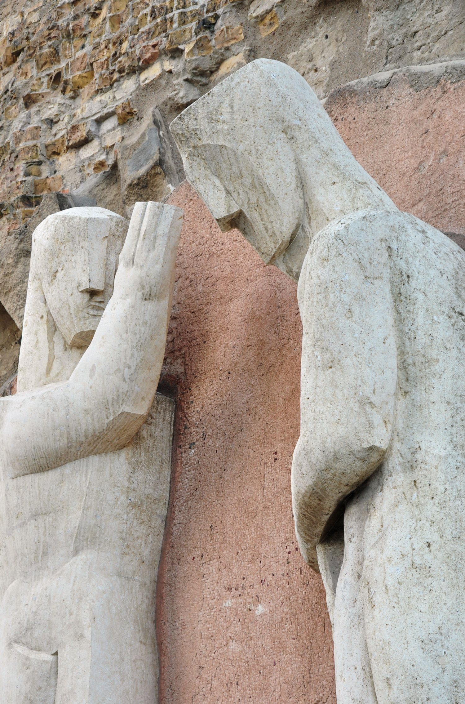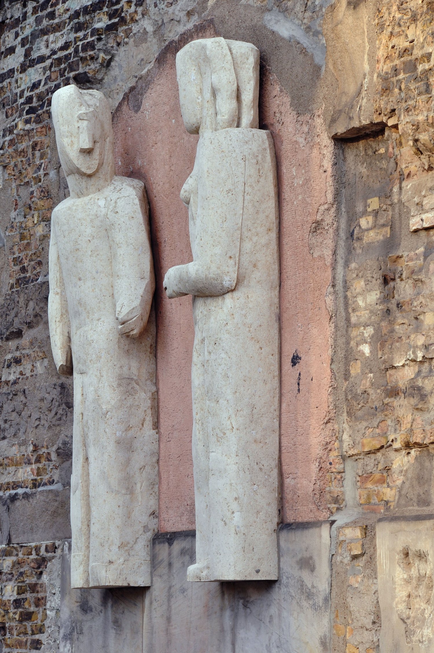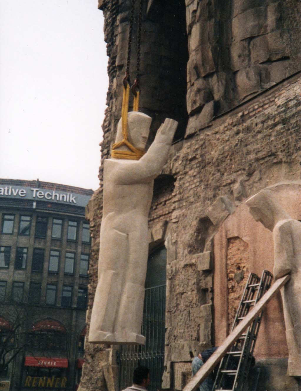 An der Ostseite des alten Turms der Kaiser-Wilhelm-Gedächtniskirche, in der Mitte des belebten Breitscheidplatz, wird der Zugang zur Gedenkhalle auf beiden Seiten von je einem Figurenpaar aus gelb-grauen Sandstein gerahmt. Die insgesamt vier Skulpturen sind als Fassadengestaltung über je einem der zwei am alten Turm erhaltenen Sockel befestigt und orientieren sich in ihren Abmessungen an der Höhe der mittleren Türöffnung und der Breite der Sockel. Durch ihre kompakte Gestalt fügen sie sich gut in die Struktur der Turmruine ein, es wirkt fast so, als wären sie schon immer da gewesen.