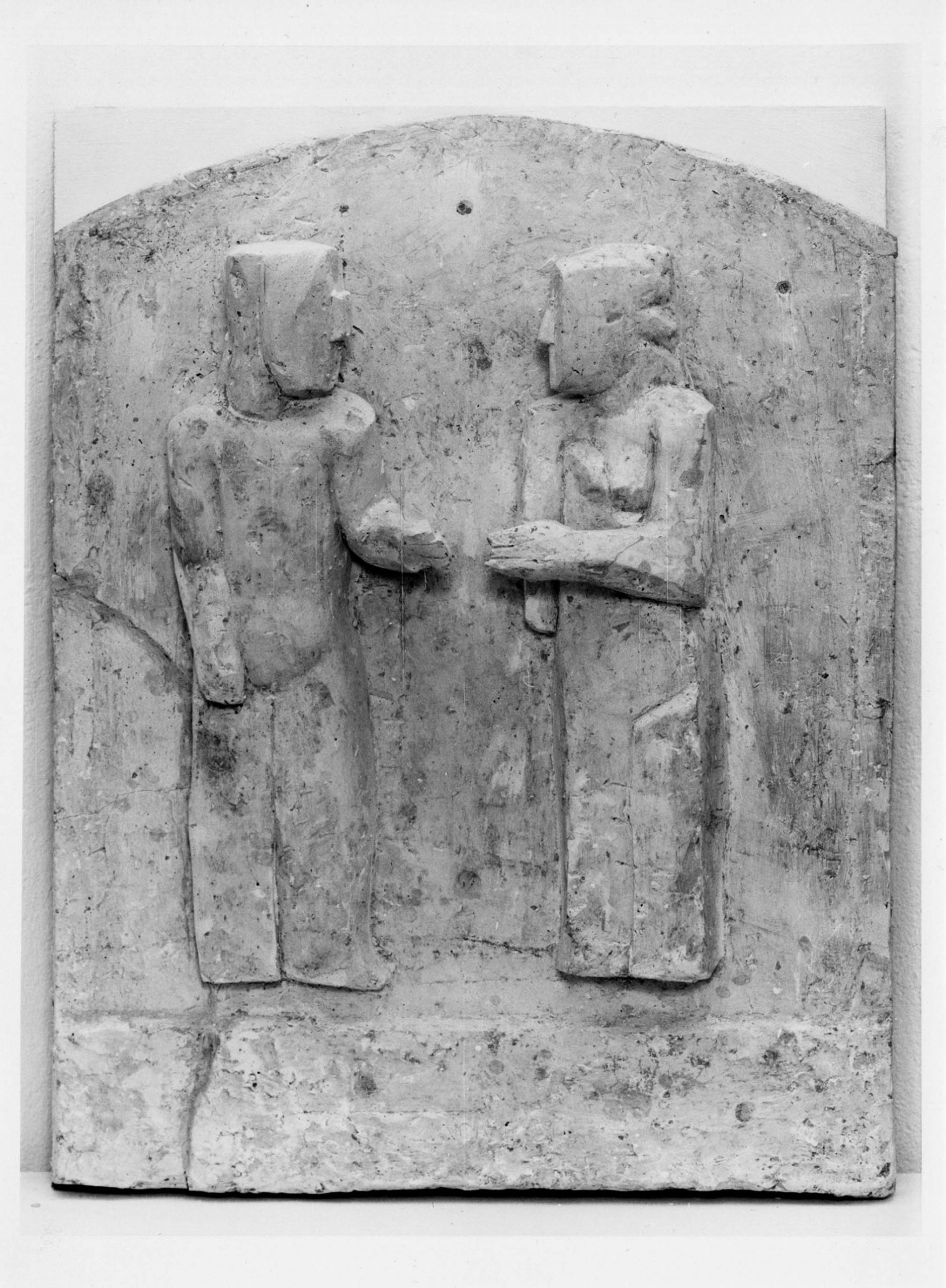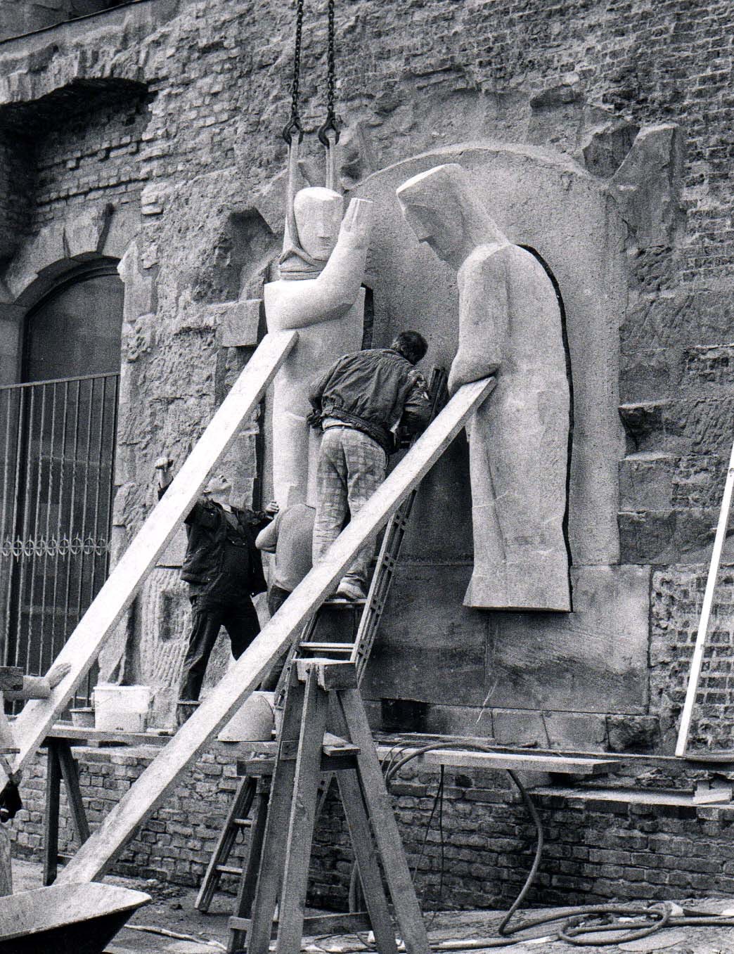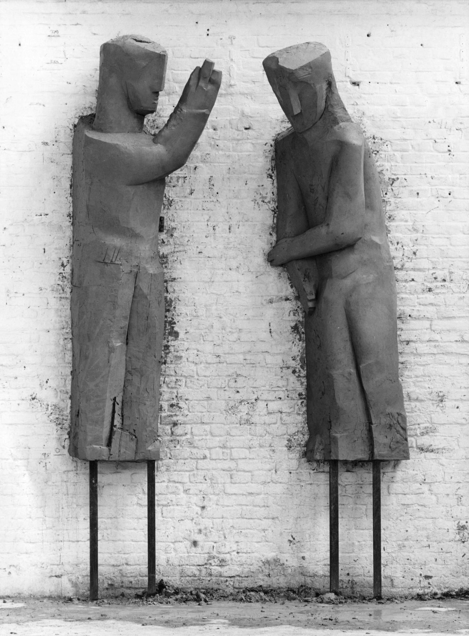 Mit der Intention, den östlichen Zugang zur Gedenkhalle in der Turmruine der Kaiser-Wilhelm-Gedächtniskirche einladender zu gestalten, lobte das Kuratorium der Stiftung „Kaiser-Wilhelm-Gedächtniskirche“ im Frühjahr 1986 einen zweistufigen Wettbewerb zur Fertigung und Anbringung eines Kunstwerks unter den Meisterschülern der Bildhauerklassen der Hochschule der Künste Berlin (HdK), heutige Universität der Künste Berlin, aus. Für den Wettbewerb und die Ausführung des Kunstwerks stellte der Senator für Bau- und Wohnungswesen im Rahmen von „Kunst im Stadtraum“ 150.000 DM zur Verfügung. In der Ausschreibung gab das Kuratorium den gestalterischen Rahmen vor. Demnach reichte die zu bespielende Fläche „von der Oberkante des Sockels bis zur Höhe des ersten Absatzes über den Türöffnungen, die Mitteltür aussparend, über die gesamte Breite des Sockels“. Des Weiteren wurde angeführt, dass die Außengestaltung gegenständlich zu entwickeln sei, nicht zum Klettern einladen dürfe, von Schmierereien leicht zu säubern sei und in der Thematik die Konzeption der Gedenkhalle (Erinnerung an die Zerstörung im zweiten Weltkrieg, verbunden mit der Mahnung, dass es nie wieder Krieg geben darf und dem Aufruf zu Frieden und Versöhnung) aufgreife. Darüber hinaus wurde empfohlen das Kunstwerk flächig oder plastisch aus Metall zu fertigen, sowie die Inschriften zweier Glocken der Kaiser-Wilhelm-Gedächtniskirche, „Eure Städte sind mit Feuer verbrannt, aber das Heil unseres Gottes bleibt ewiglich.“ (Jesaja 1,7) und „Lasset euch versöhnen mit Gott.“ (2. Korinther 5,20), miteinzubeziehen. Für die Teilnahme am Wettbewerb bewarben sich aus den Bildhauerklassen der Fachbereiche 1 und 6 der Hochschule der Künste Berlin (HdK) insgesamt 28 Studierende mit je einem Modell und einer kurzen schriftlichen Erläuterung ihrer Idee. Auf dieser Grundlage entschied sich das neunköpfige Preisgericht, bestehend aus Lehrkräften der Bildhauerklassen der HdK, Politiker_innen und Kirchenvertreter_innen, am 20.05.1987 in zweiter Stufe zwischen 10 Künstler_innen für den Entwurf von Stefan Kaehne, einem Meisterschüler aus der Klasse von Joachim Schmettau. Ausschlaggebend für die Entscheidung war laut Jury, „dass die Figuren in Größe, Grobheit und Massigkeit gut in der Ruinenfassade stehen, dem Charakter der Ruine folgen und eigene Kraft haben. Eine hervorragende Auseinandersetzung mit der Aufgabenstellung: Ruine und Kunst am Bau.“ Stefan Kaehne hatte sich mit zwei ca. 50 cm hohen Modellen aus Gips beworben, die in ihrer Gestik die Thematik der alten Turmruine und Gedenkhalle „Mahnung und Versöhnung“ visualisieren (siehe Abb. 16 und Abb. 17). Sein Arbeitsprozess bestand aus dem Modellieren der Figurenpaare samt Rückwand in Ton, dem Abformen des Tonmodells mit Gips zum Erstellen einer Negativform, die er zur Produktion der fertigen Modelle wiederum mit Gips ausgoss. Für den Transport montierte er die leicht eingefärbten Gipsmodelle auf je eine stabile Holzplatte, um Beschädigungen am Material vorzubeugen. Laut eigener Aussage hatte Hr. Kaehne von Anfang an geplant zwei Figurenpaaren zu entwickeln, da eine solche Komposition dem vorgegeben Raum am stimmigsten entsprach. Nach seinem Empfinden hätten einzelne Figuren links und rechts neben der Mitteltür verloren gewirkt und eine Figur allein zu unausgewogen. Als Gewinner des „Bildhauerwettbewerbs Kaiser-Wilhelm-Gedächtniskirche“ war Kaehne für alle Schritte der Projektplanung verantwortlich. Beratend unterstützt wurde er dabei vom kirchlichen Bauamt, das die Beauftragung statischer Gutachten und die Organisation der Montage übernahm, sowie von seinem Mentor Joachim Schmettau, der den Kontakt zum Steinhändler herstellte. Zur Realisierung seines Kunstwerks entschied sich Kaehne eine Halle in der „Bildhauerwerkstatt des Bundes bildender Künstler“ in Berlin-Wedding anzumieten, in der von Juli 1987 bis März 1988 an den Figurenpaaren gearbeitet wurde. Zur Umsetzung der zwei Paare in Originalgröße nutzte Kaehne zunächst dasselbe Verfahren wie bei seinem Bewerbungsmodell zur Teilnahme am Wettbewerb. An einer Wand der Halle ließ er sich vier Metallgerüste errichten, die in Form und Größe den anzufertigenden Figuren entsprachen. Um sie herum begann er sein Werk in Ton zu modellieren (siehe Abb. 18). Die so entstandenen vier Tonmodelle (siehe Abb. 19 und Abb. 20) dienten ihm zur Abformung von Teilstücken in Gips, die er zu ganzen Gussformen zusammensetzte und mit flüssigem Gips füllte. Nach dem Aushärten des Gipses mussten die Gussformen zerschlagen werden, um die überlebensgroßen Skulpturen entnehmen zu können. Mit dem Anfertigen der Gipsfiguren in Originalgröße war der Werkprozess nicht beendet, denn Kaehne hatte seine erste Idee, die Paare in Beton zu gießen verworfen. Die in sieben Monaten produzierten Gipsmodelle bildeten somit essentielle Vorlage für das Übertragen der Figuren auf Sandstein, den sich Kaehne aus Massangis in Frankreich liefern ließ. Das Material überzeugte auf Grund seiner hohen Festigkeit, Widerstandsfähigkeit und Harmonie mit der alten Turmfassade, bedingte jedoch die Beauftragung der Bildhauerin Konscha Schostak, um den Stein fachmännisch zu bearbeiten. Ihren viermonatigen Arbeitsablauf veranschaulicht Frau Schostak in Text und Bild auf ihrer Website, unter folgendem Link: https://memoria-stein.de/die-bildhauerin/kaiser-wilhelm-gedaechtnis-kirche/. Beendet wurden die Bildhauerarbeiten wiederum von Kaehne selbst, indem er Feinheiten an den Konturen vornahm und seine Signatur (KAEHNE 88) in den Fuß der weiblichen Figur einmeißelte. Am 08.04.1988 wurden die vier Skulpturen aus Sandstein, von denen jede zwischen 1,3 und 2 Tonnen wiegt, mit einem Tieflader von der Bildhauerwerkstatt zur Kaiser-Wilhelm-Gedächtniskirche transportiert. Zur Vorbereitung dieses Vorgangs fertigte Kaehne Schablonen der Umrisse aller vier Figuren an, bohrte in jede der flachen Rückseiten drei Löcher un