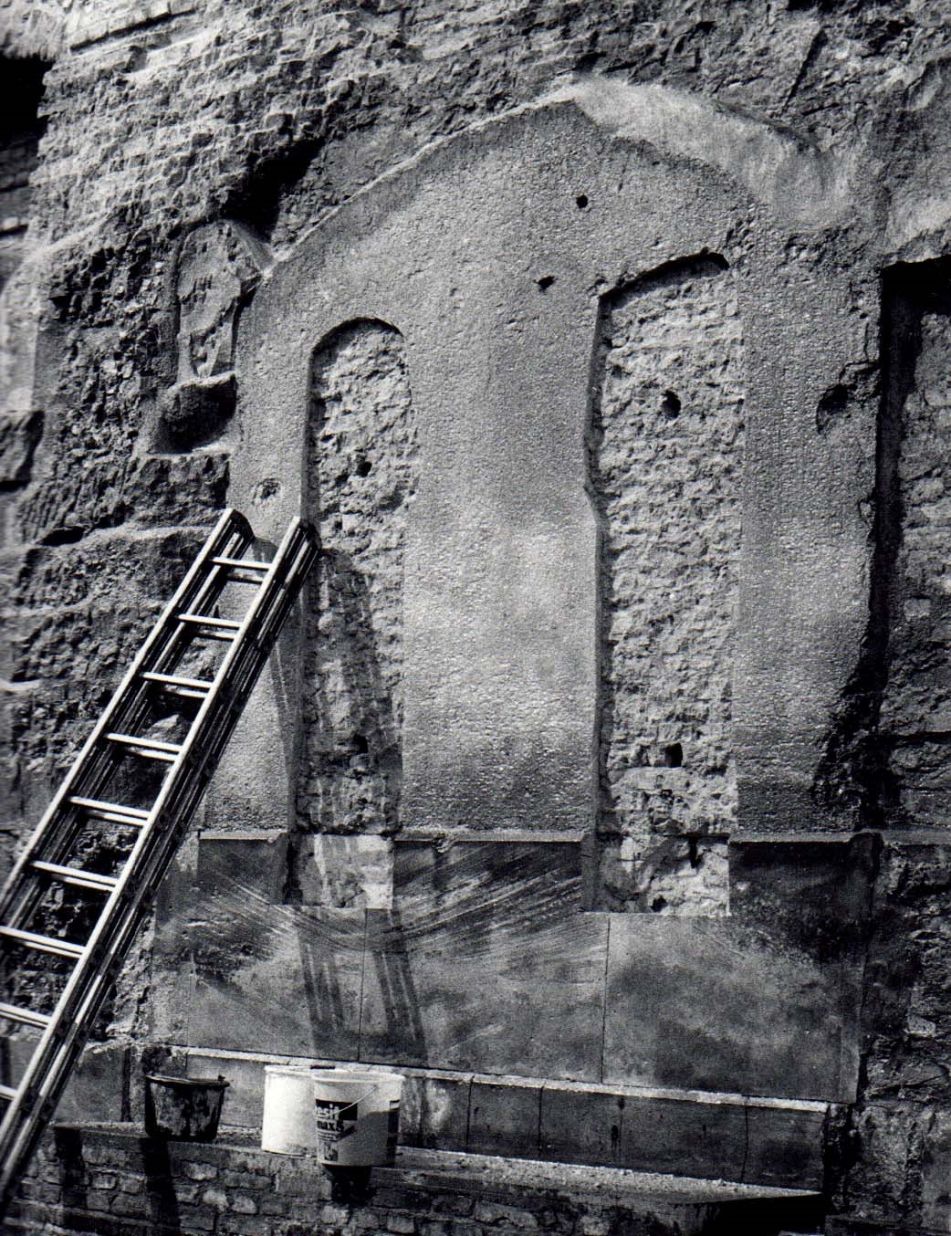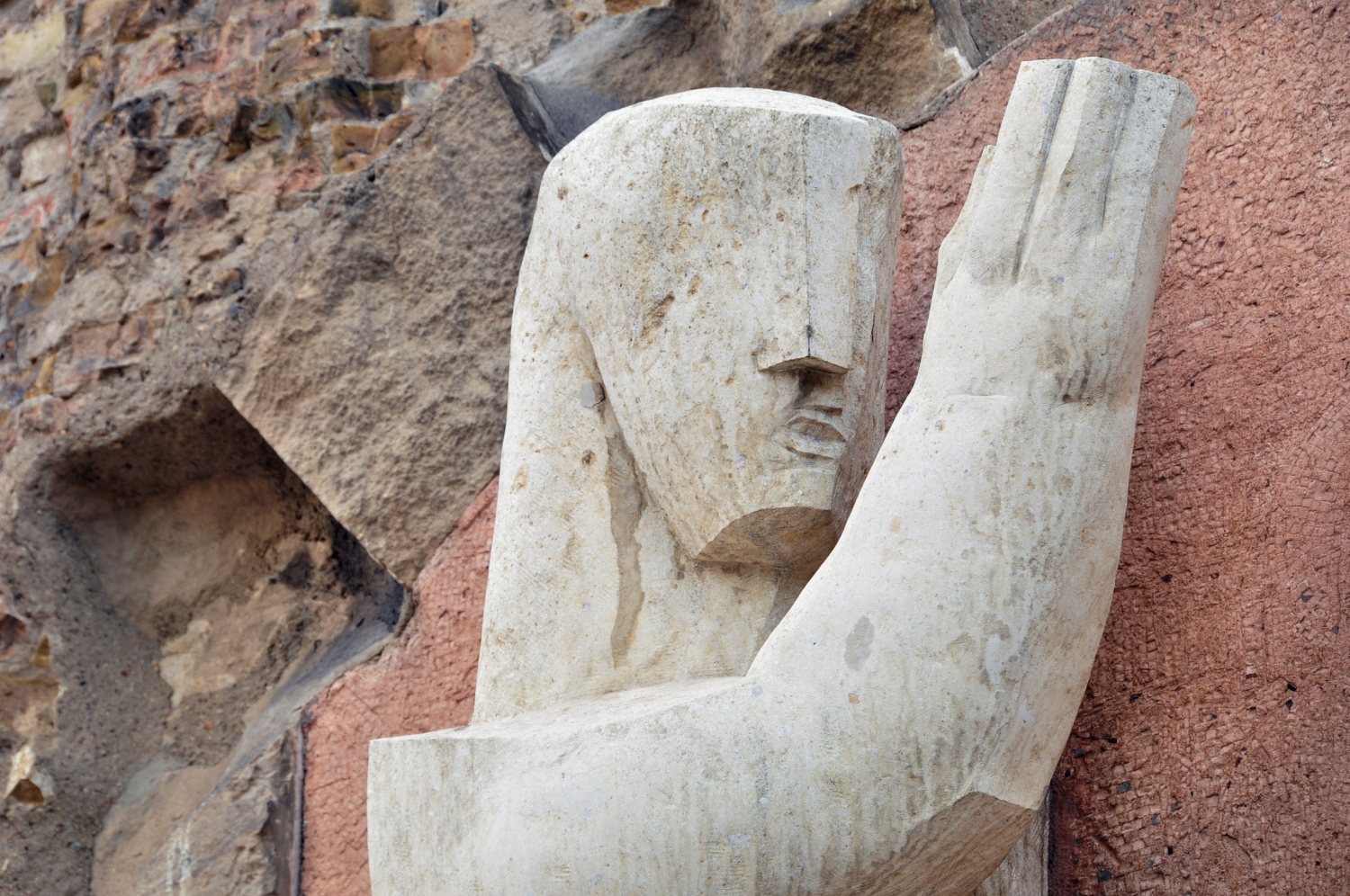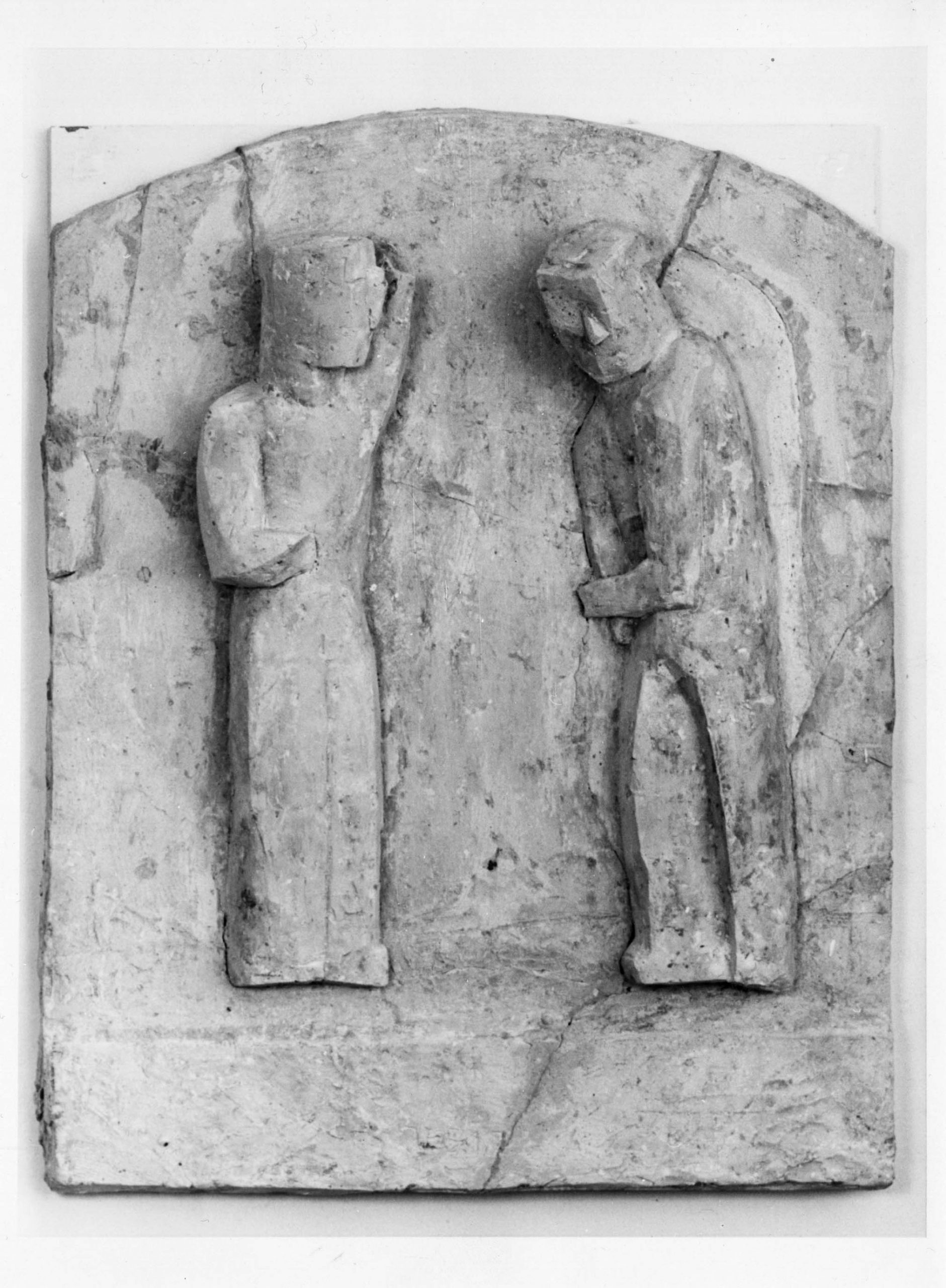 Mit der Intention, den östlichen Zugang zur Gedenkhalle in der Turmruine der Kaiser-Wilhelm-Gedächtniskirche einladender zu gestalten, lobte das Kuratorium der Stiftung „Kaiser-Wilhelm-Gedächtniskirche“ im Frühjahr 1986 einen zweistufigen Wettbewerb zur Fertigung und Anbringung eines Kunstwerks unter den Meisterschülern der Bildhauerklassen der Hochschule der Künste Berlin (HdK), heutige Universität der Künste Berlin, aus. Für den Wettbewerb und die Ausführung des Kunstwerks stellte der Senator für Bau- und Wohnungswesen im Rahmen von „Kunst im Stadtraum“ 150.000 DM zur Verfügung. In der Ausschreibung gab das Kuratorium den gestalterischen Rahmen vor. Demnach reichte die zu bespielende Fläche „von der Oberkante des Sockels bis zur Höhe des ersten Absatzes über den Türöffnungen, die Mitteltür aussparend, über die gesamte Breite des Sockels“. Des Weiteren wurde angeführt, dass die Außengestaltung gegenständlich zu entwickeln sei, nicht zum Klettern einladen dürfe, von Schmierereien leicht zu säubern sei und in der Thematik die Konzeption der Gedenkhalle (Erinnerung an die Zerstörung im zweiten Weltkrieg, verbunden mit der Mahnung, dass es nie wieder Krieg geben darf und dem Aufruf zu Frieden und Versöhnung) aufgreife. Darüber hinaus wurde empfohlen das Kunstwerk flächig oder plastisch aus Metall zu fertigen, sowie die Inschriften zweier Glocken der Kaiser-Wilhelm-Gedächtniskirche, „Eure Städte sind mit Feuer verbrannt, aber das Heil unseres Gottes bleibt ewiglich.“ (Jesaja 1,7) und „Lasset euch versöhnen mit Gott.“ (2. Korinther 5,20), miteinzubeziehen. Für die Teilnahme am Wettbewerb bewarben sich aus den Bildhauerklassen der Fachbereiche 1 und 6 der Hochschule der Künste Berlin (HdK) insgesamt 28 Studierende mit je einem Modell und einer kurzen schriftlichen Erläuterung ihrer Idee. Auf dieser Grundlage entschied sich das neunköpfige Preisgericht, bestehend aus Lehrkräften der Bildhauerklassen der HdK, Politiker_innen und Kirchenvertreter_innen, am 20.05.1987 in zweiter Stufe zwischen 10 Künstler_innen für den Entwurf von Stefan Kaehne, einem Meisterschüler aus der Klasse von Joachim Schmettau. Ausschlaggebend für die Entscheidung war laut Jury, „dass die Figuren in Größe, Grobheit und Massigkeit gut in der Ruinenfassade stehen, dem Charakter der Ruine folgen und eigene Kraft haben. Eine hervorragende Auseinandersetzung mit der Aufgabenstellung: Ruine und Kunst am Bau.“ Stefan Kaehne hatte sich mit zwei ca. 50 cm hohen Modellen aus Gips beworben, die in ihrer Gestik die Thematik der alten Turmruine und Gedenkhalle „Mahnung und Versöhnung“ visualisieren (siehe Abb. 16 und Abb. 17). Sein Arbeitsprozess bestand aus dem Modellieren der Figurenpaare samt Rückwand in Ton, dem Abformen des Tonmodells mit Gips zum Erstellen einer Negativform, die er zur Produktion der fertigen Modelle wiederum mit Gips ausgoss. Für den Transport montierte er die leicht eingefärbten Gipsmodelle auf je eine stabile Holzplatte, um Beschädigungen am Material vorzubeugen. Laut eigener Aussage hatte Hr. Kaehne von Anfang an geplant zwei Figurenpaaren zu entwickeln, da eine solche Komposition dem vorgegeben Raum am stimmigsten entsprach. Nach seinem Empfinden hätten einzelne Figuren links und rechts neben der Mitteltür verloren gewirkt und eine Figur allein zu unausgewogen. Als Gewinner des „Bildhauerwettbewerbs Kaiser-Wilhelm-Gedächtniskirche“ war Kaehne für alle Schritte der Projektplanung verantwortlich. Beratend unterstützt wurde er dabei vom kirchlichen Bauamt, das die Beauftragung statischer Gutachten und die Organisation der Montage übernahm, sowie von seinem Mentor Joachim Schmettau, der den Kontakt zum Steinhändler herstellte. Zur Realisierung seines Kunstwerks entschied sich Kaehne eine Halle in der „Bildhauerwerkstatt des Bundes bildender Künstler“ in Berlin-Wedding anzumieten, in der von Juli 1987 bis März 1988 an den Figurenpaaren gearbeitet wurde. Zur Umsetzung der zwei Paare in Originalgröße nutzte Kaehne zunächst dasselbe Verfahren wie bei seinem Bewerbungsmodell zur Teilnahme am Wettbewerb. An einer Wand der Halle ließ er sich vier Metallgerüste errichten, die in Form und Größe den anzufertigenden Figuren entsprachen. Um sie herum begann er sein Werk in Ton zu modellieren (siehe Abb. 18). Die so entstandenen vier Tonmodelle (siehe Abb. 19 und Abb. 20) dienten ihm zur Abformung von Teilstücken in Gips, die er zu ganzen Gussformen zusammensetzte und mit flüssigem Gips füllte. Nach dem Aushärten des Gipses mussten die Gussformen zerschlagen werden, um die überlebensgroßen Skulpturen entnehmen zu können. Mit dem Anfertigen der Gipsfiguren in Originalgröße war der Werkprozess nicht beendet, denn Kaehne hatte seine erste Idee, die Paare in Beton zu gießen verworfen. Die in sieben Monaten produzierten Gipsmodelle bildeten somit essentielle Vorlage für das Übertragen der Figuren auf Sandstein, den sich Kaehne aus Massangis in Frankreich liefern ließ. Das Material überzeugte auf Grund seiner hohen Festigkeit, Widerstandsfähigkeit und Harmonie mit der alten Turmfassade, bedingte jedoch die Beauftragung der Bildhauerin Konscha Schostak, um den Stein fachmännisch zu bearbeiten. Ihren viermonatigen Arbeitsablauf veranschaulicht Frau Schostak in Text und Bild auf ihrer Website, unter folgendem Link: https://memoria-stein.de/die-bildhauerin/kaiser-wilhelm-gedaechtnis-kirche/. Beendet wurden die Bildhauerarbeiten wiederum von Kaehne selbst, indem er Feinheiten an den Konturen vornahm und seine Signatur (KAEHNE 88) in den Fuß der weiblichen Figur einmeißelte. Am 08.04.1988 wurden die vier Skulpturen aus Sandstein, von denen jede zwischen 1,3 und 2 Tonnen wiegt, mit einem Tieflader von der Bildhauerwerkstatt zur Kaiser-Wilhelm-Gedächtniskirche transportiert. Zur Vorbereitung dieses Vorgangs fertigte Kaehne Schablonen der Umrisse aller vier Figuren an, bohrte in jede der flachen Rückseiten drei Löcher un