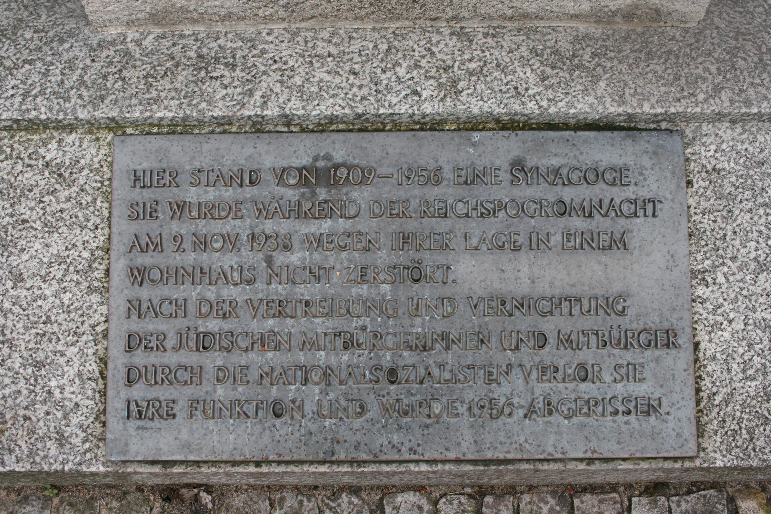 »HIER STAND VON 1909-1956 EINE SYNAGOGE. / SIE WURDE WÄHREND DER REICHSPROGROMNACHT / AM 9. NOV. 1938 WEGEN IHRER LAGE IN EINEM / WOHNHAUS NICHT ZERSTÖRT. / NACH DER VERTREIBUNG UND VERNICHTUNG / DER JÜDISCHEN MITBÜRGERINNEN UND / MITBÜRGER / DURCH DIE NATIONALSOZIALISTEN VERLOR SIE / IHRE FUNKTION UND WURDE 1956 ABGERISSEN.«