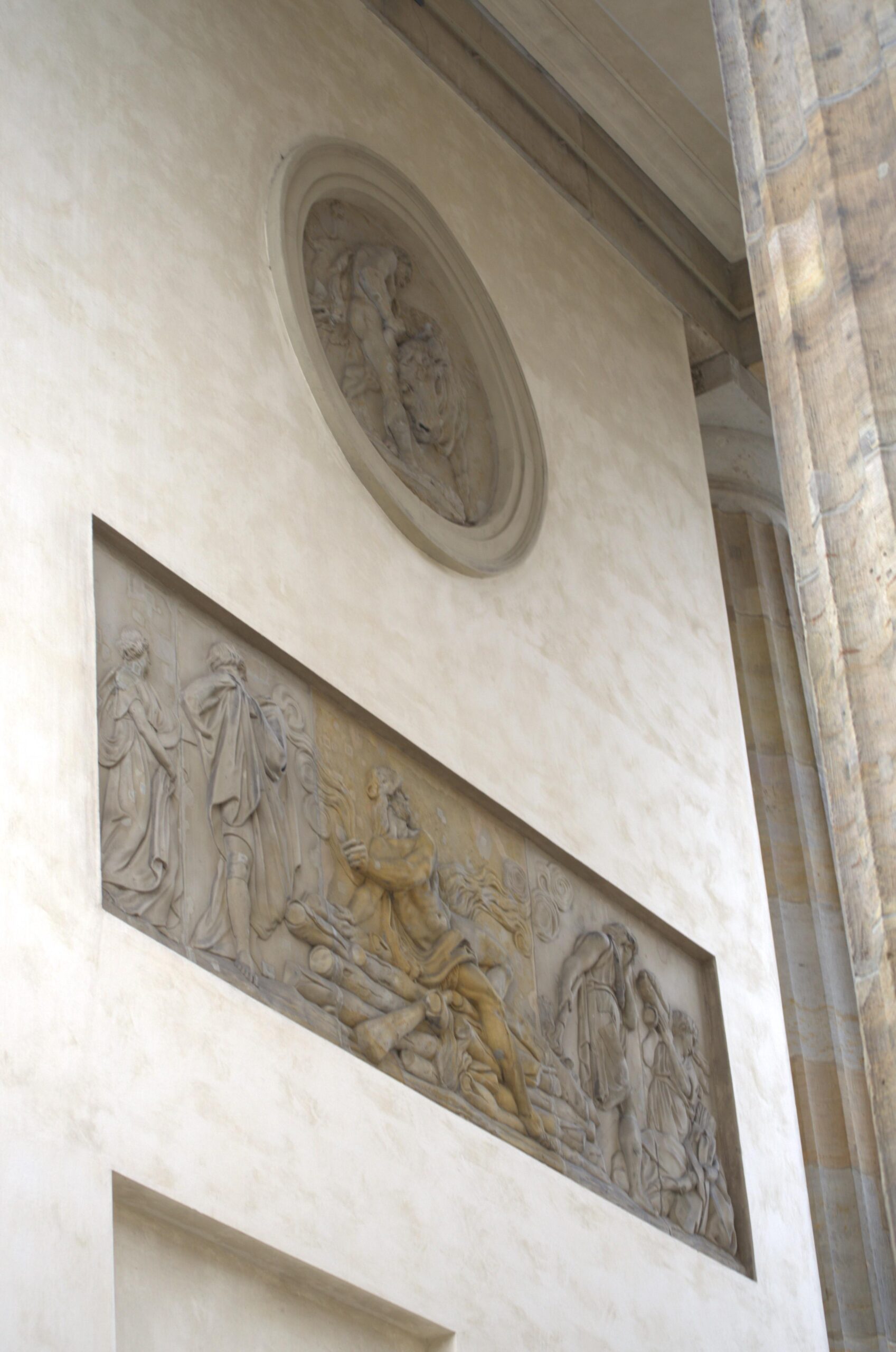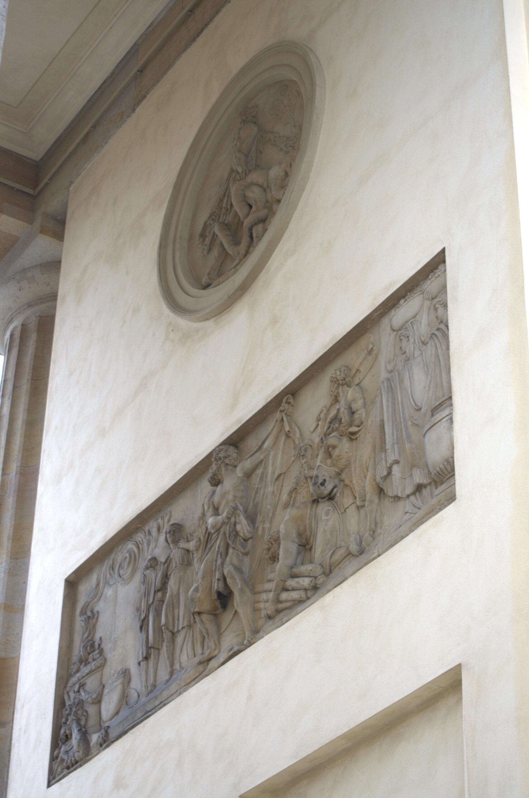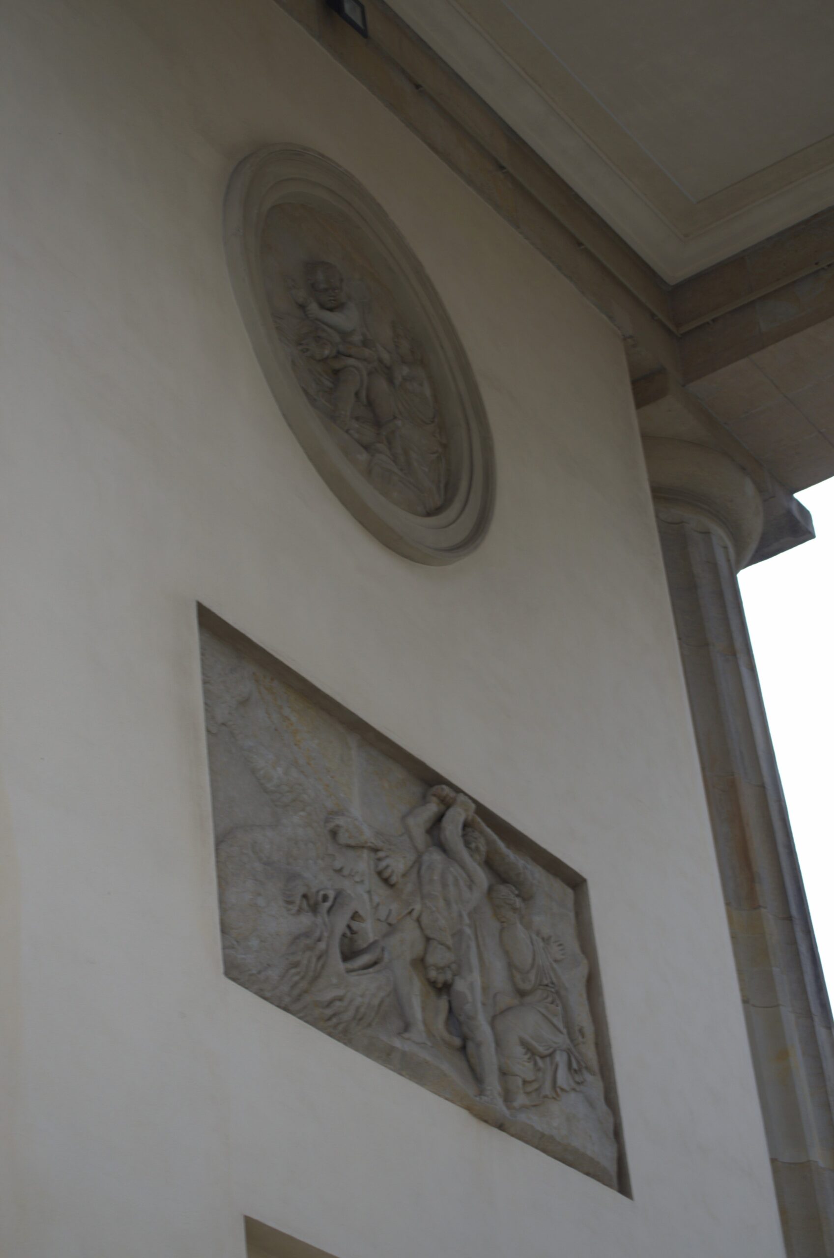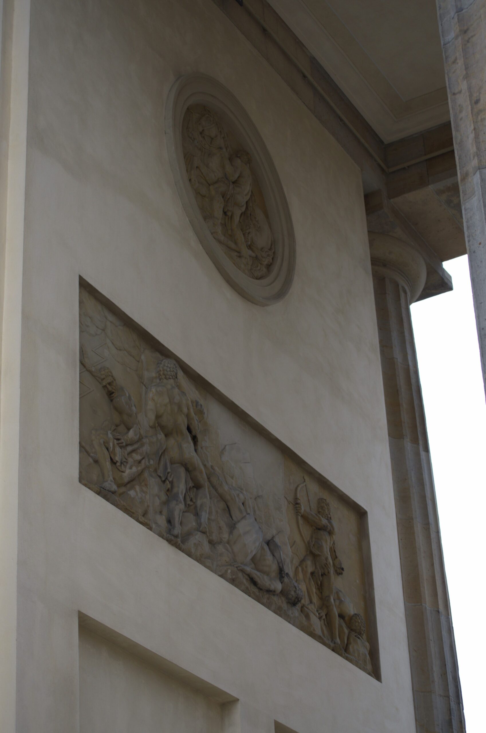 Die Reliefs und Medaillons entstanden nach Entwürfen von Bernhard Rode und wurden von einigen Bildhauern unter Schadows Leitung ausgeführt. Es wurde gemeinsam mit der Fertigstellung des Brandenburger Tors im Jahr 1791 enthüllt. Dabei wurden die Entwürfe und Ausfertigungen des bauplastischen Schmuckes erst im Sommer 1791, kurz vor Eröffnung des Brandenburger Tors, in Auftrag gegeben. “Der Skulpturenschmuck der fünf Durchgänge war nicht von Anfang an vorgesehen. Die Reliefs fügen sich auch nicht konsequent in das Gesamtkonzept der Architektur von Langhans ein. [...] Schadow sprach dies bereits mit seiner Bemerkung an. Schließlich steht der Gedanke, die Passagen des Tores mit einem Bilderzyklus auszustatten, in gewissem Widerspruch zum »griechischen Stil« des Bauwerks, ist doch diese Form des Bilderzyklus' der römischen Triumphbogenarchitektur entlehnt.” (Arenhövel, 1991, S. 116) (Pauline Ahrens)