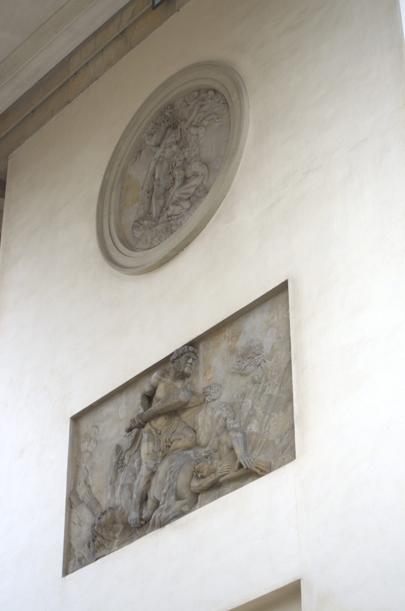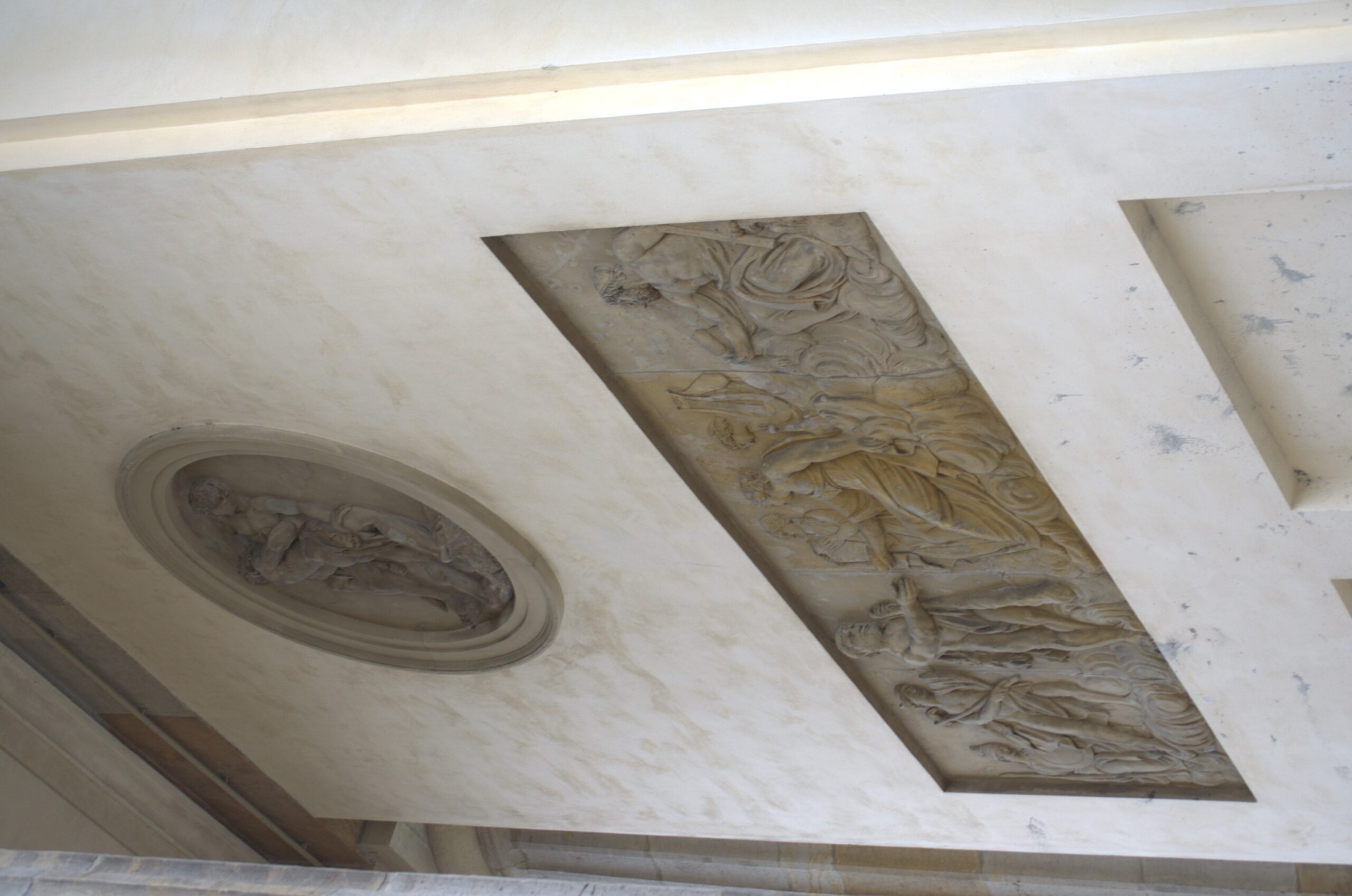 Insgesamt sind in den Durchgängen 20 halbplastisch gearbeitete Herakles-Darstellungen zu finden: davon 10 Medaillons beziehungsweise Tonden und 10 rechteckige Reliefdarstellungen. Dabei befindet sich jeweils ein Medaillon über einem großen, rechteckigen Bildfeld. Die Reliefs in der mittleren Durchfahrt sind etwas kleiner als die entsprechenden Felder der übrigen vier Durchfahrten (Vgl. Arenhövel, 1991, S. 113).