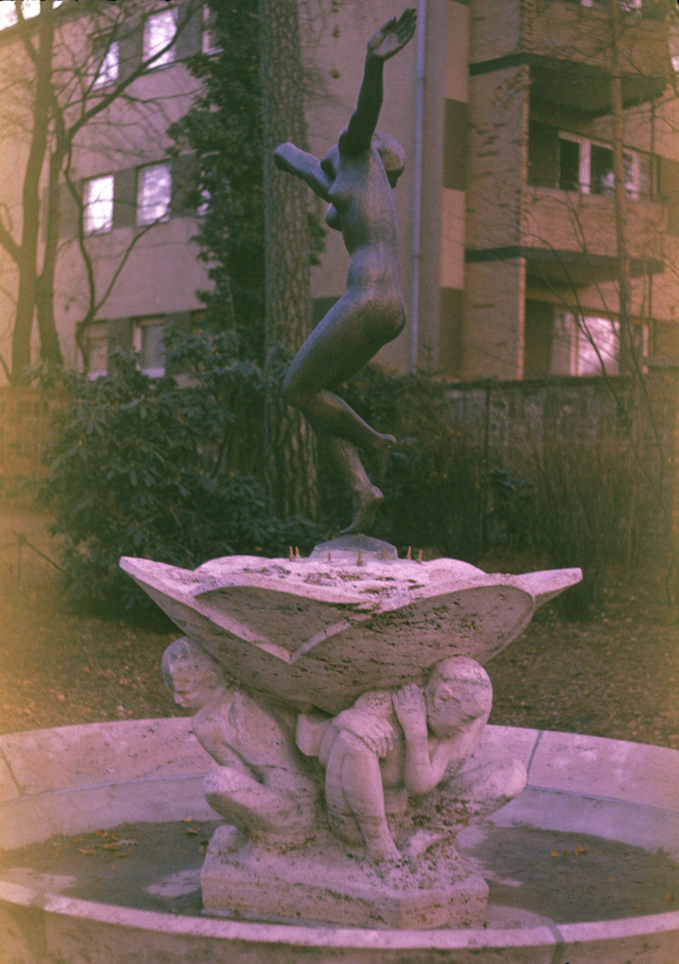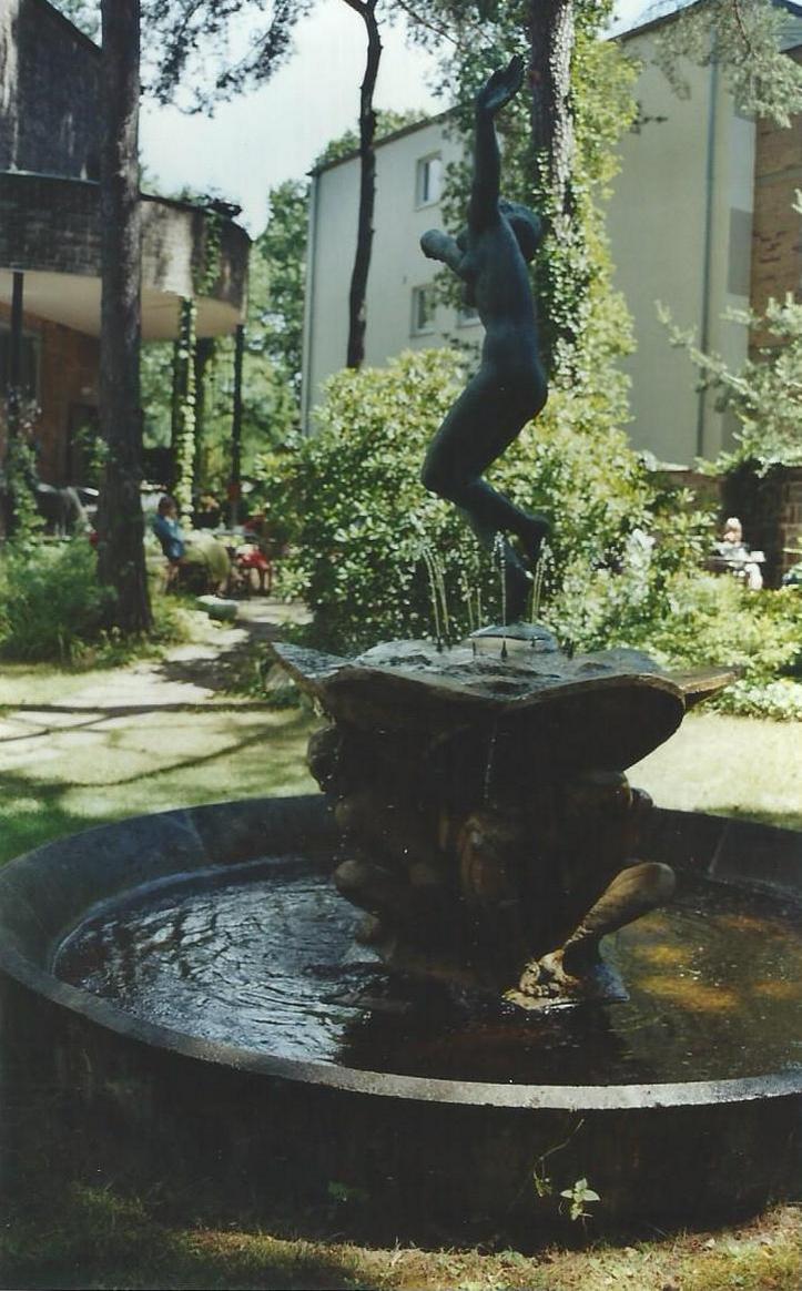 Den Tänzerinnen-Brunnen schuf Kolbe 1922 für Heinrich Stahl (1868-1942), Leiter der Auslandsabteilung der Victoria-Versicherung, Kunstsammler und Freund Max Liebermanns. Der Brunnen kam zunächst vor der von Paul Baumgarten für Stahl erbauten Villa in Dahlem zur Aufstellung. Paul Baumgarten (1873-1953) – Schwiegersohn des Bildhauers Louis Tuaillon - war Meisterschüler Alfred Messels und auch Erbauer der Villa Liebermann am Wannsee. Heinrich Stahl war von 1933 bis 1940 Vorsitzender der jüdischen Gemeinde, er starb 1942 wenige Monate nach seiner Deportation im NS-Ghetto Theresienstadt. Die Villa wurde 1942 von einem bulgarischen Diplomaten erworben und nach dem Krieg abgerissen. Die Straße, in der sich die Villa befand, ist der heutige Heinrich-Stahl-Weg. 1979 wurde der Brunnen im Garten des Georg-Kolbe-Museums an seinem jetzigen - gut ausgewählten - Standort aufgestellt (Susanne Kähler).