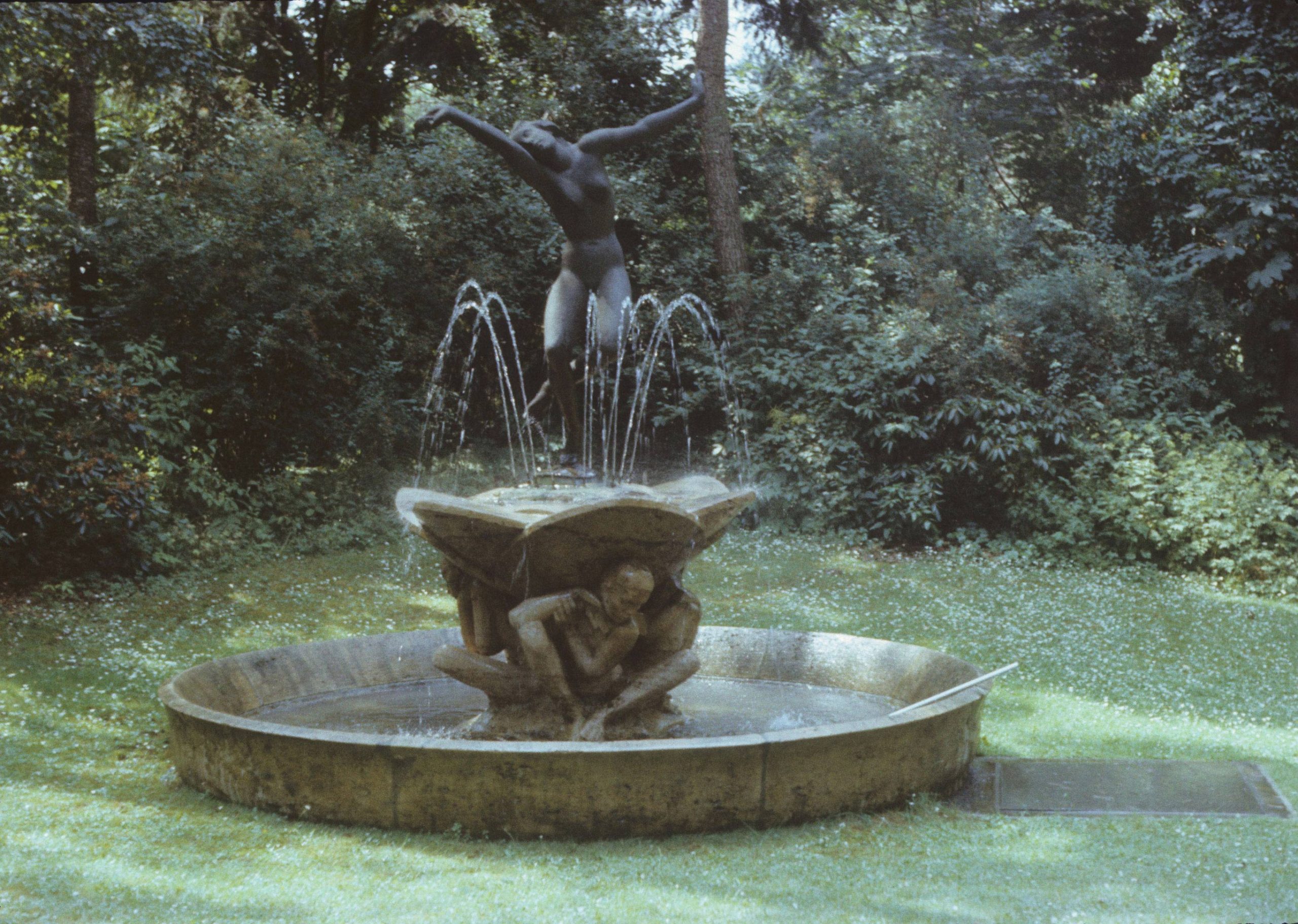 Im hinteren, d. h. südlichen Teil des Hausgartens, inmitten der Rasenfläche ist der Tänzerin-Brunnen Kolbes als wichtigster Blickfang der Gartengestaltung platziert. Im Zentrum des runden Beckens aus Muschelkalk steht als Sockel für die Bronzefigur der Tänzerin die aus Muschelkalk gearbeitete Skulpturengruppe dreier hockender weiblicher Figuren, auf deren Schultern ein blütenförmiger Kranz aufliegt, aus dem das Wasser spritzt und auf dem die Tänzerin montiert ist. Diese weibliche Aktfigur ist in expressiver Bewegung dargestellt, sie streckt beide Arme seitlich vom Körper, hat den Oberkörper gedreht und den Kopf geneigt, sie steht auf den Zehenspitzen ihres rechten Fußes, während das linke Bein angewinkelt ist (Susanne Kähler).