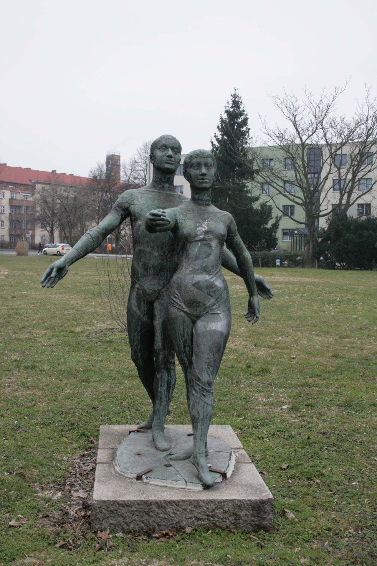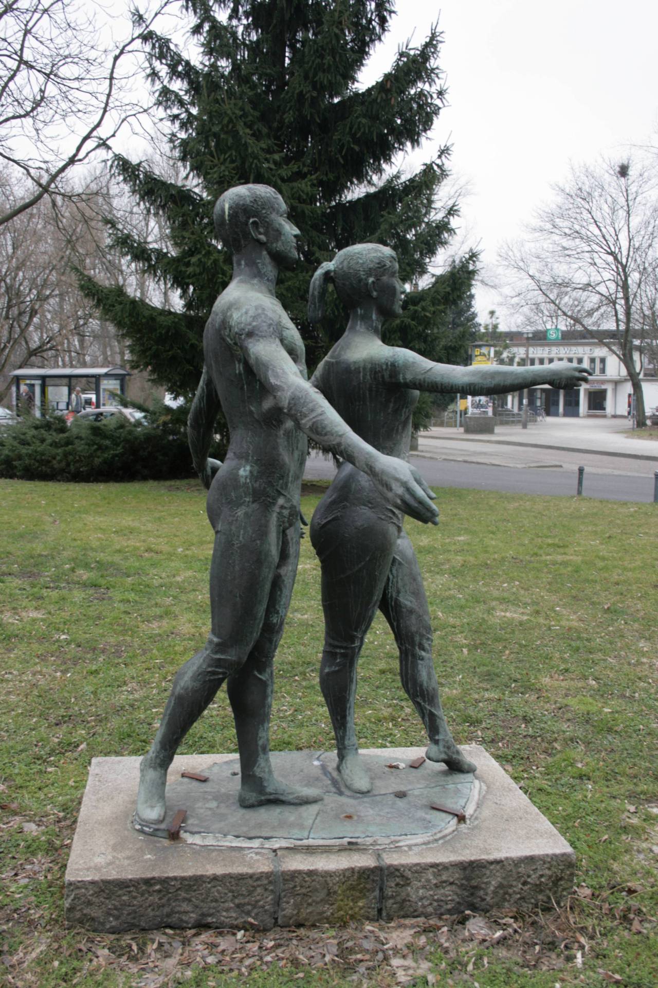 Auf einem recht flachen Sockel mit Granitplatten ist mittels verdeckter Schrauben und groben Eisenklammern eine Plastik verankert, deren Plinthe zeigt, dass sie aus vier Segmenten geschweißt wurde. Die darauf stehende, zwei Meter hohe Bronzegruppe zeigt ein in einer Tanzposition verharrendes Paar, junger Mann und junge Frau, im Tanztrikot und Ballettschuhen. Die Kleidung liegt sehr eng am Körper an und lässt den idealen, geschlechtsspezifischen Körperbau der beiden erkennen (Jörg Kuhn, Susanne Kähler).