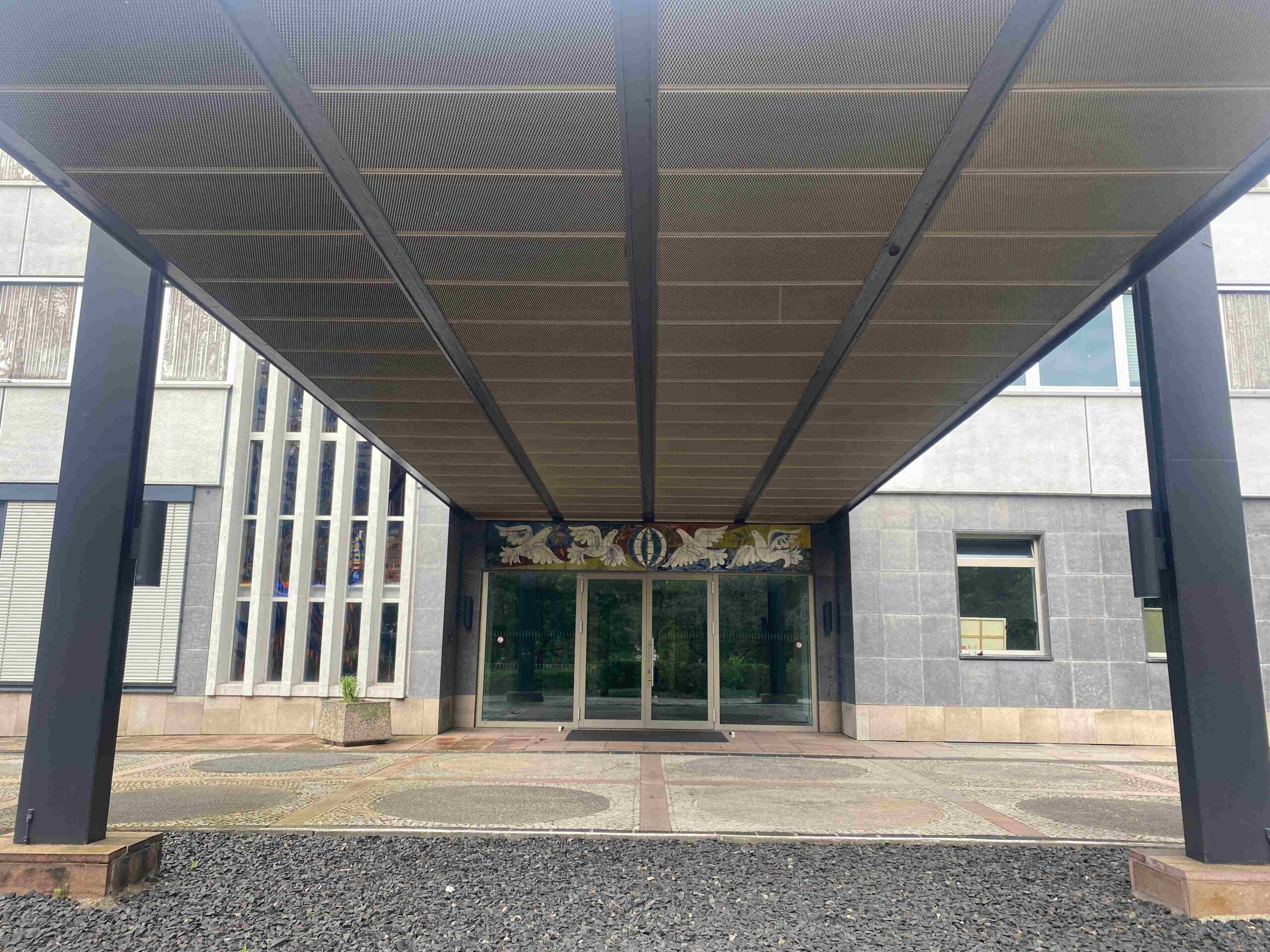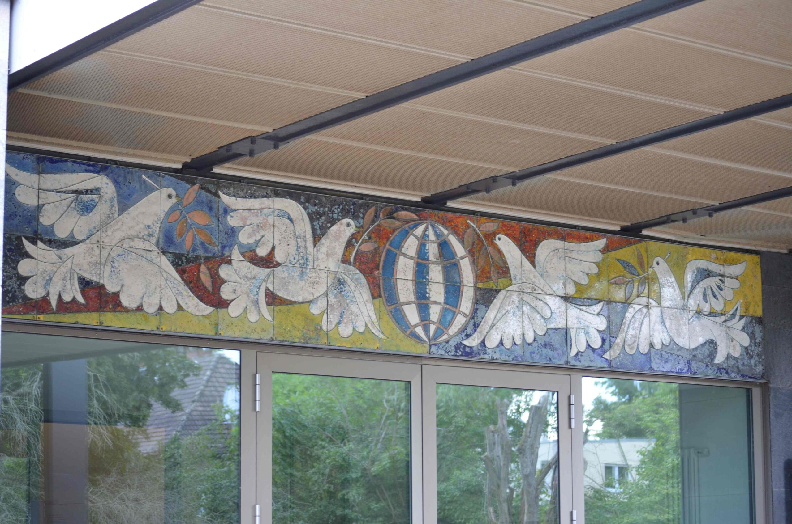 Keramisches Wandbild als Portalgestaltung, bestehend aus 32 bunt gestalteten und glasierten Keramikplatten. Das Motiv zeigt vier symbolische weiße (Friedens-) Tauben mit vermutlich Lorbeerästen in den Schnäbeln, welche sich zur Mitte hin bewegen. Mittig in der Gestaltung ist eine abstrahierte Weltkugel dargestellt. Sie wird von den Taubendarstellungen umrahmt. Der Hintergrund ist in den Farben blau, gelb und orange-rot gehalten. Alle Farben sind dabei klar von einander getrennt (Pauline Ahrens).