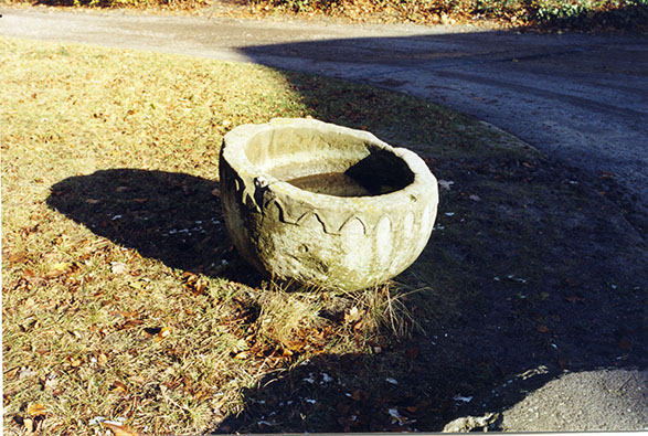 Zwei Teile – Sockel und Becken – eines steinernen Bildwerkes. Bei dem mit gotischem oder gotisierendem Dekor versehenen Kunstwerk handelt es sich nach Auskunft der Denkmälerkartei des Natur- und Grünflächenamtes Steglitz-Zehlendorf um einen aus zwei Teilen bestehenden Taufstein.