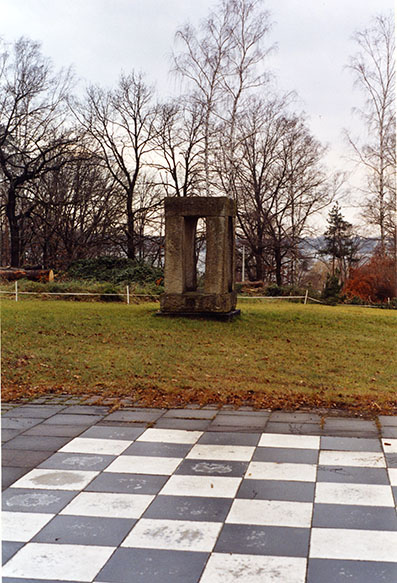 Vermutl. „Rest“ des ursprünglich 7 Werke umfassen den Bildhauer-Symposions „Wasserlinie“ von 1988/89. Das Werk stammt entweder von Michael Schoenholtz oder von Werner Stötzer, die beide am Symposion mit Sandsteinskulpturen beteiligt waren und im Bereich der Schach-Wiese und des Hauptgebäudes ihre Arbeiten platzieren konnten. Die Werke der anderen beteiligten Künstler (Lenassi, Ammann, Haug, Fujiwara, Paszekiewicz) sind nach 1995 wieder abgebaut worden (Jörg Kuhn).