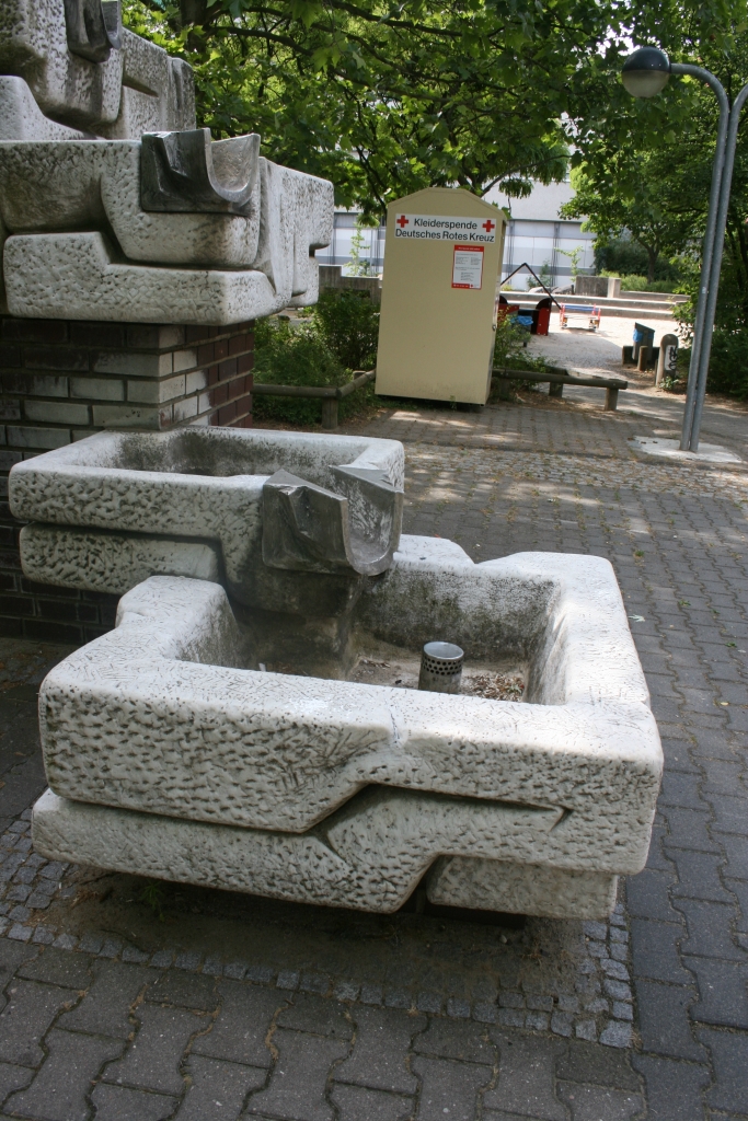 Aus Mauerwerk, Muschelkalk und Metall zusammengefügt. Auf einer rechteckigen Fläche, deren Betonknochensteinpflaster von einem Rahmen aus grauen granitenen Quaderpflastersteinen eingefasst wird, steht die vielgliederige Brunnenarchitektur aus hart gebranntem Klinkerstein. Die Farbe ist bläulich-violett, die Fugen hellfarben. Die Klinkerarchitektur birgt bei terrassenförmiger Gesamtgestalt verschiedene Marmorbecken auf unterschiedlichen Ebenen. Die Außenwände der Becken, soweit sie sichtbar sind, zeigen ein Relief mit abstrakten Formen. Die aufeinander bezogenen Ausflüsse sind bei den Becken entweder an den Ecken oder dazu leicht nach innen zur Mitte hin versetzt eingetieft. Die Ausflüsse sind aus grauem Aluminium gegossen. In einigen Becken befinden sich metallene Wasserdüsen. Die Zugangstüre zur Brunnentechnik befindet sich auf der Nordseite des Hauptpfeilers. Der Brunnen ist am östlichsten Wasserbecken, Nordseite, rechts, vertieft bezeichnet (Jörg Kuhn).