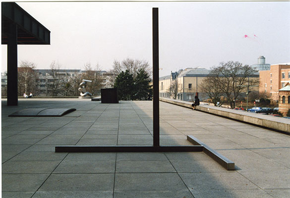 Das Kunstwerk besteht aus drei rechtwinklig zueinander stehenden und miteinander verbundenen massiven Vierkantstahlstäben, die die drei Dimensionen erfassen. Die Plastik kann auch formal als aus zwei miteinander verbundene T-Formen gefügt gesehen werden. Lechner verwendete rostfreien Stahl (Susanne Kähler).