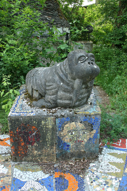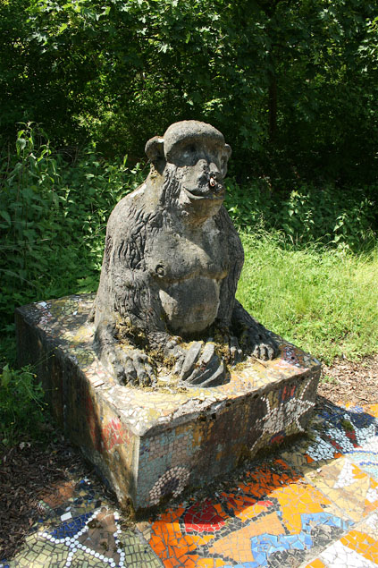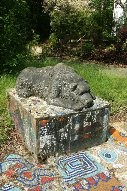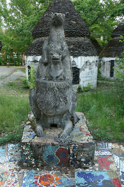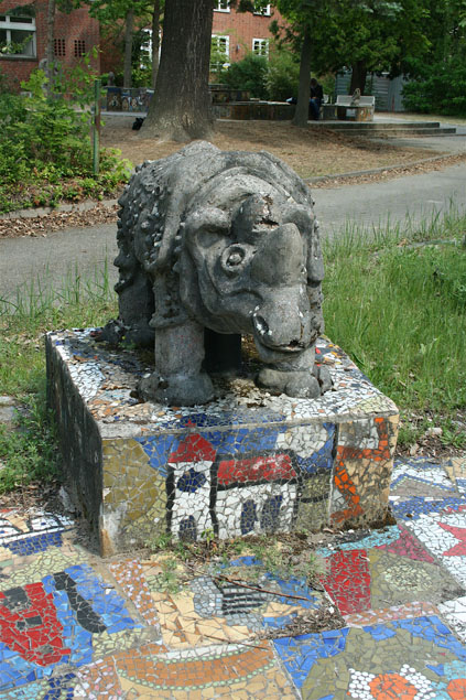 Der „Tiergartenbrunnen“ ist innerhalb eines gartenähnlichen Außengeländes südöstlich des Schulgebäudes der Wiesengrundschule angelegt. „Um einen mit Mosaiken ausgelegten runden Platz – in seiner Mitte ruht ein Findling – sind sieben, mit bunten Mosaiksteinen belegten Sockel im Kreis aufgestellt, auf denen phantasievolle Tierfiguren aus Kunststein einen Wasserstrahl zur Mitte der Anlage richten. Der Brunnen ist als Spielanlage gedacht.“ (Ugowski, 1993, S. 68.) (Jürgen Tomisch, Barbara Anna Lutz).