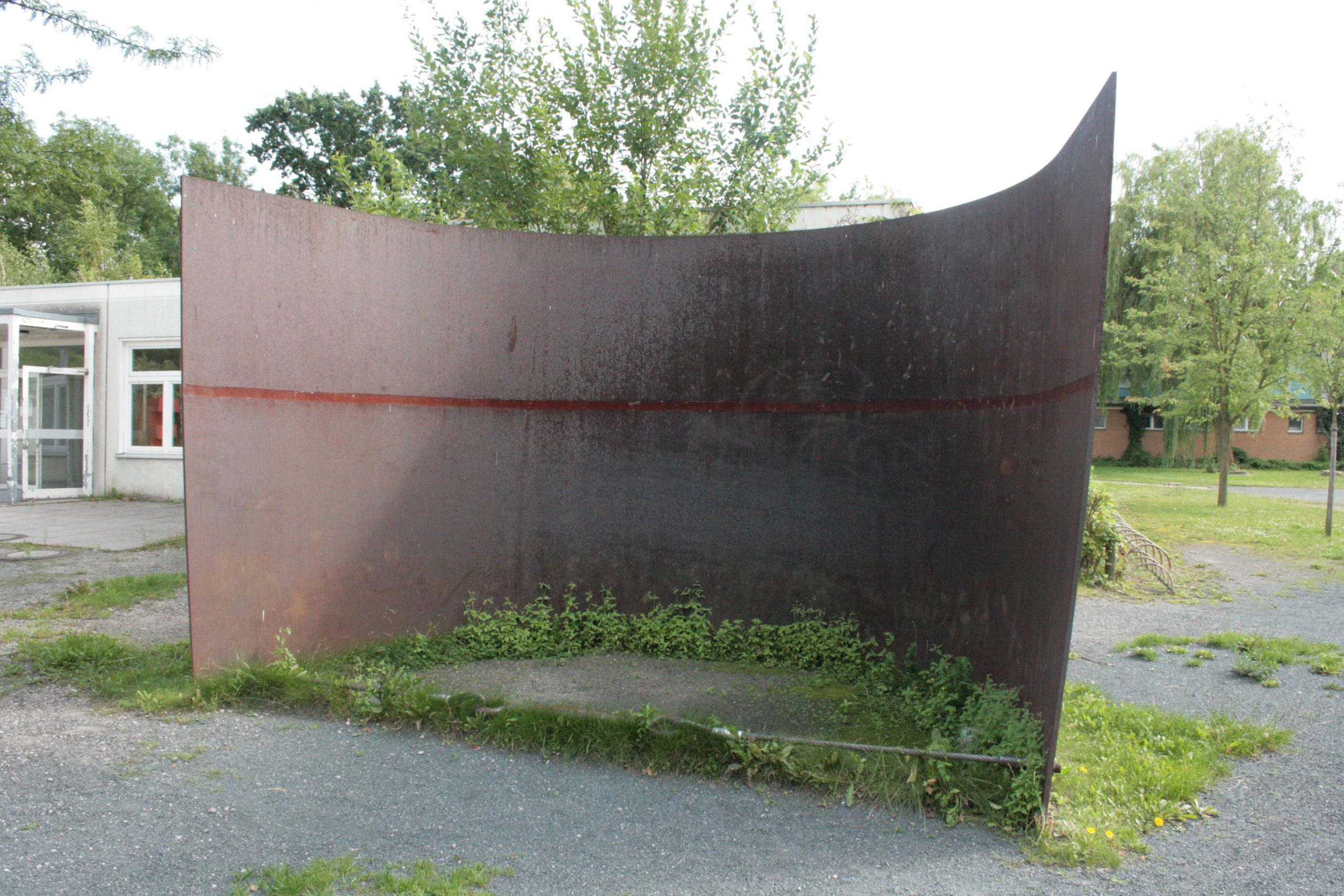 Die Skulptur besteht aus einer monumentalen CorTen-Stahlwand, die in ein Halbrund gebogen ist, wobei kein gleichmäßiges oberes und unteres Rund entstanden ist, was ebenso beabsichtigt war, wie die gleichmäßige Oberflächenkorrosion. Die Stahlwand wird an ihrer zum Hof offenen Seite durch ein straff gespanntes, in der Wand mit Ösen verankertes Stahlseil zusammen gehalten. Die titelstiftende „Zeitlinie“ ist eine in den CorTen-Stahl gefräste Furche, die im Laufe der Zeit wieder zurostet. Nach etwa 15 Jahren muss sie wieder geöffnet werden, um den Prozess der Vergänglichkeit wieder zu veranschaulichen. Die Figur ist der Lebendabguss eines Modells (Susanne Kähler, Jörg Kuhn).