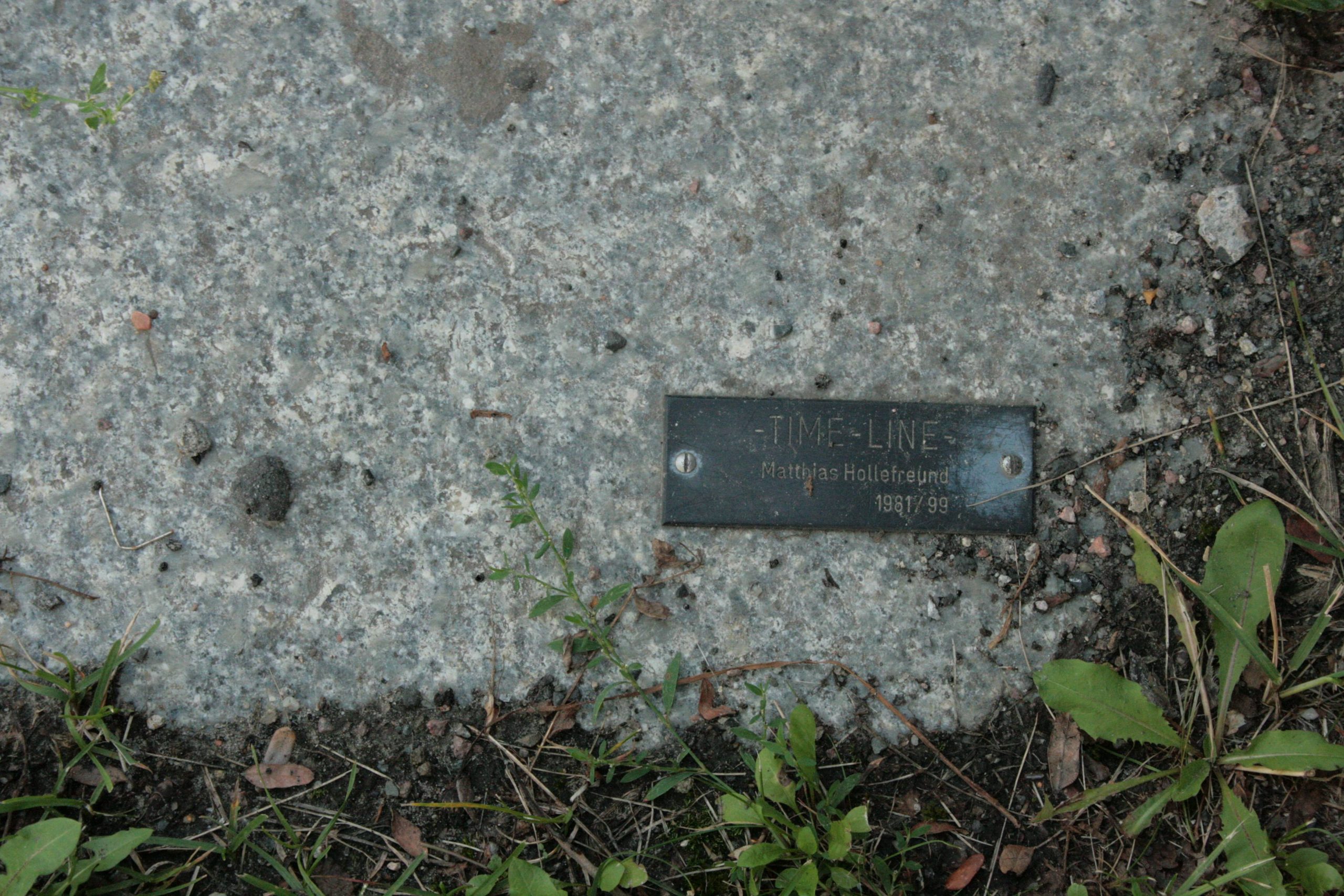 Hollefreund schuf das Werk "Time Line" im Zusammenhang mit einem Wettbewerb, der aus dem "Sammeltopf", der Haushaltsstelle "Kunst im Stadtraum" des Senats, gefördert wurde. Das Werk befand sich zuerst im Skulpturengarten am Funkturm, Messedamm 22 am Rande des Sommergartens. Die Skulptur wurde 1981 von dem Berliner Künstler Mathias Hollefreund geschaffen. Später wurde sie an ihren jetzigen Standort übertragen. 1999 war die aus Glasfaser gegossene Sitzfigur so stark in Mitleidenschaft gezogen, dass Hollefreund die Figur überarbeiten musste. Aus dieser Zeit dürfte ihre farbige Fassung herrühren. Da die Figur zudem durch die direkte Anlehnung an die Stahlwand der Skulptur Schaden genommen hatte, wurde sie vom Künstler ein Stück abgerückt und neu postiert. Vor der Fassade des Schulgebäudes hinter der Skulptur ist eine weitere Inschriftentafel mit Angaben zum Kunstwerk zu finden: Mattis (sic!) Hollefreund/Time Line. (Susanne Kähler).