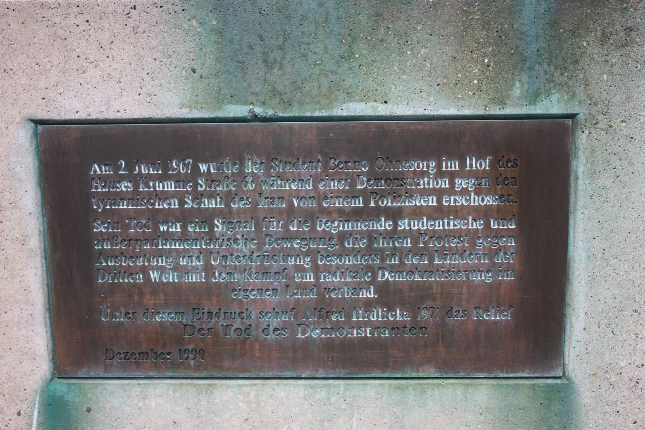 »Am 2. Juni 1967 wurde der Student Benno Ohnesorg im Hof des Hauses Krumme Straße 66 während einer Demonstration gegen den tyrannischen Schah des Iran von einem Polizisten erschossen. Sein Tod war ein Signal für die beginnende studentische und außerparlamentarische Bewegung, die ihren Protest gegen Ausbeutung und Unterdrückung besonders in den Ländern der Dritten Welt mit dem Kampf um radikale Demokratisierung im eigenen Land verband. Unter diesem Eindruck schuf Adolf Hrdlicka 1971 das Relief Der Tod des Demonstranten, Dezember 1990«