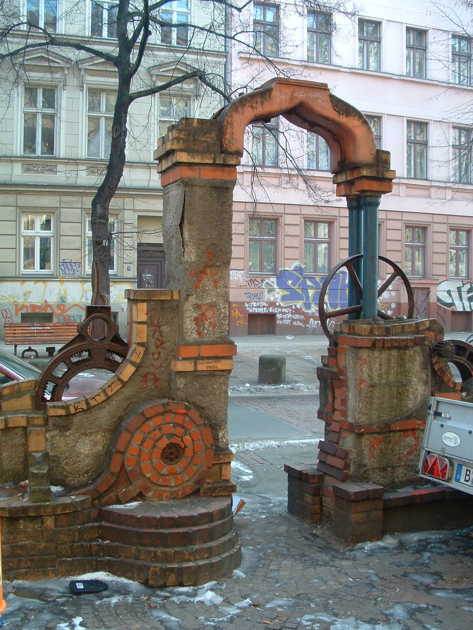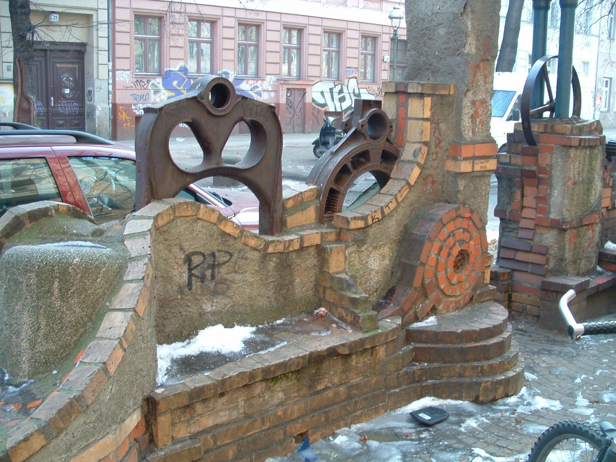Die Skulptur entstand unter künstlerischer Anleitung als Anwohnerprojekt. 1987 durch einen schlichten runden Granitbrunnen auf der gegenüberliegenden Straßenseite ergänzt. Hinzuweisen ist auch auf eine 1987 von Robert Schmidt gestaltete Gedenktafel für den Widerstandskämpfer Willi Sänger, ein Keramikobjekt, angebracht an der Fassade vom Haus Oppelner Straße 45 oberhalb des Hauseinganges.