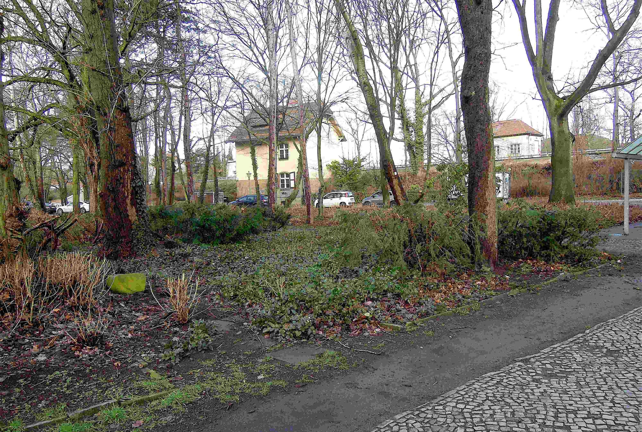 Vom Hauptweg führt ein kleiner Abzweig mit 5 quadratischen Schrittplatten zu der im Grün liegenden Tränke mit der Skulptur eines Wasservogels. Der am Rand des ca. 3,20 m x 3,10 m großen Beckens sitzende mit reduzierter Formensprache dargestellte Vogel, möglicherweise ein Schwan, hat seinen Kopf stark nach vorn geneigt und wohl ins Gefieder gesteckt. Der Umriss des Beckens ist nicht im Ganzen erkennbar, da von der Einfassung nur einzelne Steine sichtbar sind, dem Anschein nach wurde es u-förmig angelegt. Auf einer historischen Aufnahme (s. Abb.) ist zu sehen, dass der muldenförmig angelegte Boden des Beckens mit Kleinpflaster ausgelegt ist. Die Einfassung besteht aus quaderförmig behauenen Natursteinen (Jürgen Tomisch, Barbara Anna Lutz).
