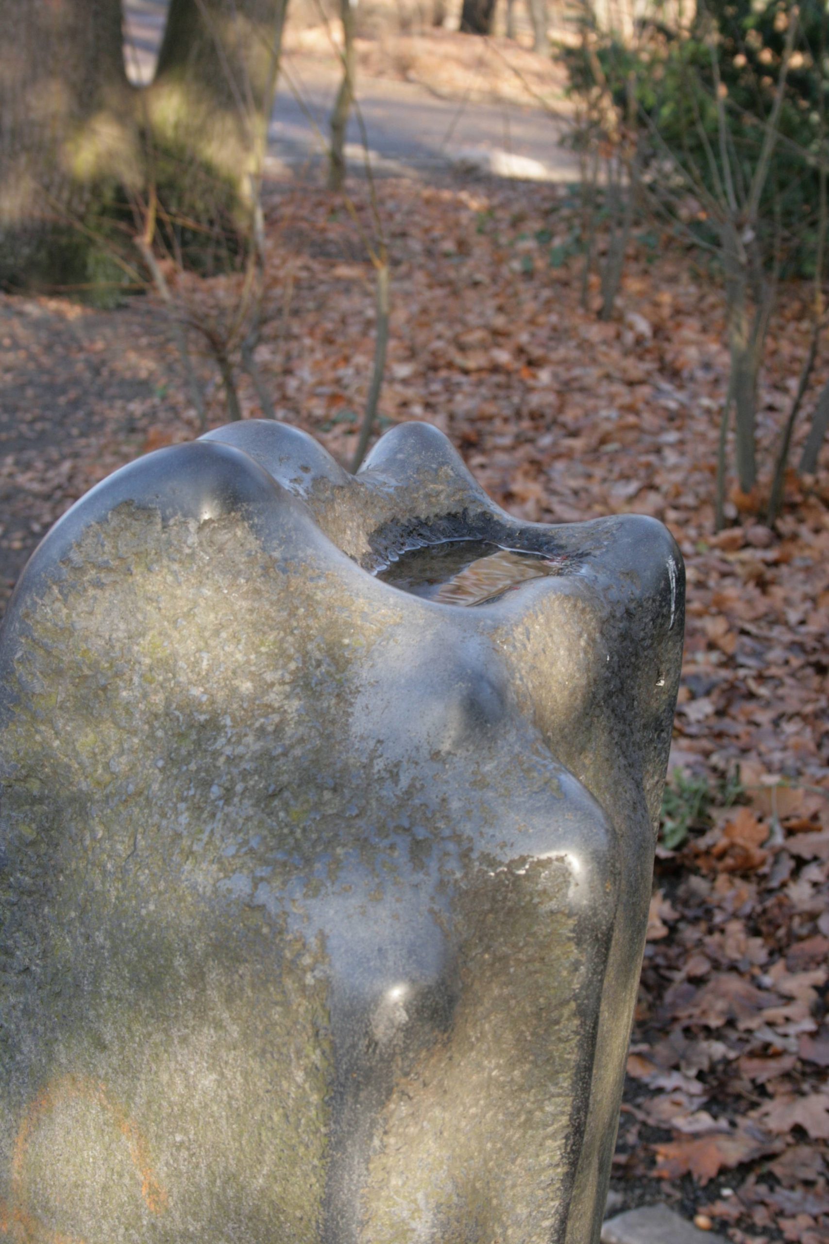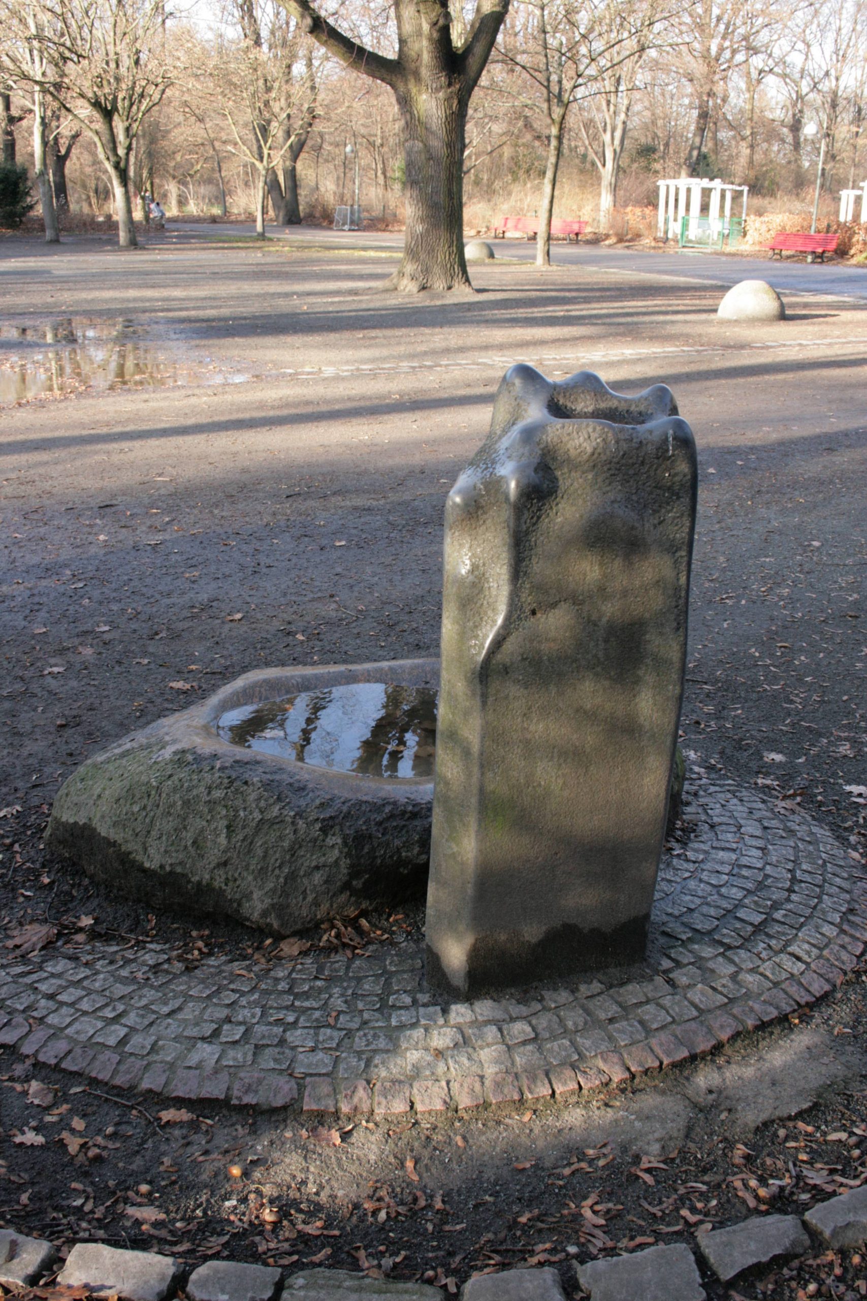 Teilweise polierter Stelenstein aus dunklem Stein (Basalt?) mit irregulärem oberem Abschluss. Ein Wasserauslauf aus Metall ist (vermutlich rudimentär) erhalten. Vor der Stele liegt ein Granitfindling mit eingetiefter, irregulär geformter Mulde. Die unmittelbare Umgebung der Granitsteinschale ist mit einer polychromen, leicht gewölbten und kleinteiligen Granitpflasterung bedeckt (Jörg Kuhn).