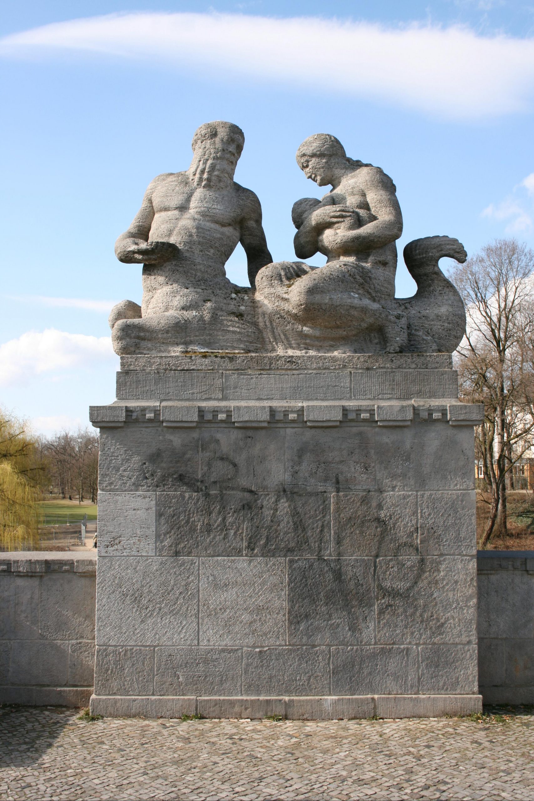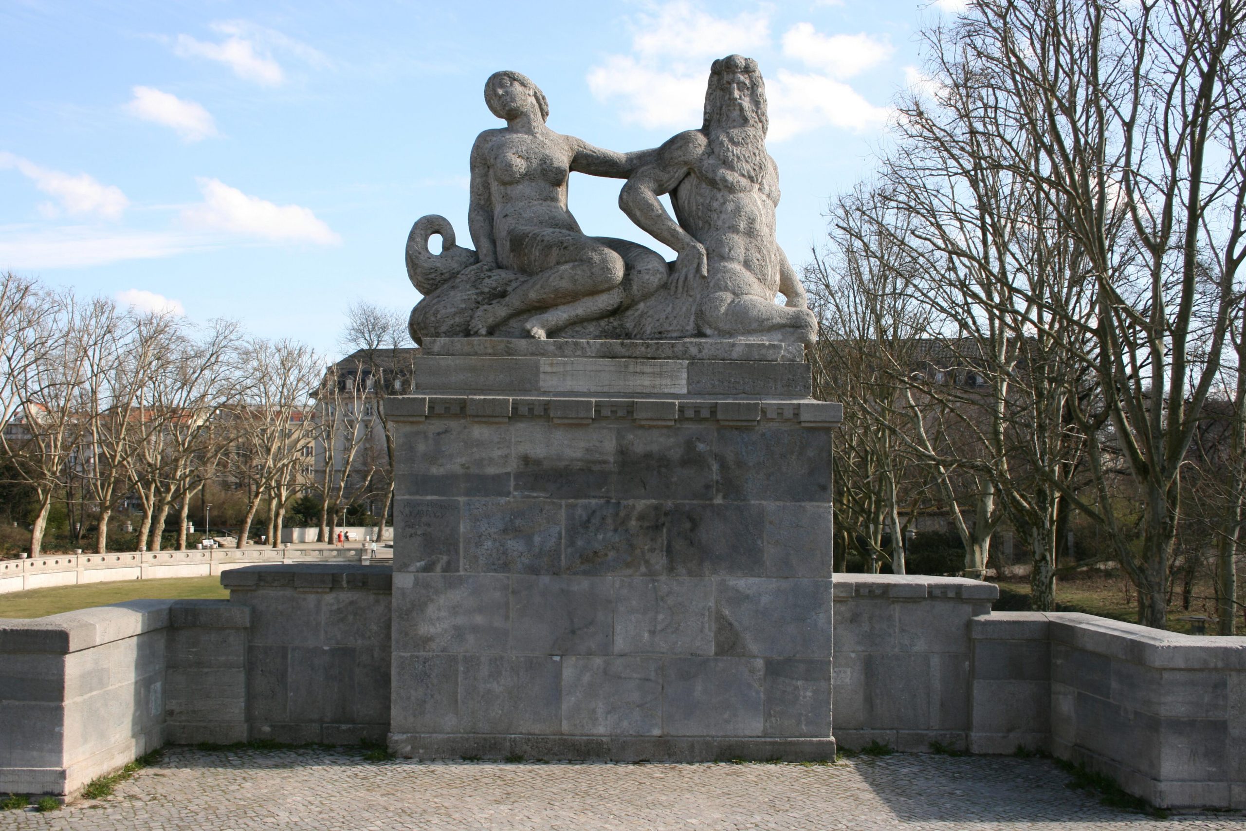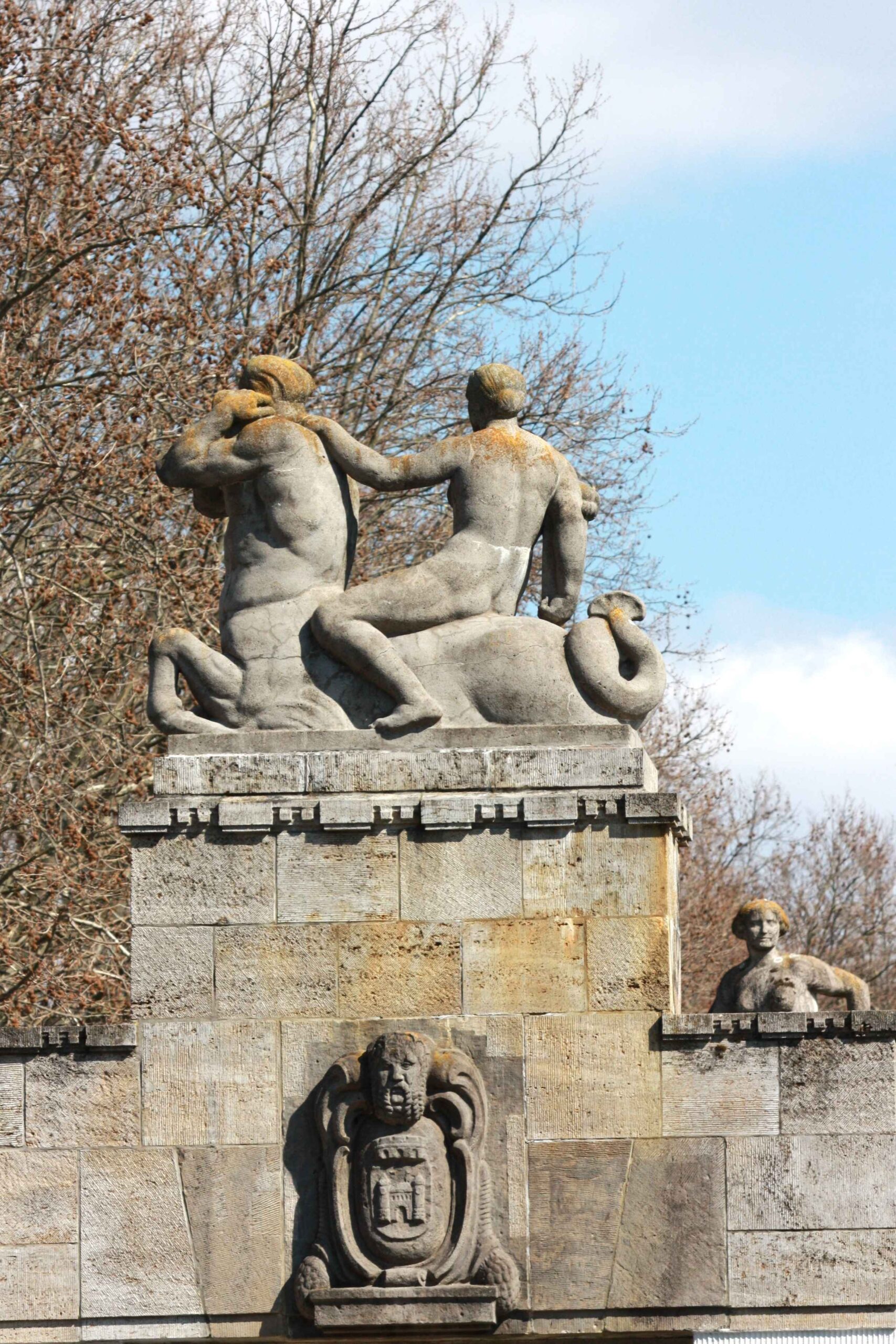 4 Gruppen auf hohen Sockeln im Verlauf der Brüstungen der Carl-Zuckmayer-Brücke über dem U-Bahnhof Rathaus Schöneberg (früher „Stadtpark“). Die Motive sind der Antike entnommen, beziehen sich am konkreten Ort deutlich auf das nahe Standesamt der ehemals selbständigen Stadt Schöneberg und stehen auch für das behütet Naturhafte des Stadtparks. in vier Varianten sind Gruppen dargestellt, jeweils aus einem männlichen Mischwesen (Hippokampen) und einer ideal gebildeten weiblichen Reiterfigur (Nymphen) bestehend, der in einem Fall ein Säugling, in einem anderen ein Füllhorn als Atribut beigegeben ist. Weitere Elemente der dekorativen Ausstattung der Brücke befinden sich an den Treppenabgängen zum Park. Dabei handelt es sich um auf Pfeilern stehende, dekorative, steinerne Deckelvasen, die mit antikisierenden Festons und Masken verziert sind (Jörg Kuhn).