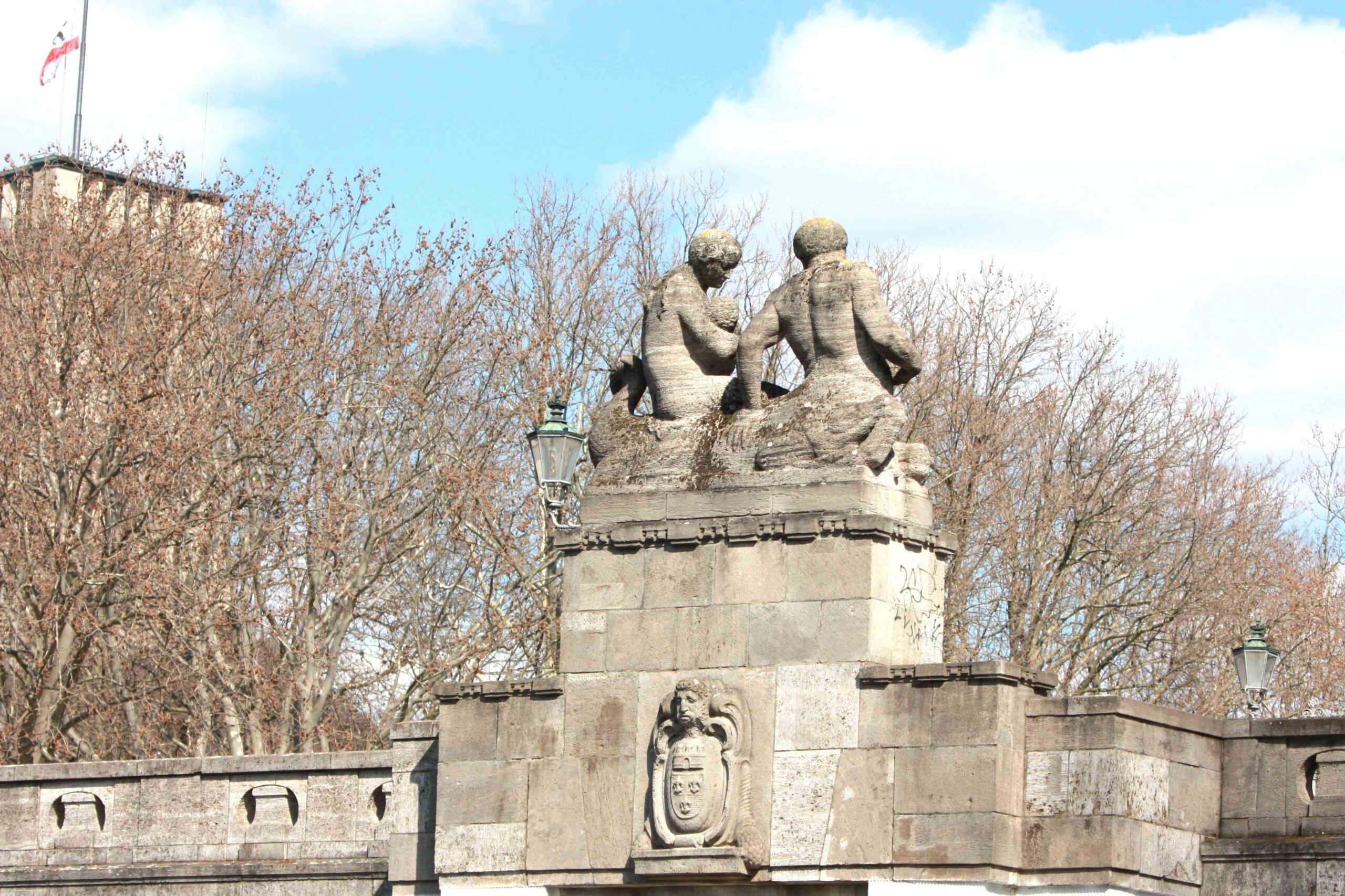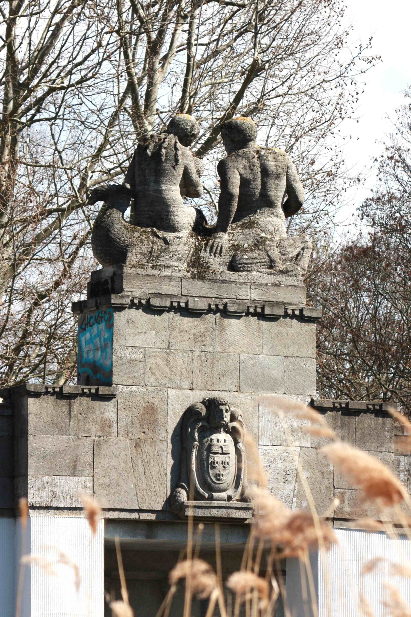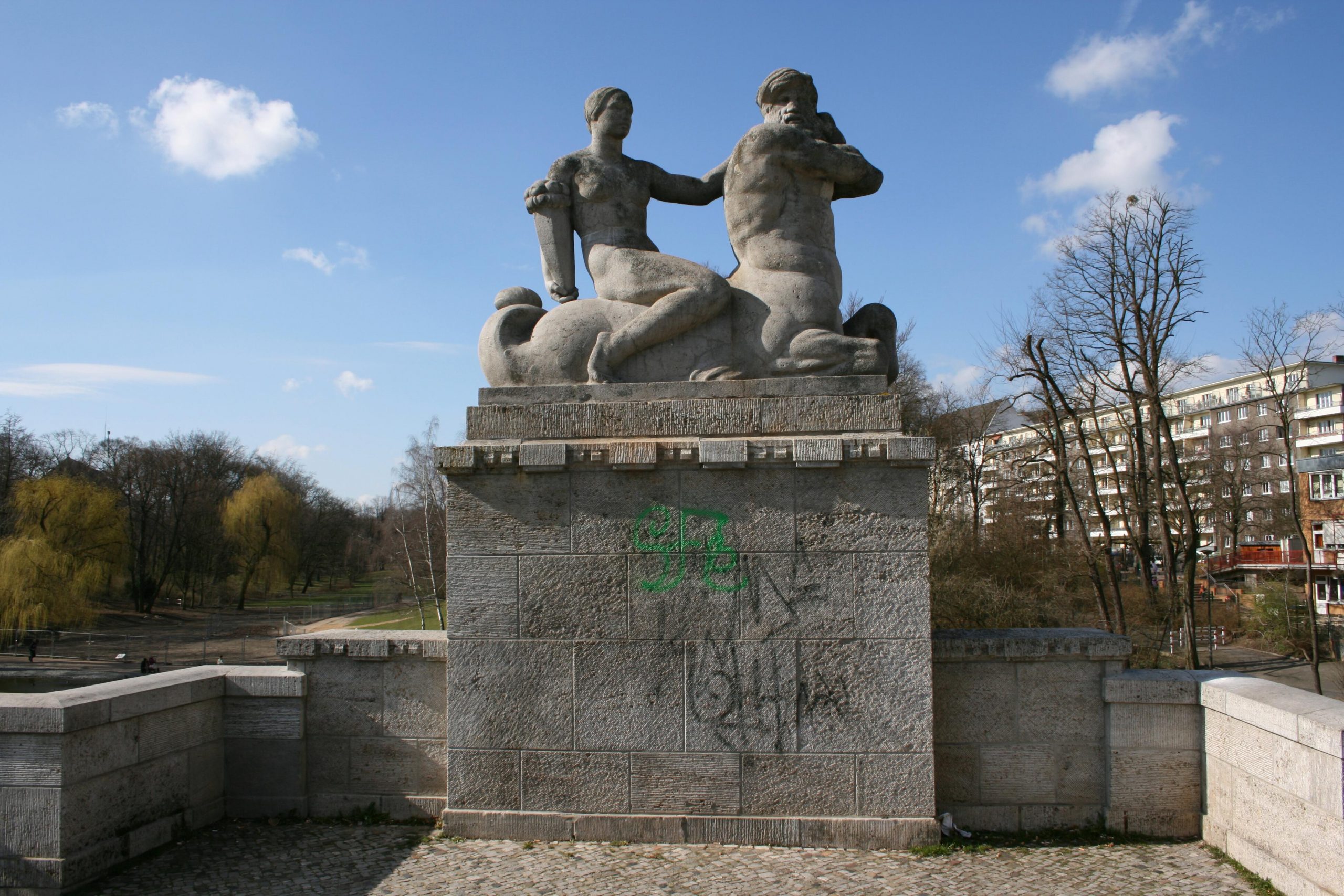 4 Gruppen auf hohen Sockeln im Verlauf der Brüstungen der Carl-Zuckmayer-Brücke über dem U-Bahnhof Rathaus Schöneberg (früher „Stadtpark“). Die Motive sind der Antike entnommen, beziehen sich am konkreten Ort deutlich auf das nahe Standesamt der ehemals selbständigen Stadt Schöneberg und stehen auch für das behütet Naturhafte des Stadtparks. in vier Varianten sind Gruppen dargestellt, jeweils aus einem männlichen Mischwesen (Hippokampen) und einer ideal gebildeten weiblichen Reiterfigur (Nymphen) bestehend, der in einem Fall ein Säugling, in einem anderen ein Füllhorn als Atribut beigegeben ist. Weitere Elemente der dekorativen Ausstattung der Brücke befinden sich an den Treppenabgängen zum Park. Dabei handelt es sich um auf Pfeilern stehende, dekorative, steinerne Deckelvasen, die mit antikisierenden Festons und Masken verziert sind (Jörg Kuhn).