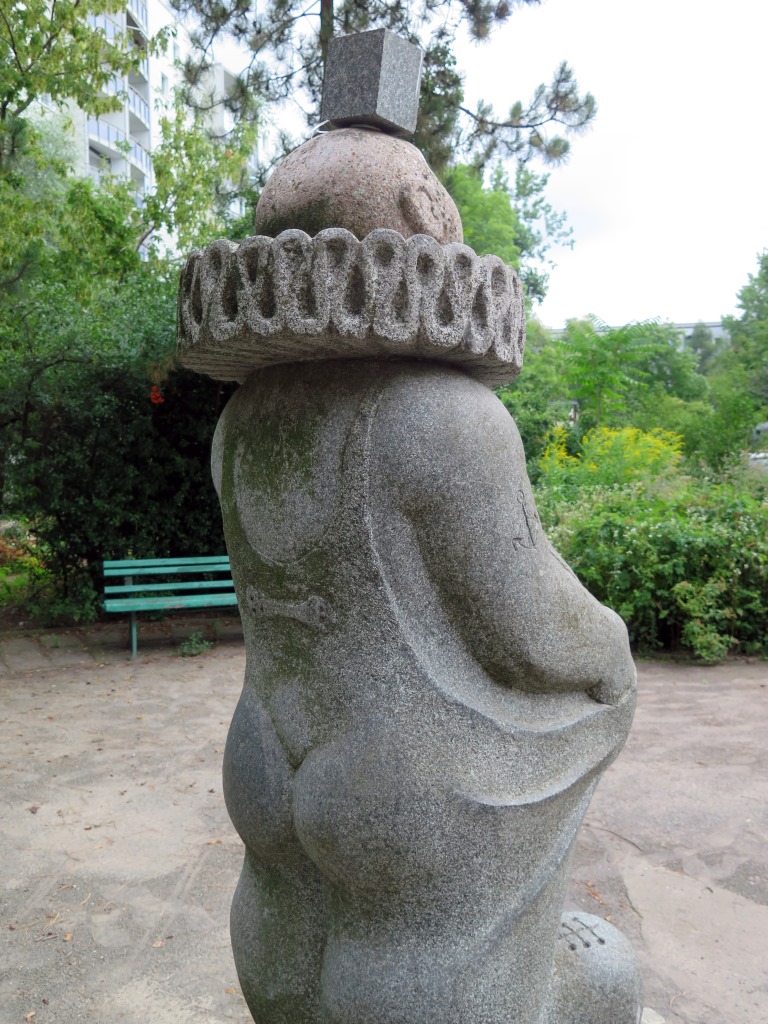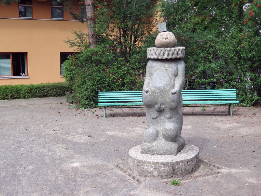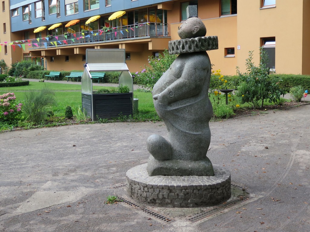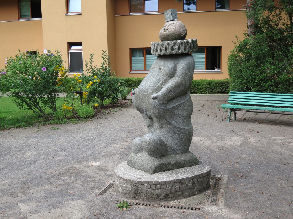 Im Seniorenzentrums „Prof. Dr. Kurt Winter“ in der Josef-Orlopp-Straße 13 steht die überlebensgroße männliche Figur des „Clown“ in einem kleinen Rondell im nördlichen Bereich des Gartens auf einem aus 5 Lagen Pflastersteinen gemauerten Sockel. Die riesige, fast schulterbreite gefältelte Halskrause, das schräg auf dem Kopf sitzende Hütchen in Form eines Würfels und die übergroßen Schuhe kennzeichnen sie als Clown. Er ist bekleidet mit einer Latzhose, wobei der Bauch und die Genitalien unbedeckt sind. Die Hände sind lässig in die Hosentaschen gesteckt. Stark stilisierte Einzelelemente, wie die Schnürsenkel am rechten Schuh, eine Armbanduhr am linken Handgelenk und ein Anker-Tattoo auf dem rechten Oberarm verstärken den humoristischen Eindruck. Aus einem heute stark verwitterten Rohr in seinem Mund sprudelte ursprünglich Wasser, das über dem dicken Bauch der Figur abtropfte. Die vorhandenen Ablaufgitter im Boden lassen vermuten, dass es sich hier noch um den ursprünglichen Aufstellungsort des Tröpfelbrunnens handelt. Der Figur ist aus verschiedenfarbigen Granitsteinen zusammengesetzt: der Körper ist aus grauem Granit gestaltet, die Halskrause besteht aus einem helleren Gestein, der Kopf aus zartrosafarben gesprenkeltem und das Hütchen aus einem dunkelgrauen Granit. Am hinteren rechten Bereich der Standfläche befindet sich eine Bildhauerbezeichnung (Nicola Vösgen).