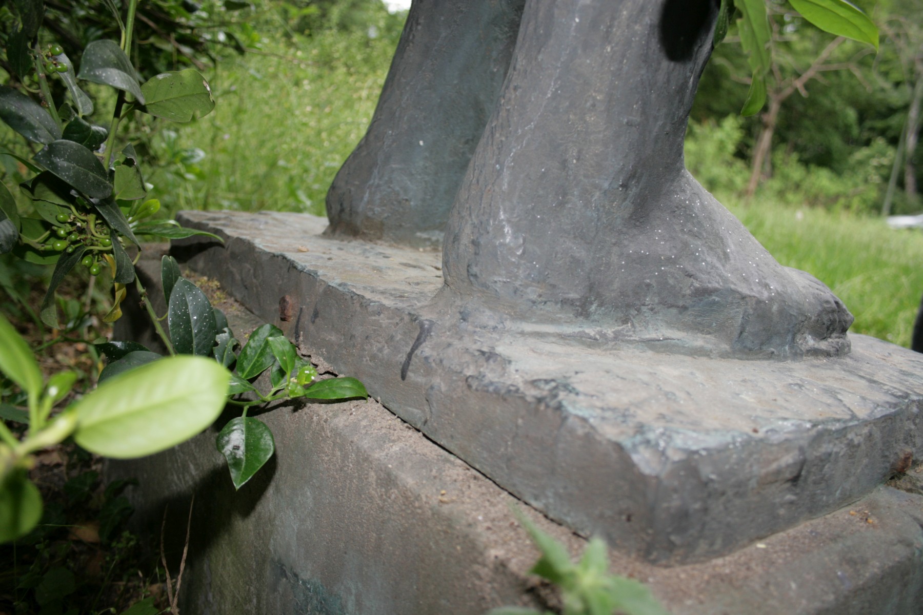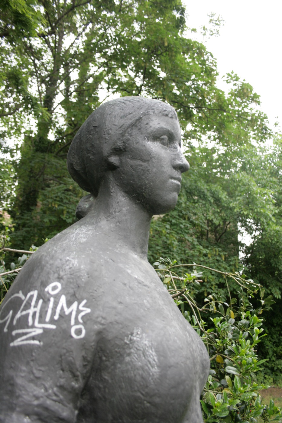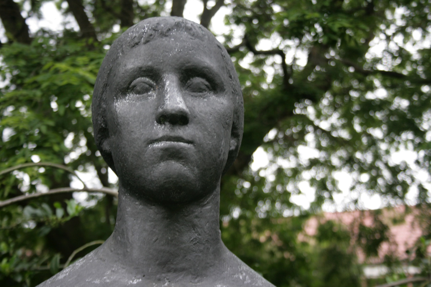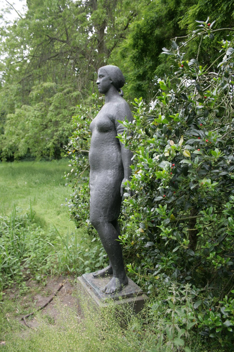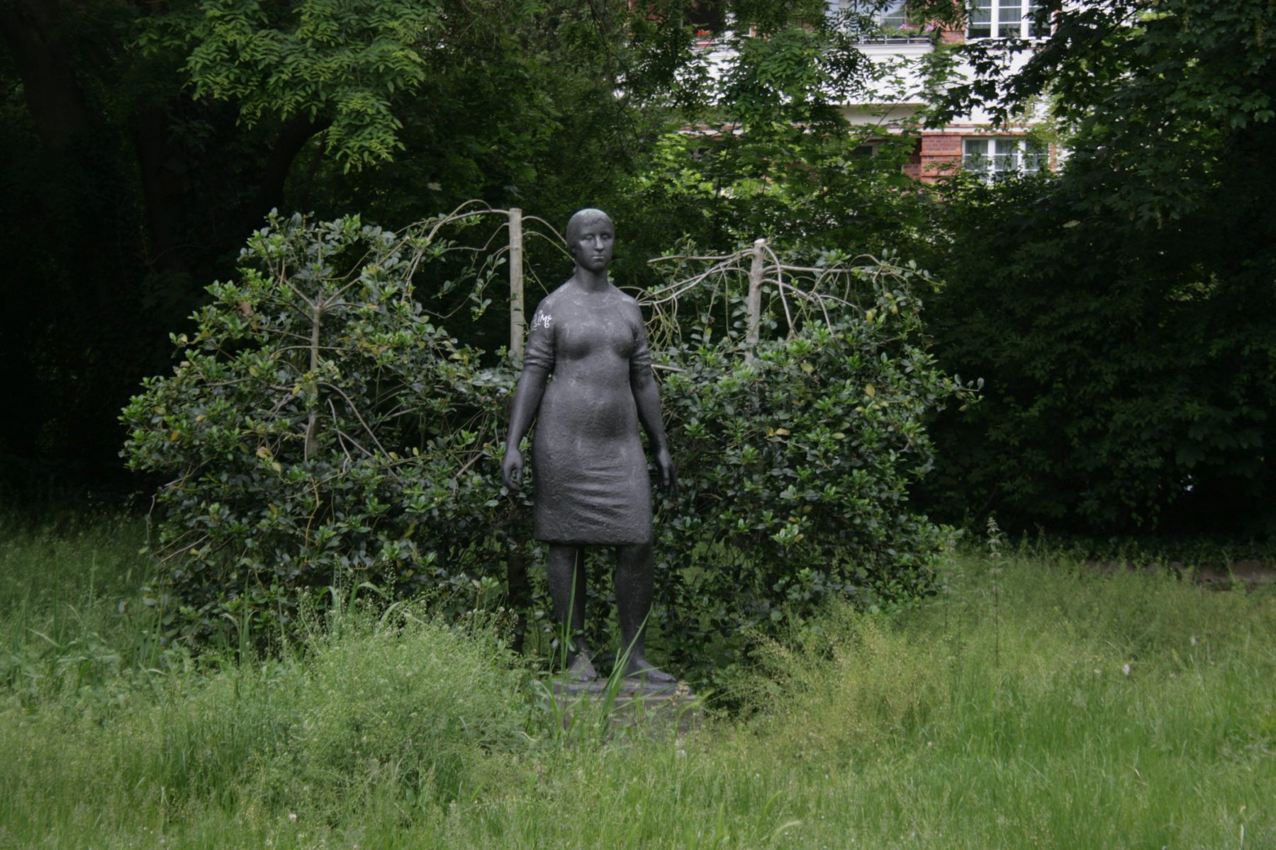 Darstellung einer leicht überlebensgroßen Frau im knielangen Kleid. Sie ist barfuß und trägt ein Kopftuch. Beide Arme hängen seitlich des Körpers herab.
