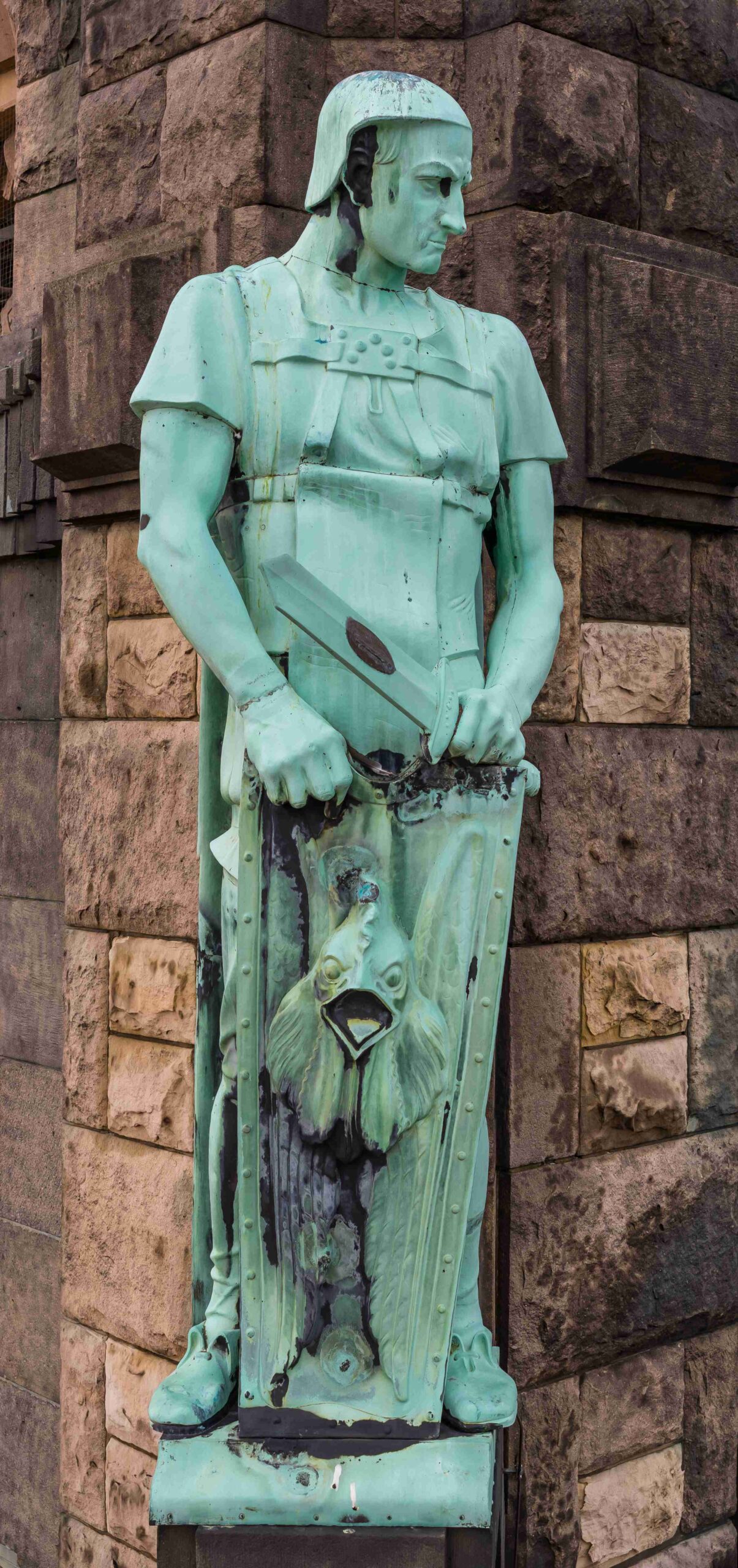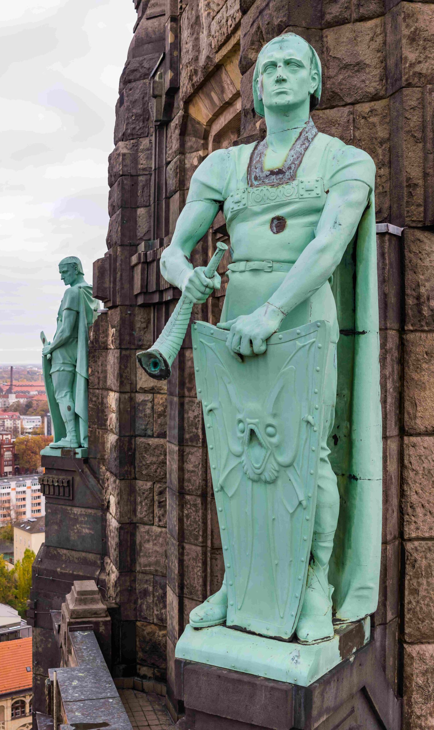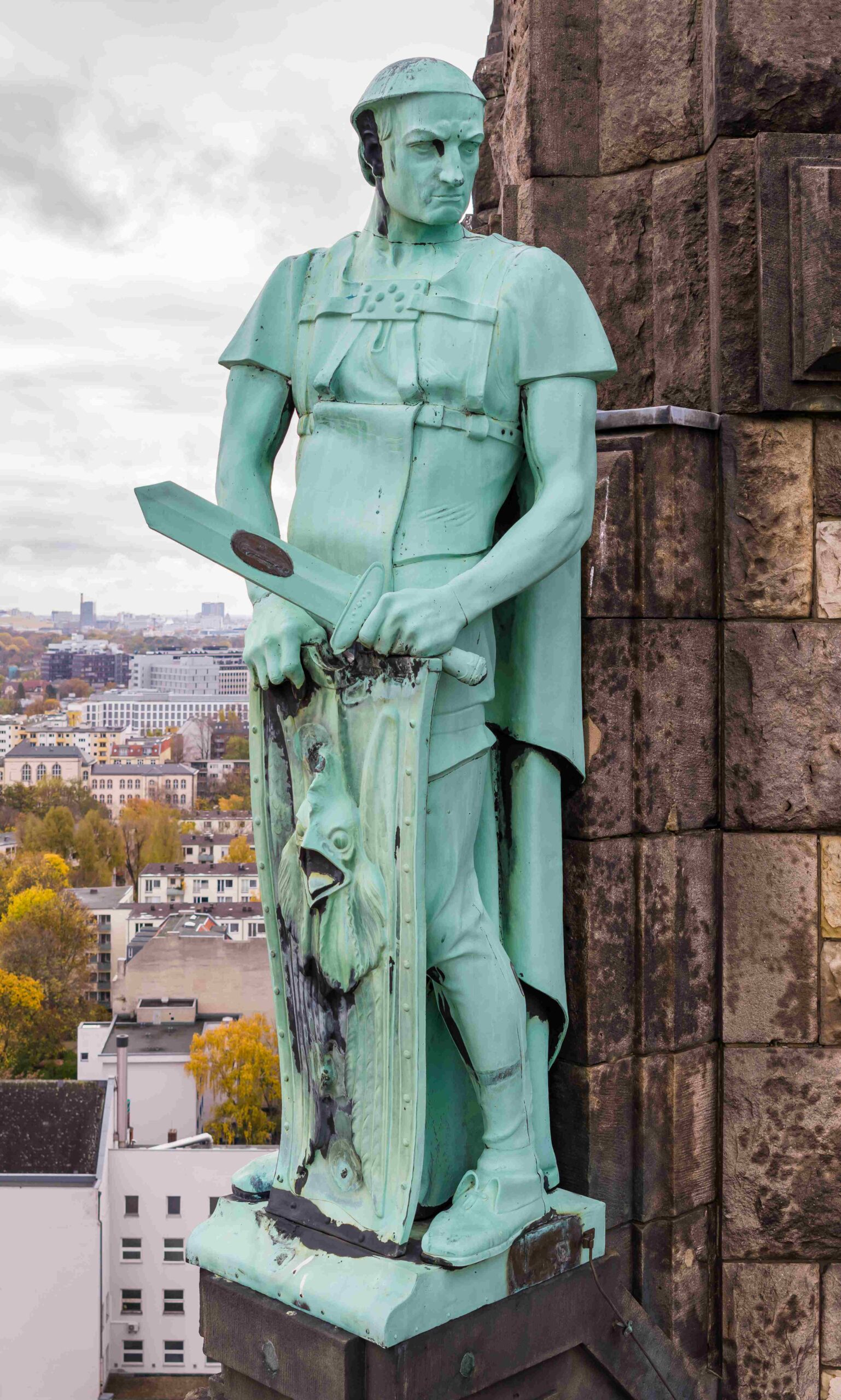 Der mit einer Laterne bekrönte, 88 Meter hohe Rathausturm des Rathauses Charlottenburg trägt an den vier Ecken weit überlebensgroße Statuen, die die Wachsamkeit und Wehrhaftigkeit der Stadt verkörperten. Die vier Monumentalfiguren nach zwei Modellen, die jeweils gespiegelt zur Ausführung gelangten, zeigen aufrecht stehende Wächter, die vor ihren Körpern Schilde mit Darstellungen von Hahn und Fledermaus aufgestützt haben, und in den Händen Schwert und Horn halten (Nicola Vösgen).