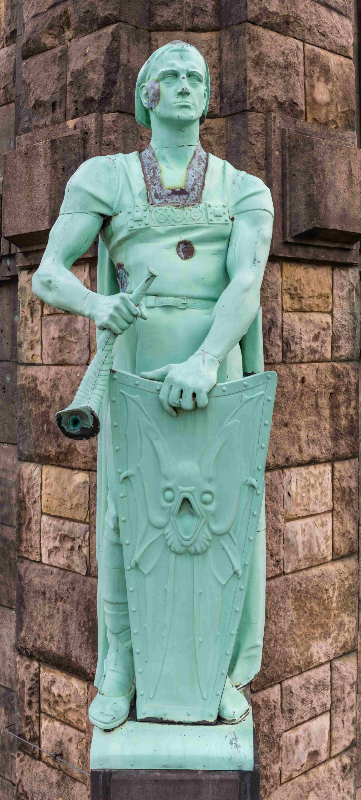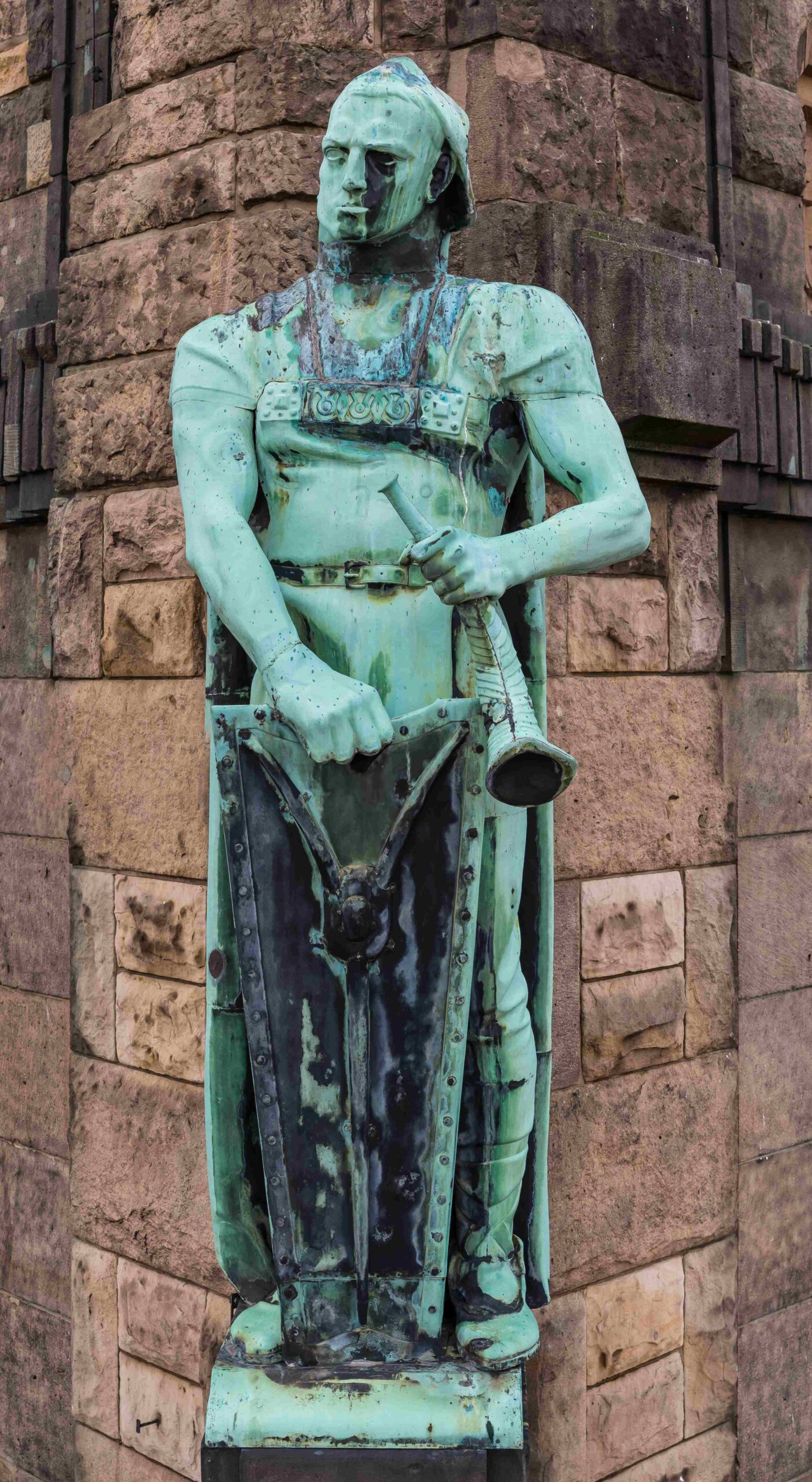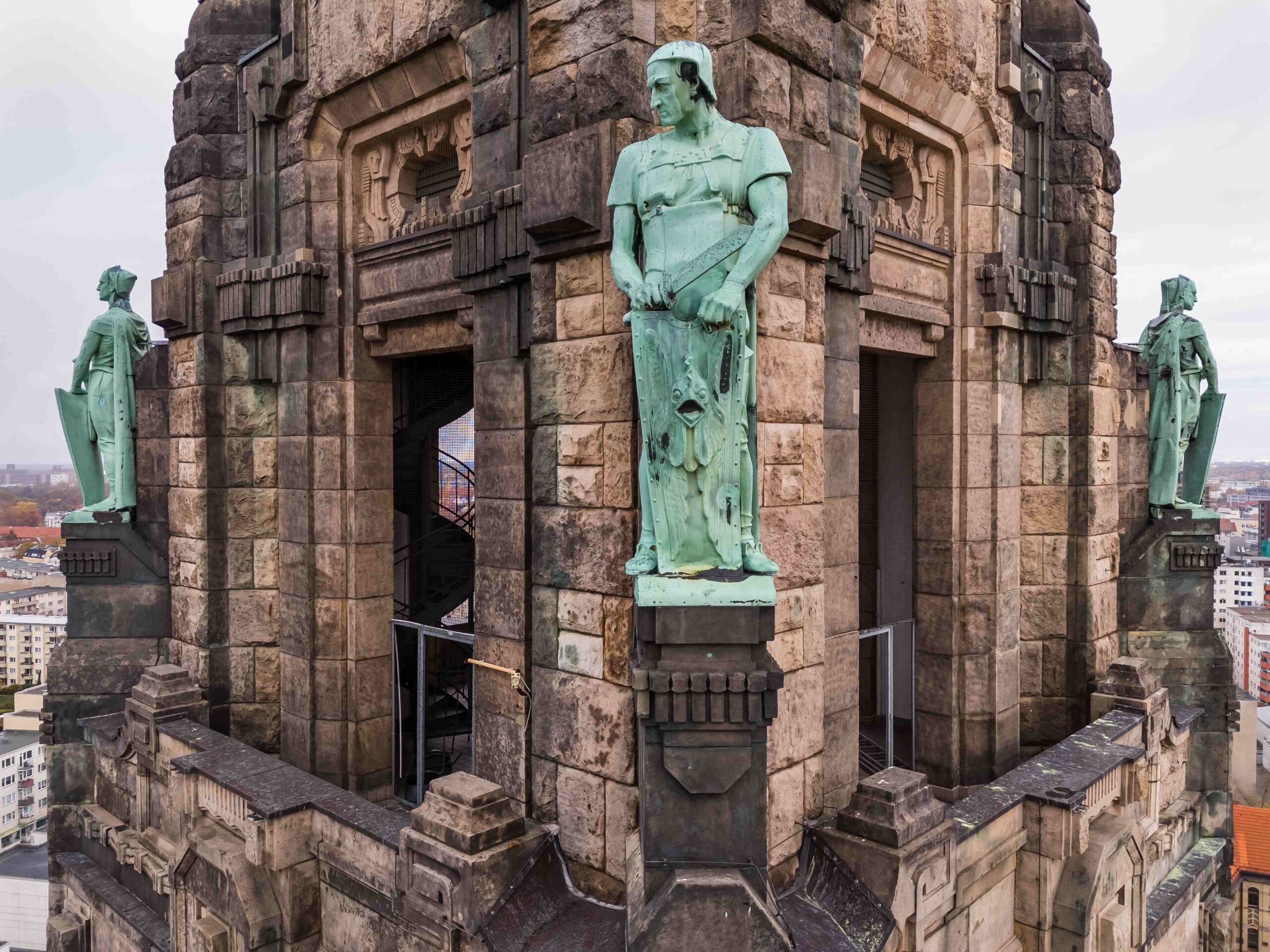 Der mit einer Laterne bekrönte, 88 Meter hohe Rathausturm des Rathauses Charlottenburg trägt an den vier Ecken weit überlebensgroße Statuen, die die Wachsamkeit und Wehrhaftigkeit der Stadt verkörperten. Die vier Monumentalfiguren nach zwei Modellen, die jeweils gespiegelt zur Ausführung gelangten, zeigen aufrecht stehende Wächter, die vor ihren Körpern Schilde mit Darstellungen von Hahn und Fledermaus aufgestützt haben, und in den Händen Schwert und Horn halten (Nicola Vösgen).