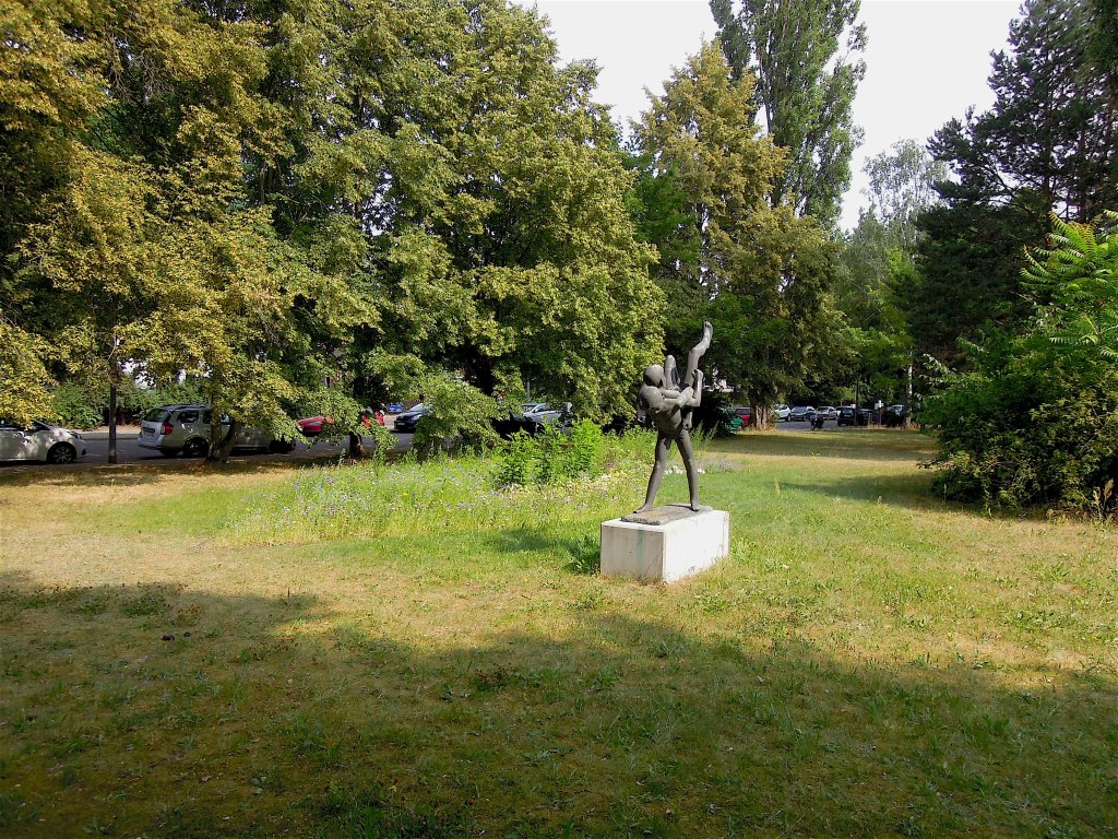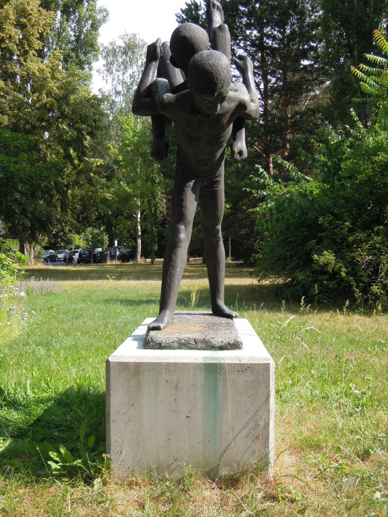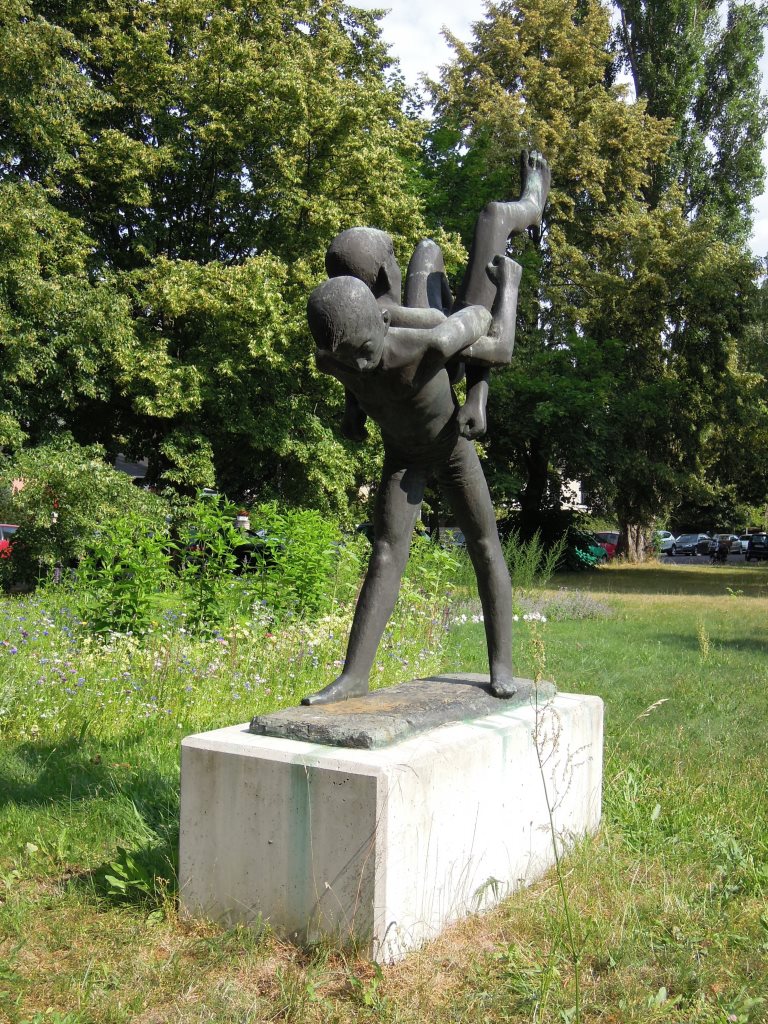 Die bronzene Gruppenplastik von Gerhard Rommel zeigt die menschliche Gestalt in körperlicher Aktion. Sie stellt zwei lebensgroße turnende Knaben dar. Die beiden Jungen haben sich „Rücken an Rücken gestellt, die Arme ineinander verschränkt und heben sich auf die bekannt Weise [schaukelnd] gegenseitig hoch. Der untere nach rechts gewendet, gibt der Gruppe mit seinem breitbeinigen Dastehen die nötige Statik, der andere mit den zappelnden Beinen in der Luft bestimmt die charakteristisch bewegte Silhouette.“ (Zitat aus: Weidner, Klaus: Plastiken, Denkmäler und Brunnen im Bezirk Köpenick. Berlin 1993, S. 20) (Jürgen Tomisch/ Barbara Anna Lutz).
