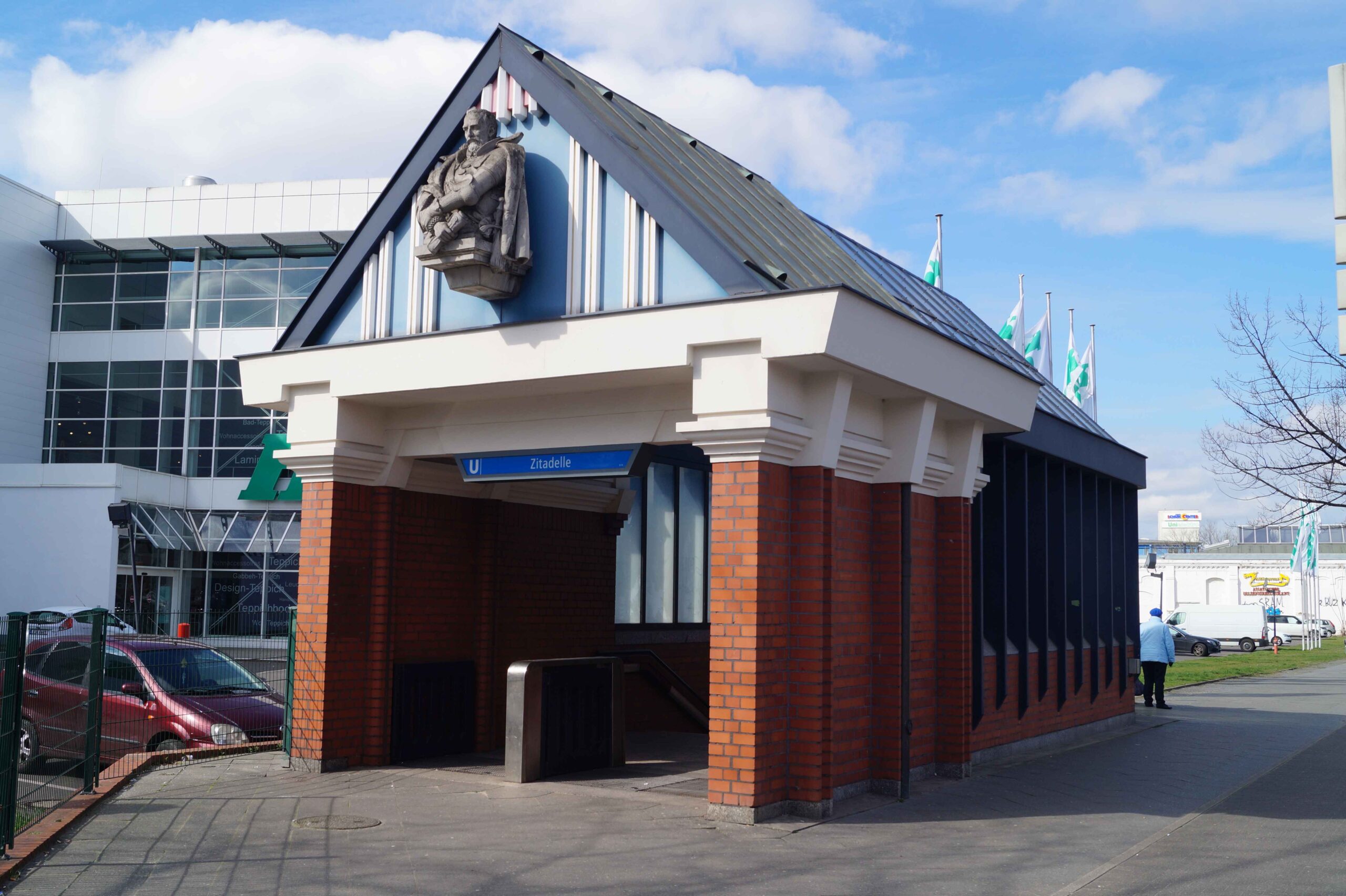 Die beiden Zugänge zum U-Bahnhof Zitadelle befinden sich südlich und nördlich der Straße Am Juliusturm. Es handelt sich um zwei identische Bauwerke. Die seitlichen Wände sind im vorderen Bereich mit roten Klinkern verkleidet, im hinteren Bereich mit hohen Glasfenstern geöffnet. Beide Gebäude tragen ein kupfergedecktes Spitzdach (Nicola Vösgen).