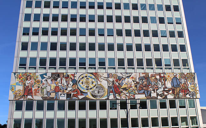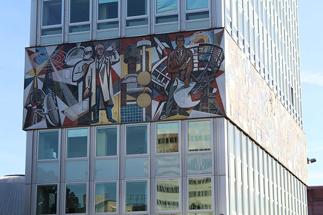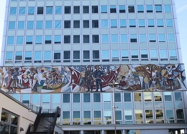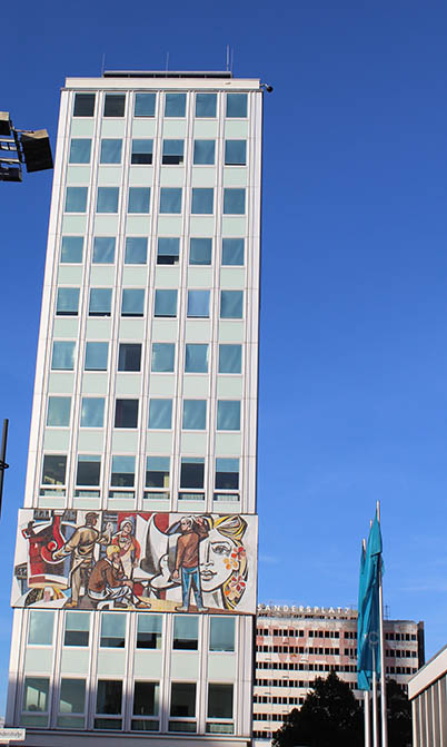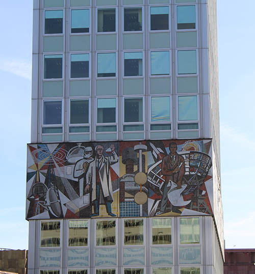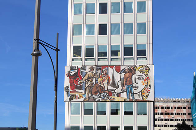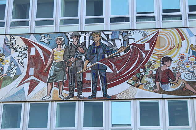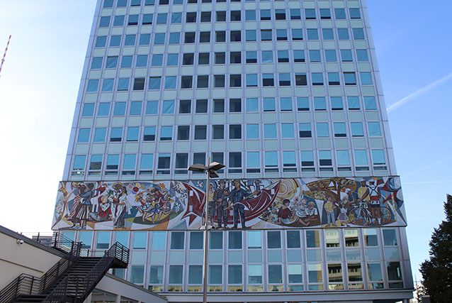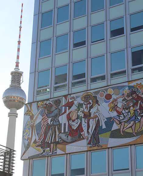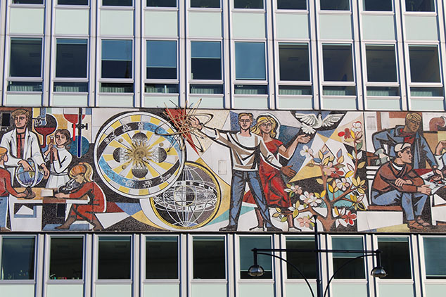 Das umlaufende Mosaikfries von Walter Womacka erstreckt sich über zwei Stockwerke des Haus des Lehrers. Die figürlichen Szenen und symbolischen Motive aus dem Leben der DDR-Bürger*innen setzt sich aus über 800.000 einzelnen Fließen zusammen. Wandbilder mexikanischer Künstler dienten Womacka als Inspiration für die Wandgestaltung. Die Szenen sind in kräftigen Farben und flächigen Formen mit schwarz umrandeten Konturen gestaltet. Jede Seite hat ein eigenes Themengebiet. Die Nordseite des Frieses widmet sich dem Themenbereich Wissenschaft und Technik. Die Südwand zeigt Arbeiter*innen verschiedener Tätigkeiten neben einem Maler. Es wird das Nebeneinander unterschiedlicher Berufsgruppen dargestellt. Das zentrale Thema der Ostseite ist die Völkerfreundschaft. Die Vorstellung eines friedvollen Miteinanders kommt durch die symbolhafte weiße Taube zum Ausdruck, die die einzelnen Szenen verbindet. Die Westseite des Fries zeigt alltägliche Szenen des Lebens in der DDR. Um ein junges Paar im Zentrum des Bildes gruppieren sich die übrigen Szenen (Vgl. https://www.hausdeslehrers.de/geschichte/der-fries/). (Layla Fetzer)