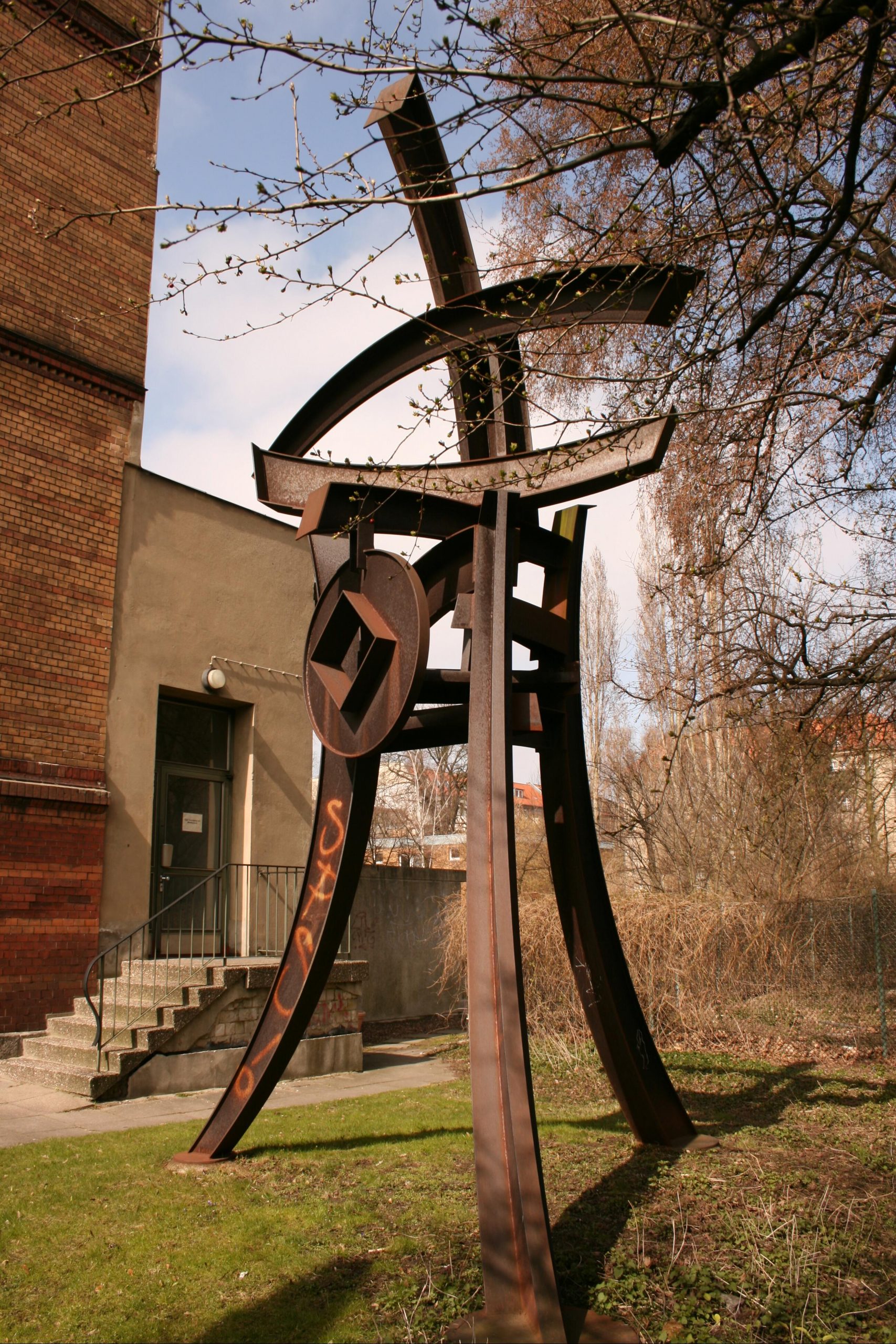 Um den Plänen für eine Durchwegung zwischen Grunewaldstraße und Kleistpark künstlerisch Ausdruck zu verleihen, wurde 1986 vom Kunstamt Schöneberg und dem Hochbauamt ein Wettbewerb zu einem Skulpturenensemble für die Grünfläche am Haus am Kleistpark ausgeschrieben. Die Bildhauer Manfred Hodapp und Dietrich Arlt-Aeras gingen mit ihren Entwürfen für großformatige Stahlplastiken als Sieger aus diesem Wettbewerb hervor (vgl.: "Skulpturen. Haus am Kleistpark, Dietrich Arlt-Aeras, Manfred Hodapp", Redaktion: Katharina Kaiser, Hrsg. Bezirksamt Schöneberg von Berlin, Kunstamt, Berlin 1988). Während Manfred Hodapp für den vorderen Teil der Grünfläche eine Stele aus Edelstahl konzipierte, entwarf Arlt-Aeras für den dahinterliegenden Bereich eine etwas weniger auffällige Plastik aus rostbraunem künstlich-korrodierten Stahl mit dem Titel „Unterwegs“. Als Erklärung für die Zusammengehörigkeit der beiden Plastiken betonten die Künstler, dass es ihnen gerade darum ging, gegensätzliche Positionen einzunehmen, der Betrachter solle die Möglichkeit haben neben den expliziten Gegensätzen wie „feste Form“ versus „luftige Form“, „Konstruktives“ versus „Vegetatives“, „statuarisch“ versus „tanzend“ oder „Betrachter“ versus „Akteur“ auch weitere gegensätzliche Begriffe zu assoziieren. 2010/2011 durch die Anlage eines Verbindungsweges geriet die Plastik in den Verlauf des neuen Einfassungszauns und ragt nun mit dem östlichen "Fuß" leicht, aber merklich in den Wegraum hinein (Susanne Kähler).