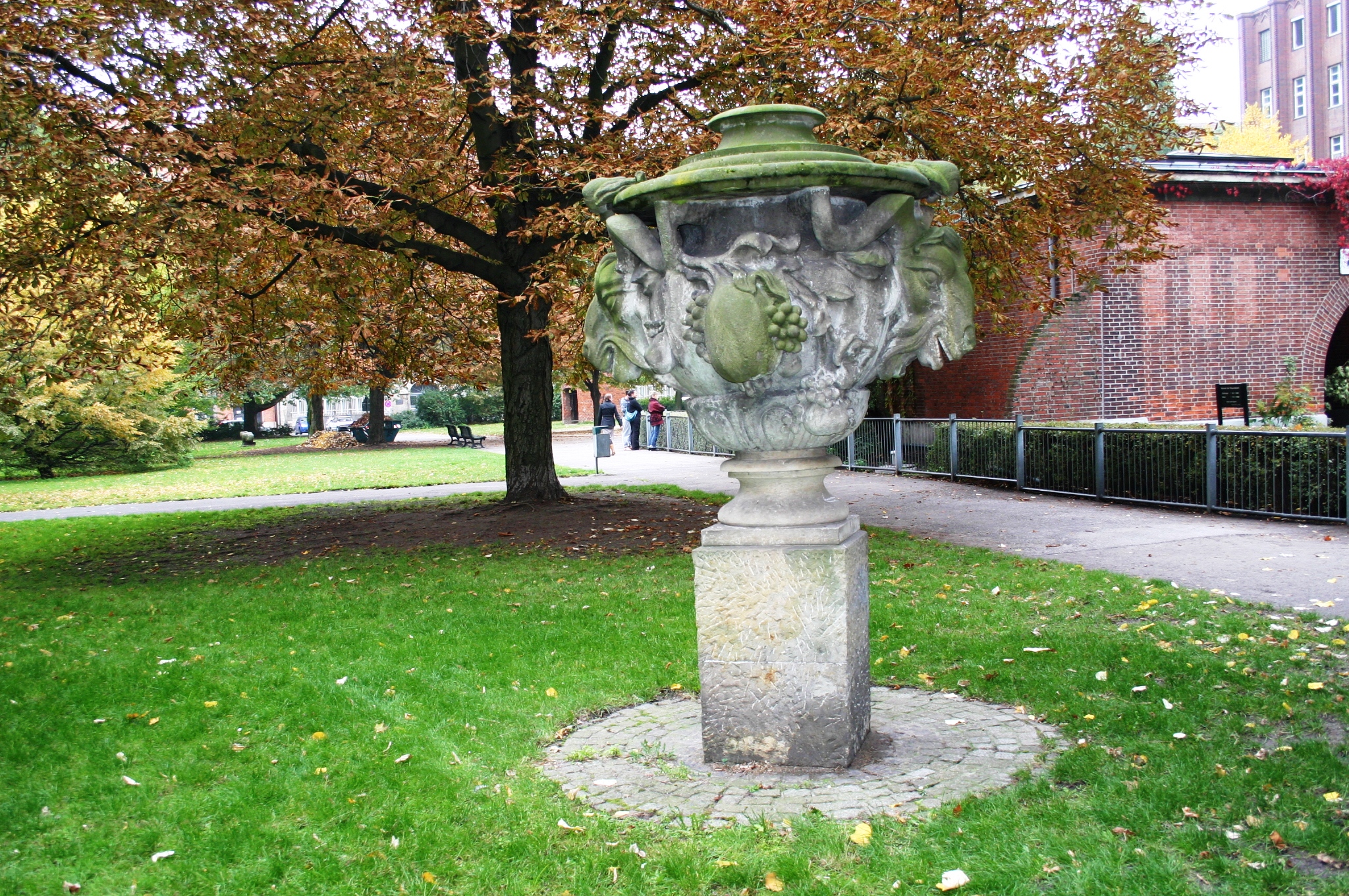 Bei der Vase handelt es sich um eine Kopie einer Attikavase der nach Entwurf von Georg Wenzeslaus von Knobelsdorff errichteten nördlichen Kolonnaden des Schlosses Sanssouci. Das barocke Vorbild entstand 1745/1747 in der Werkstatt von Friedrich Christian Glume. Anfertigung offenbar aus didaktischen Gründen. Aufstellung im Köllnischen Park 1971. Zwei weitere Kopien befinden sich rechts des Zuweges zum Eingang des Tierparks Friedrichsfelde beim Schloss Friedrichsfelde (Jörg Kuhn).
