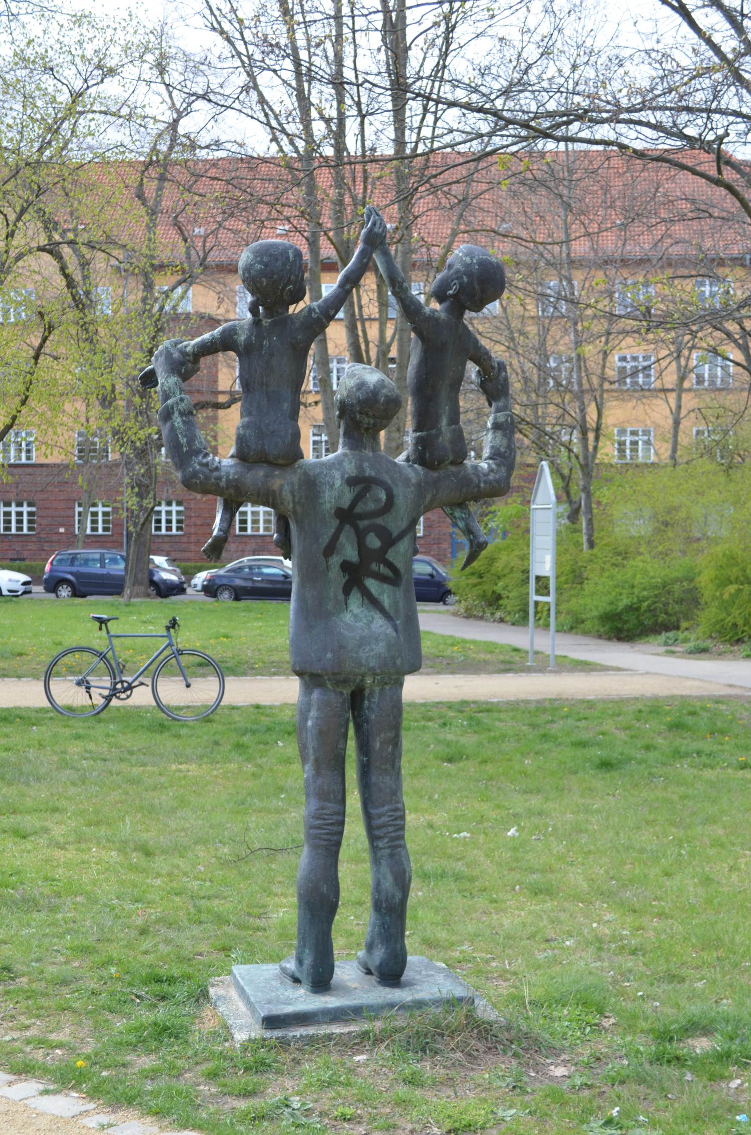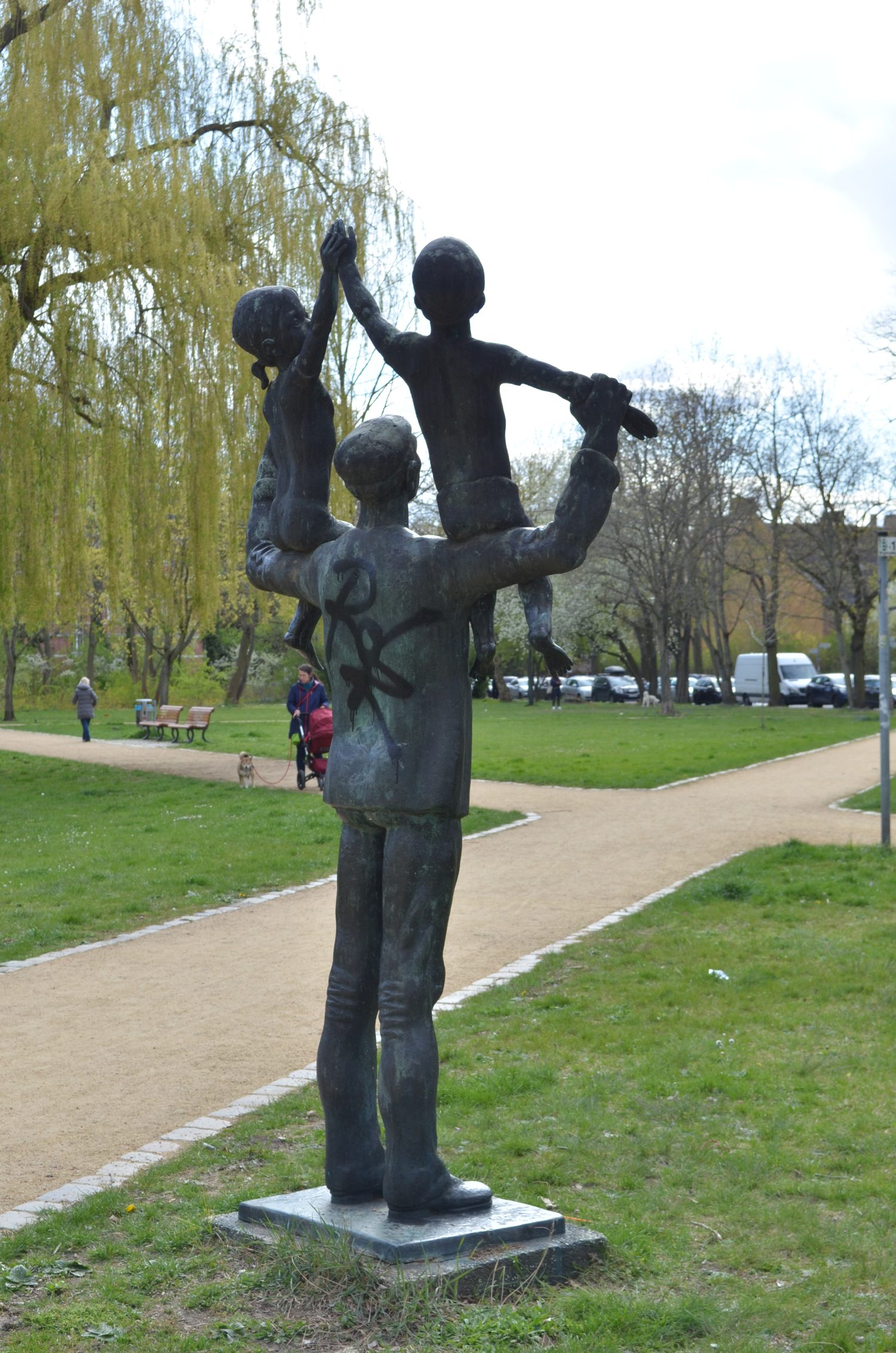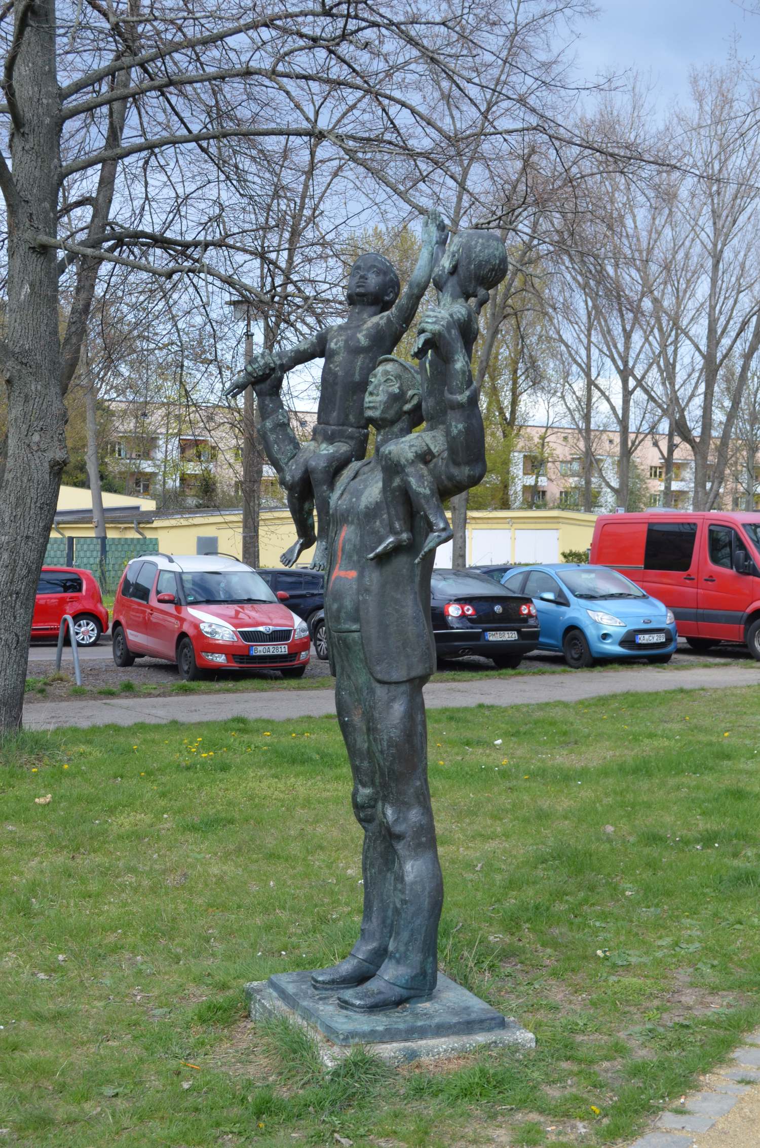 Freistehende Plastik mit schmaler Plinthe und einem rechteckigen Sockel. Die Plastik zeigt einen aufrecht stehenden Vater, der zwei Kleinkinder (links ein Junge und rechts ein Mädchen) auf seinen Oberarmen trägt und diese an den Handgelenken sicher festhält. Die beiden Kinder strecken jeweils einen Arm in die Höhe und ihre Hände berühren sich über dem Kopf des Vaters. Alle dargestellten Figuren tragen sommerliche, kurze Kleidung. Ihre Blicke wirken anmutend.