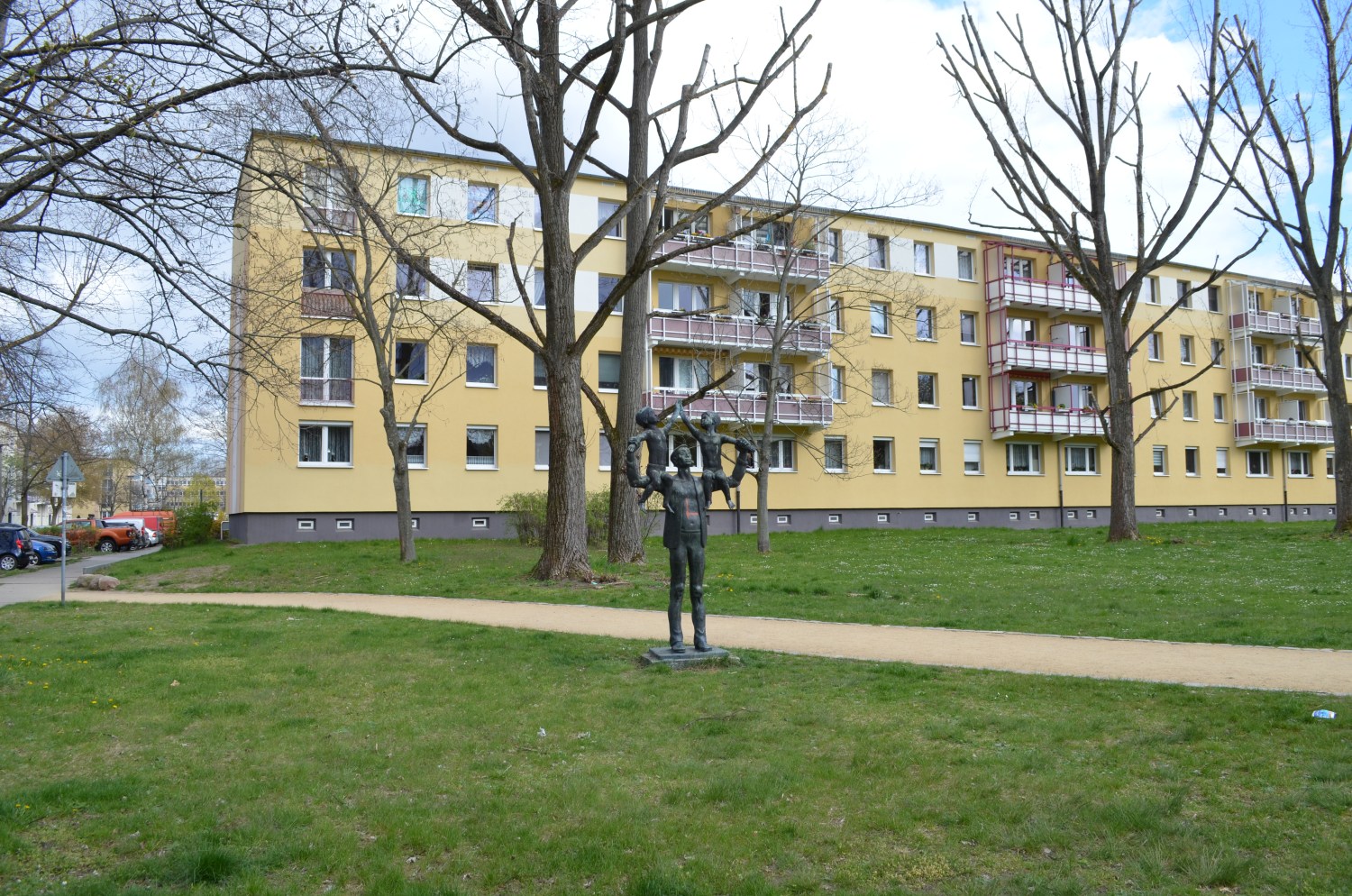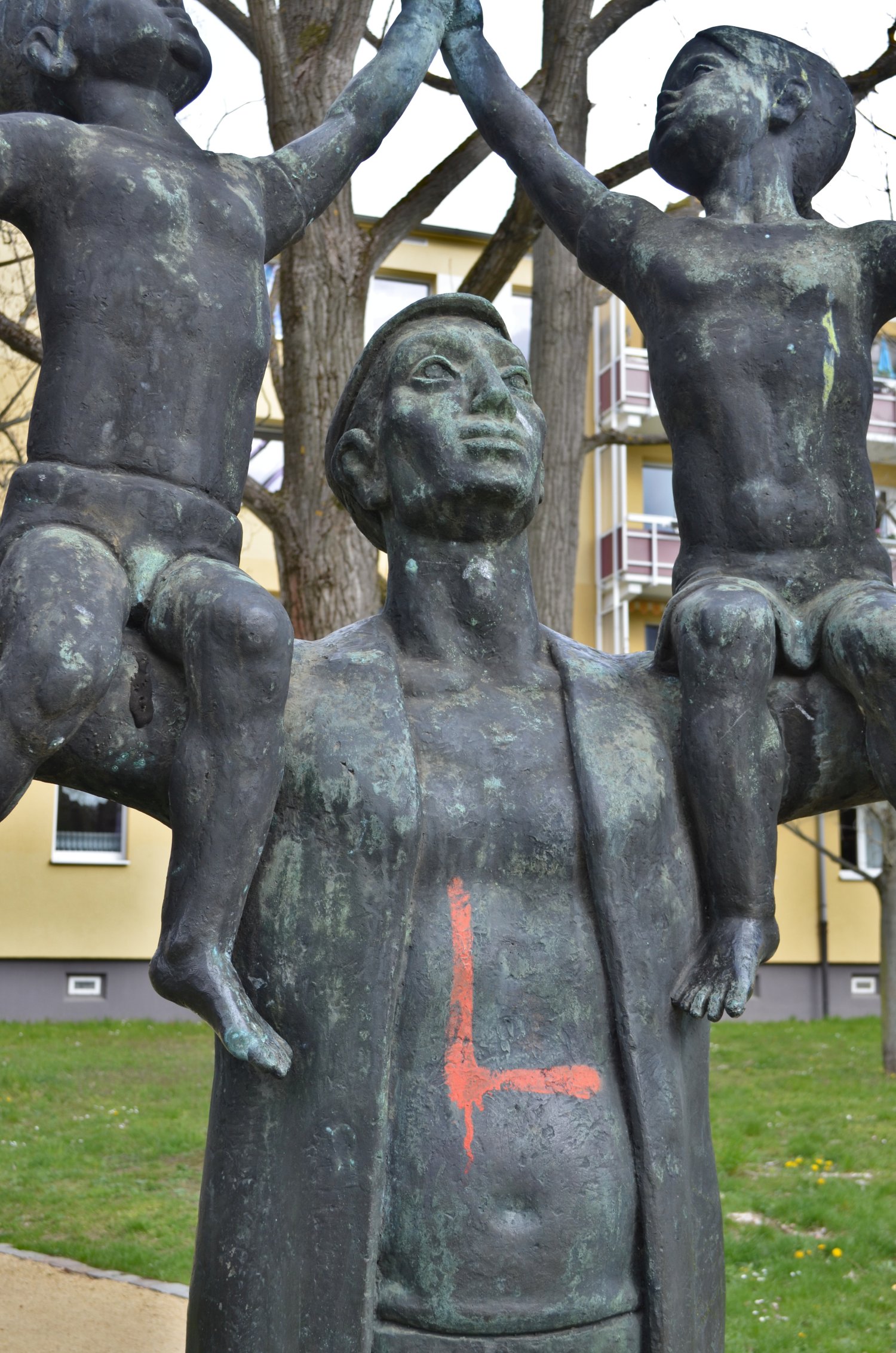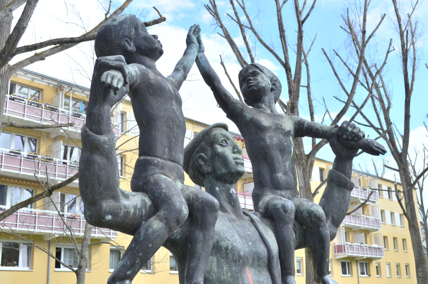 Freistehende Plastik mit schmaler Plinthe und einem rechteckigen Sockel. Die Plastik zeigt einen aufrecht stehenden Vater, der zwei Kleinkinder (links ein Junge und rechts ein Mädchen) auf seinen Oberarmen trägt und diese an den Handgelenken sicher festhält. Die beiden Kinder strecken jeweils einen Arm in die Höhe und ihre Hände berühren sich über dem Kopf des Vaters. Alle dargestellten Figuren tragen sommerliche, kurze Kleidung. Ihre Blicke wirken anmutend.