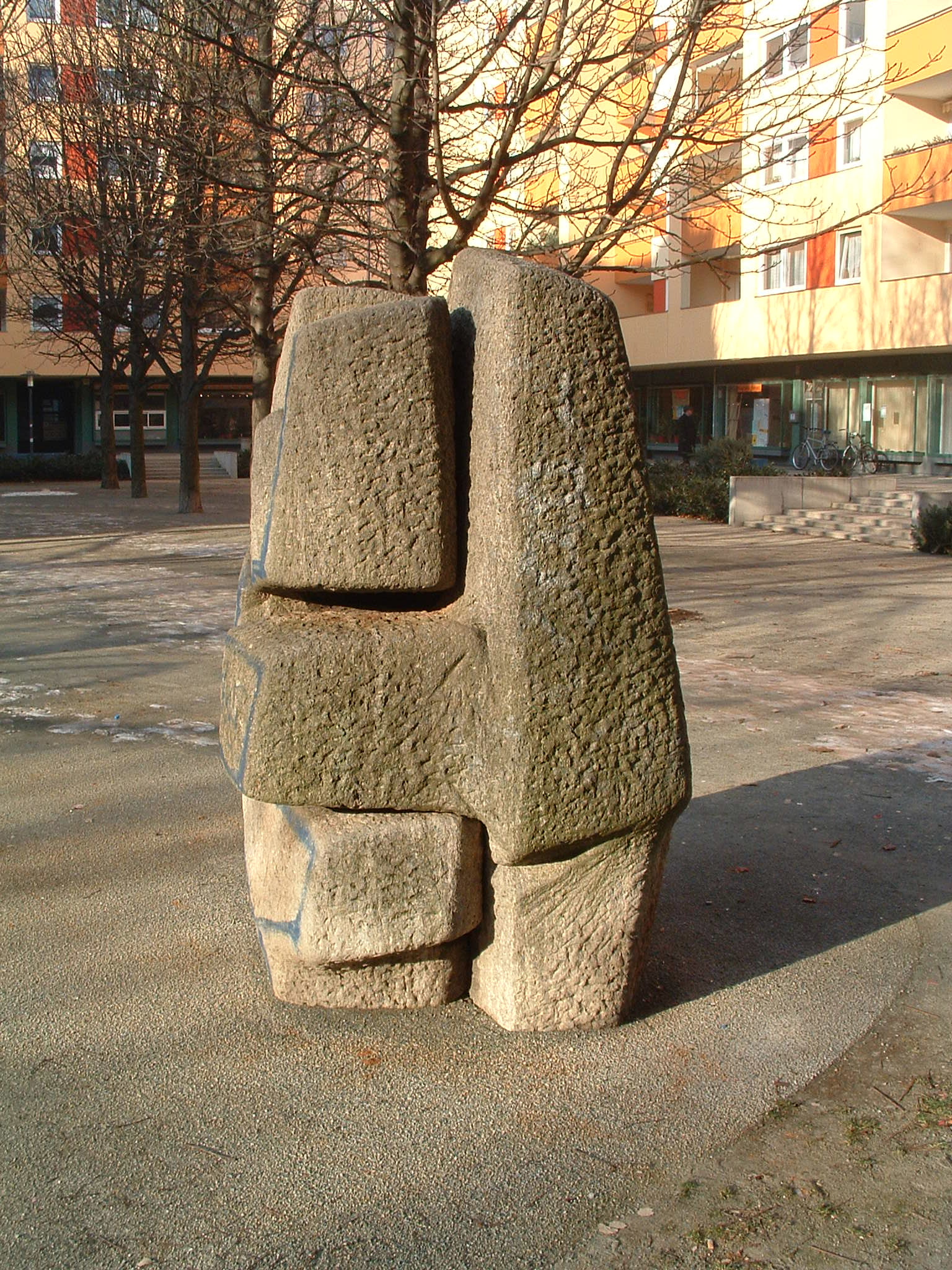 Abstrakte Steinfigur aus drei unterschiedlichen Teilen, die mit ihren unterschiedliche Winkel buildenden Formen ineinandergreifen. Es entsteht der Eindruck von Umarmung. Zwischen den Teilen bleibt nur ein kleiner Spalt. Die Oberflächen sind grob geglättet und wirken bossiert (Jörg Kuhn).