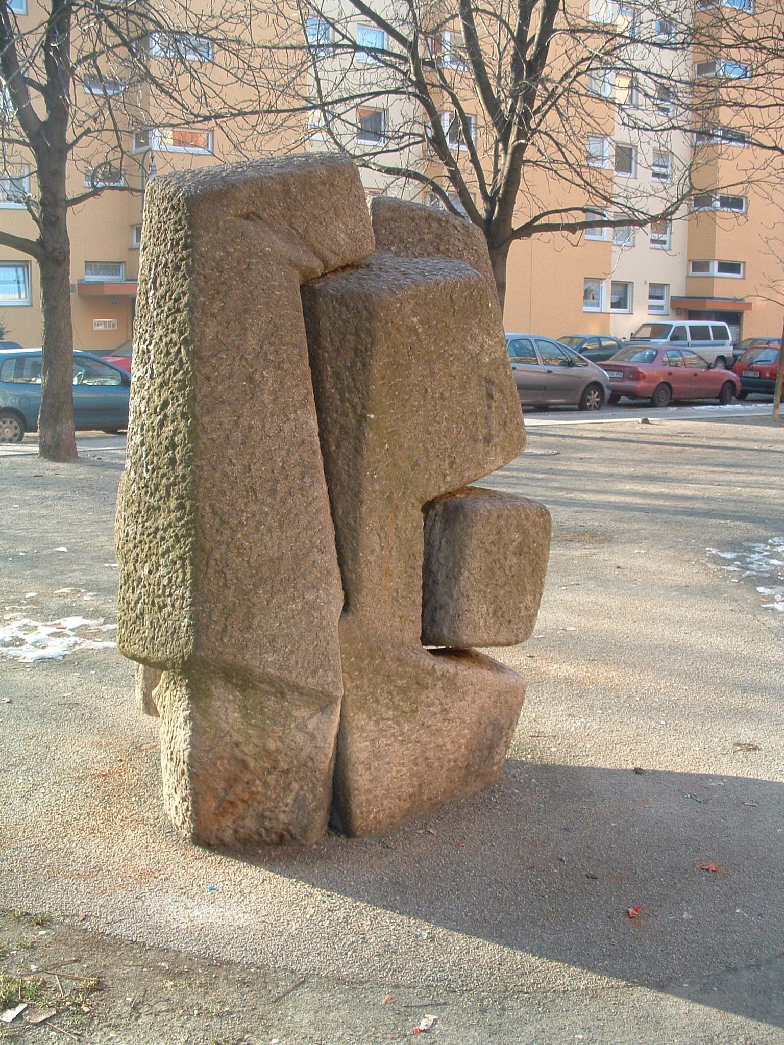 Abstrakte Steinfigur aus drei unterschiedlichen Teilen, die mit ihren unterschiedliche Winkel buildenden Formen ineinandergreifen. Es entsteht der Eindruck von Umarmung. Zwischen den Teilen bleibt nur ein kleiner Spalt. Die Oberflächen sind grob geglättet und wirken bossiert (Jörg Kuhn).
