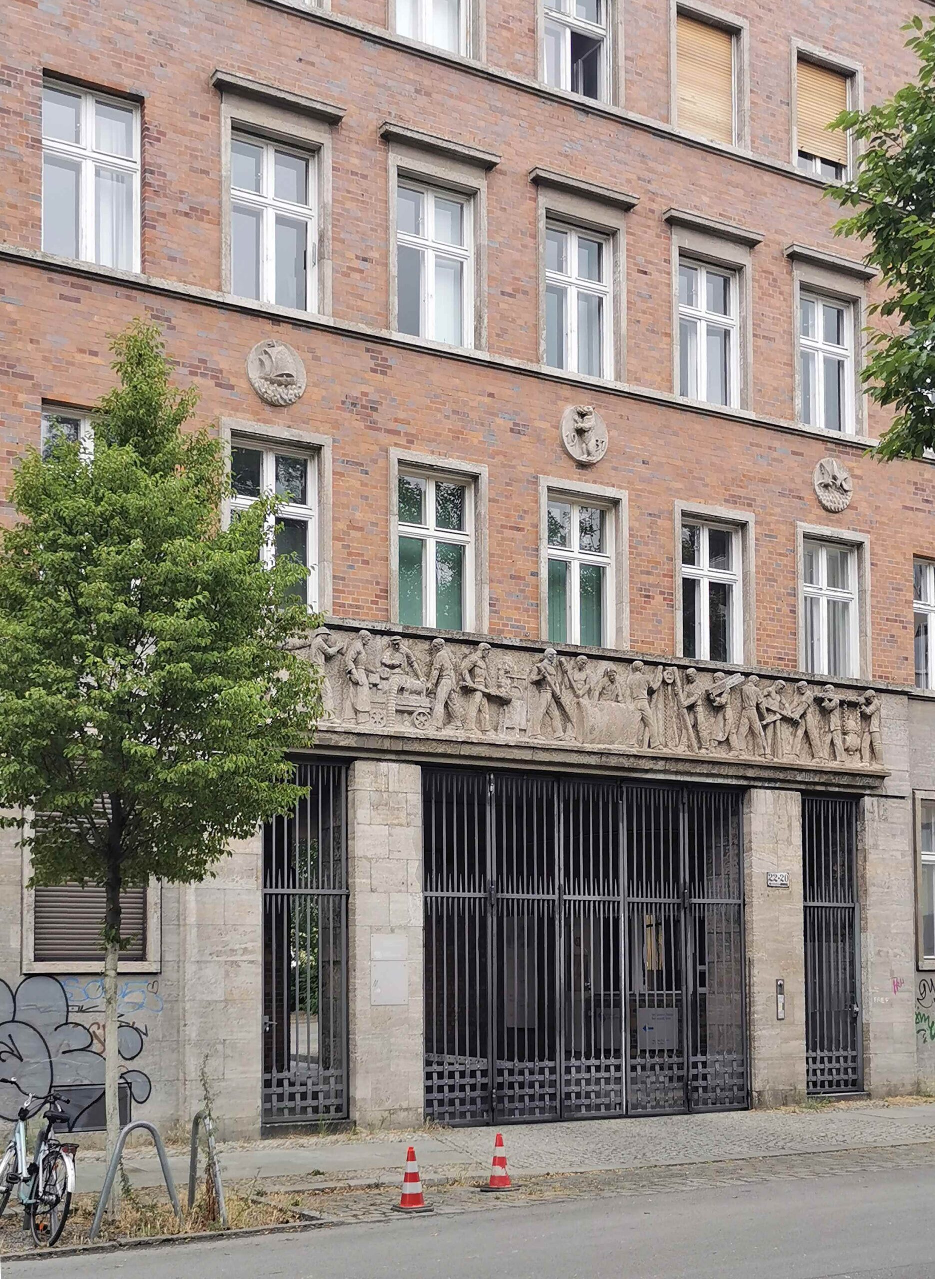 Das fünfgeschossige Gebäude hat eine klar strukturierte Fassade mit Muschelkalkverkleidung im Sockelgeschoss und einer sachlich gestalteten, gleichmäßig gerasterten rote Klinkerfassade, die durch schmale durchgehende Sohlbankgesimse horizontal gegliedert wird. Die breite Hofdurchfahrt ist durch seitliche Pilaster und zwei eingestellte Pfeiler betont.