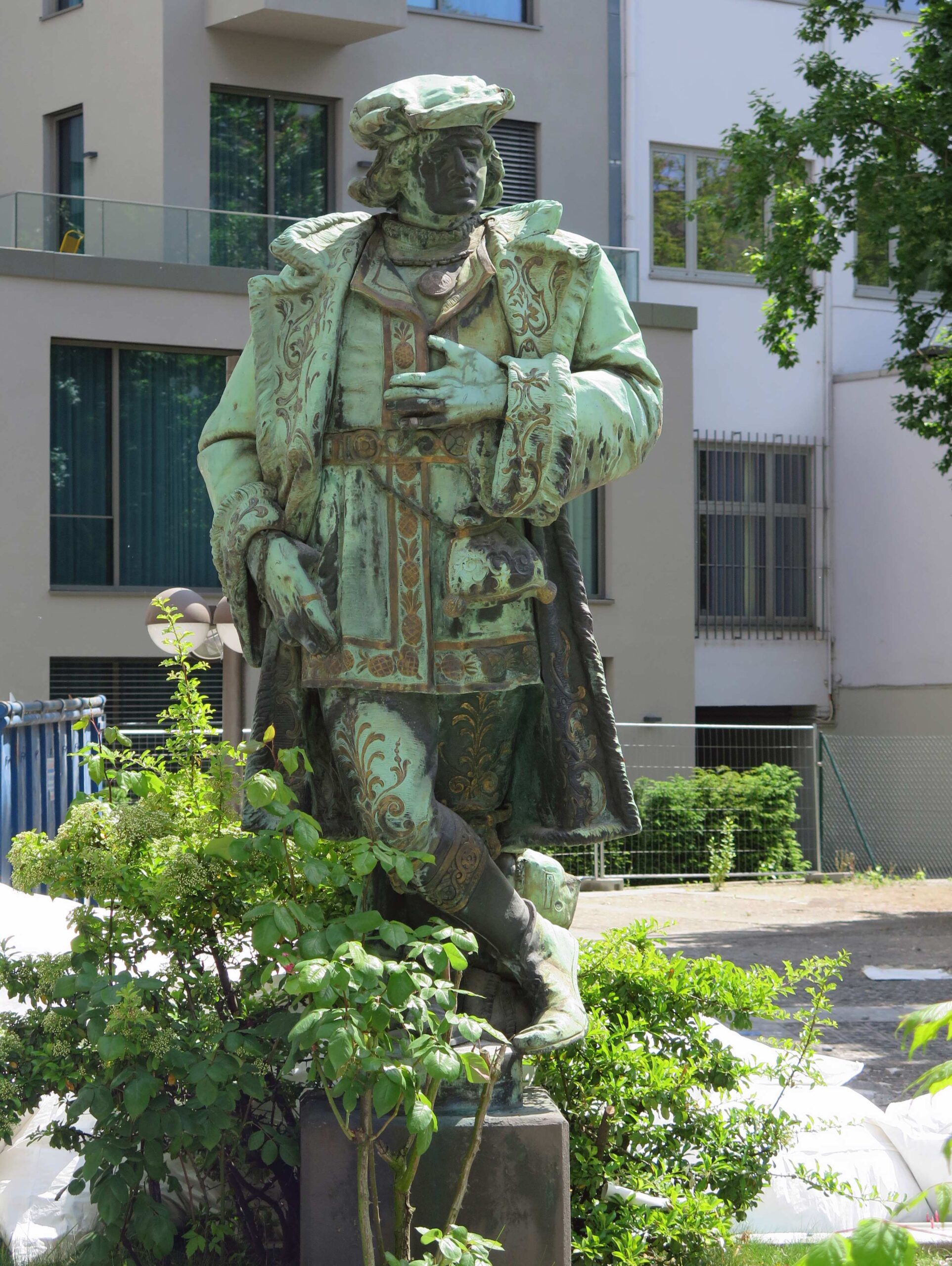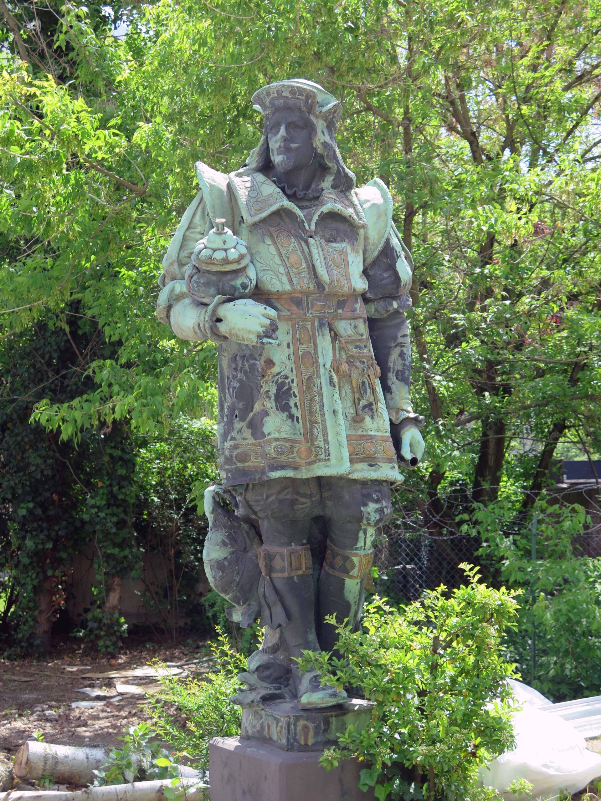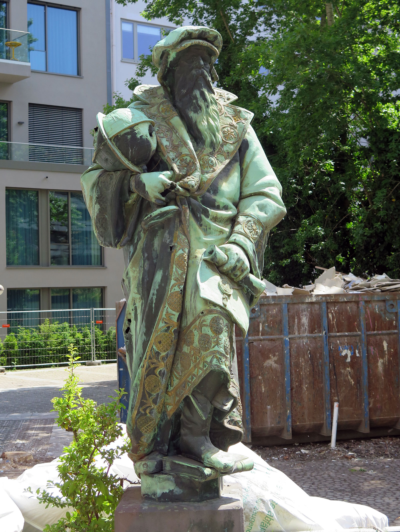 Vier überlebensgroße männliche, allegorische Standfiguren in einer Bekleidung der Spätgotik und Frührenaissance mit verschiedenen Attributen (Geldbeutel, Hammer, Schriftrolle, Globus) über rechteckigen Plinthen.