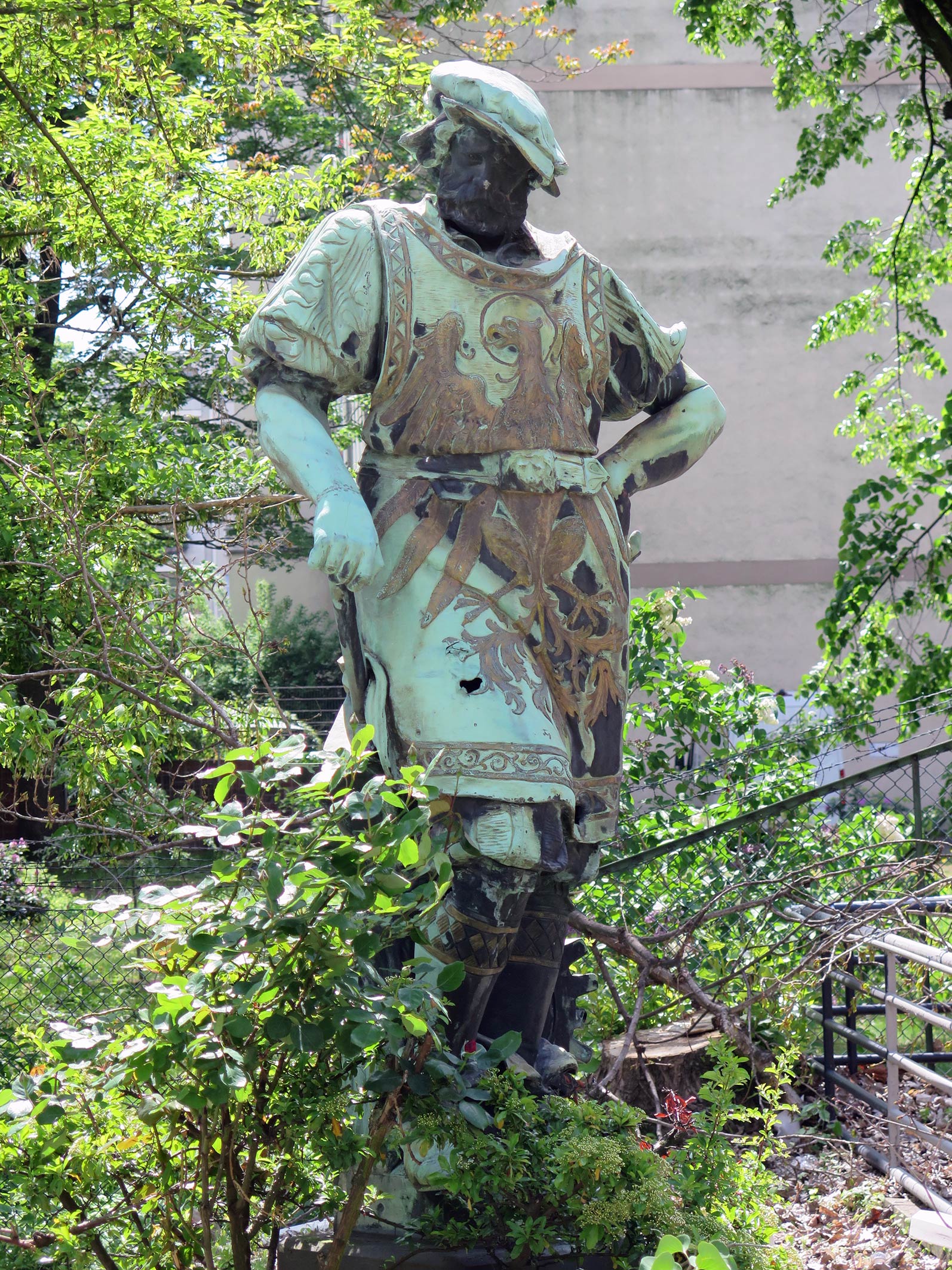 Vier überlebensgroße männliche, allegorische Standfiguren in einer Bekleidung der Spätgotik und Frührenaissance mit verschiedenen Attributen (Geldbeutel, Hammer, Schriftrolle, Globus) über rechteckigen Plinthen.