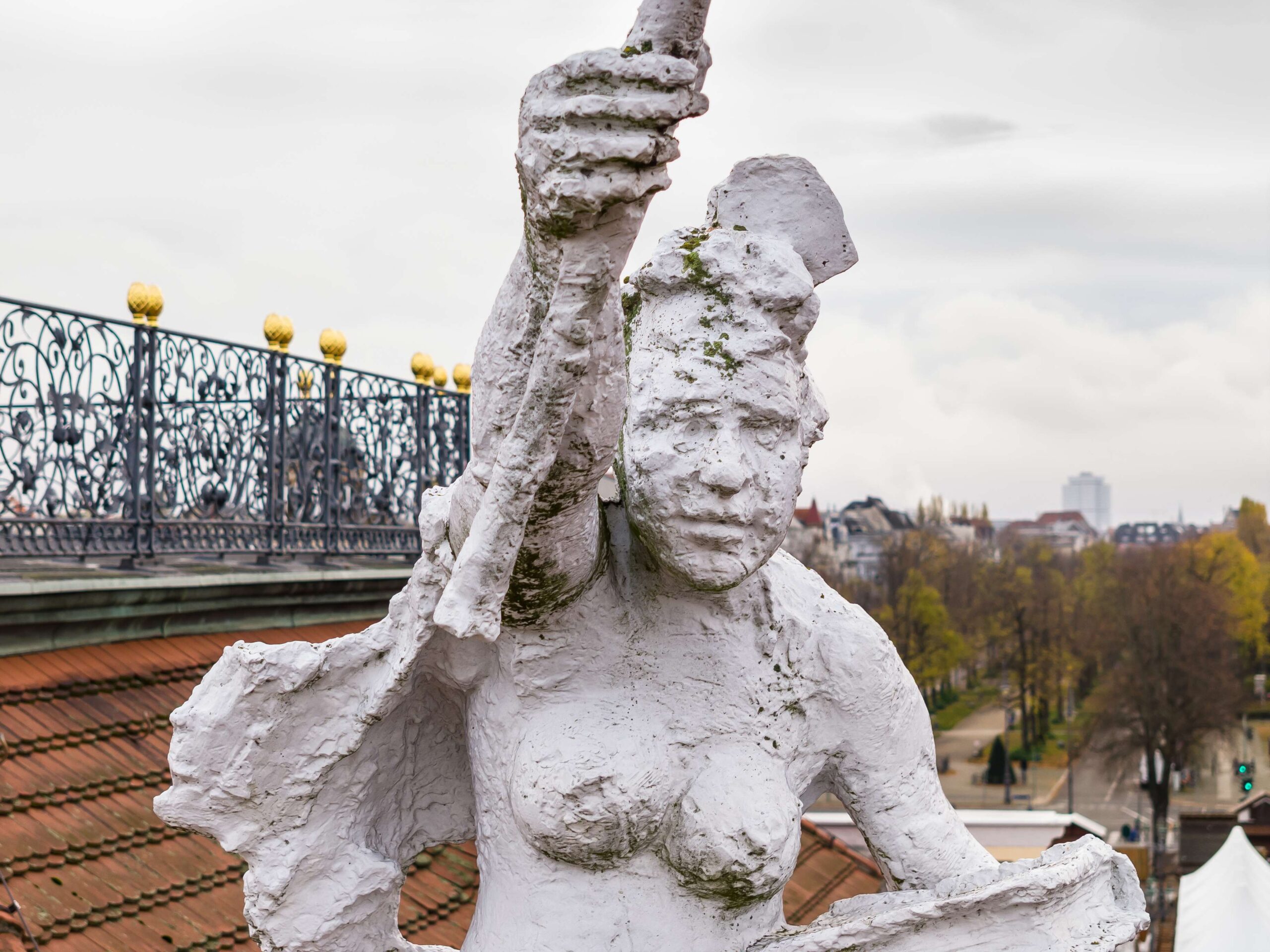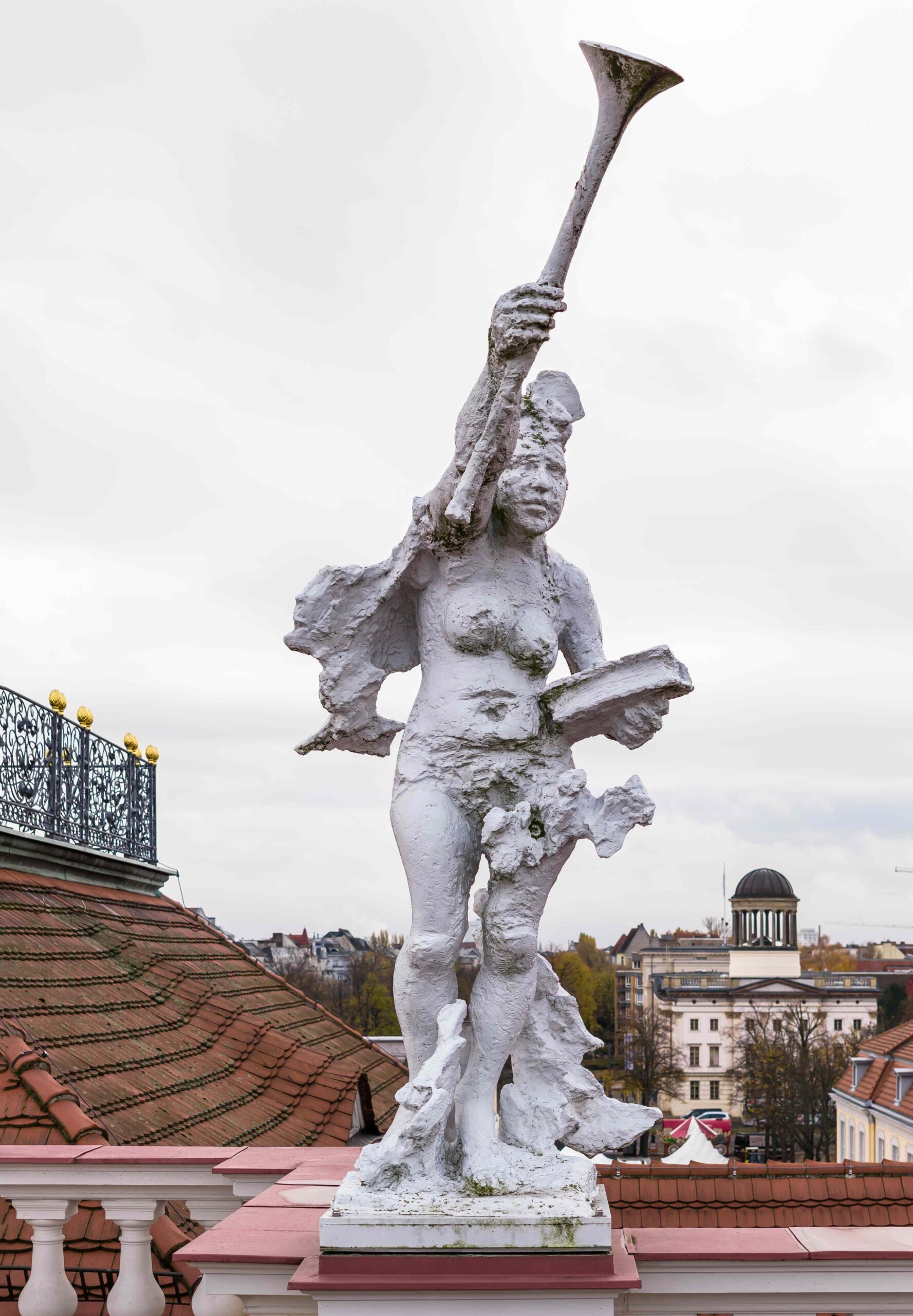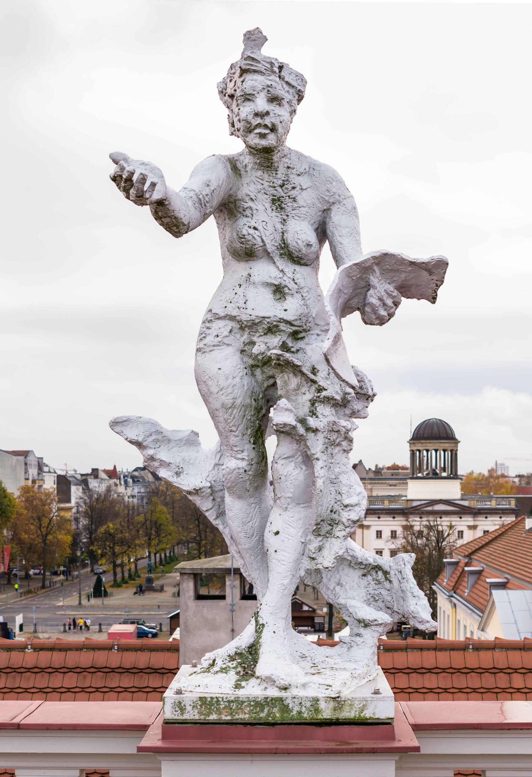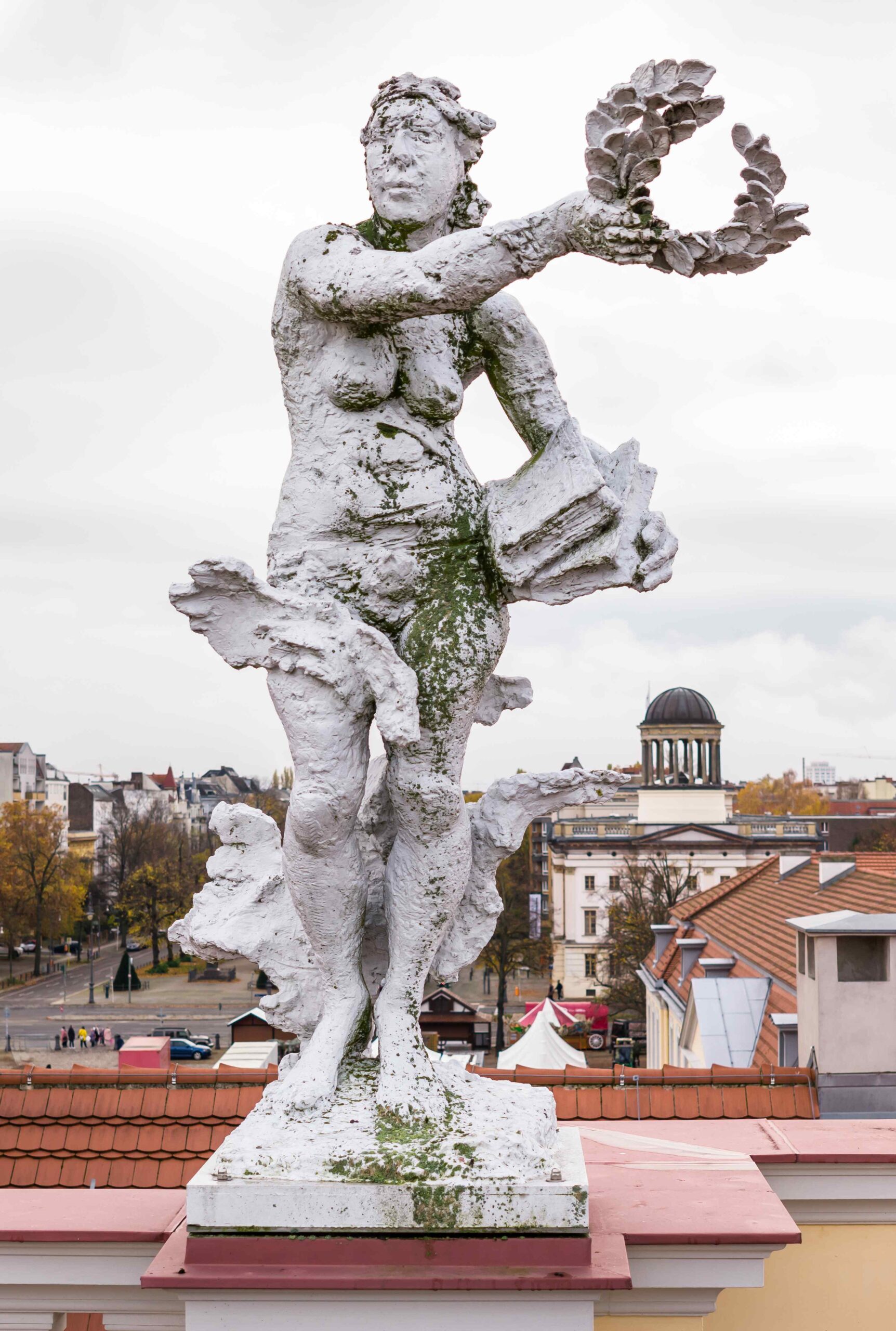 Vier Attikafiguren in Gestalt impressionistisch interpretierter barocker Plastik, nach Modellen in Aluminiumguss ausgeführt und als Teil der Attikagestaltung weiß gefasst. Joachim Dunkel gestaltete die Themen Klio, Melpomene, Polhymnia und Kalliope (Marc Wellmann).