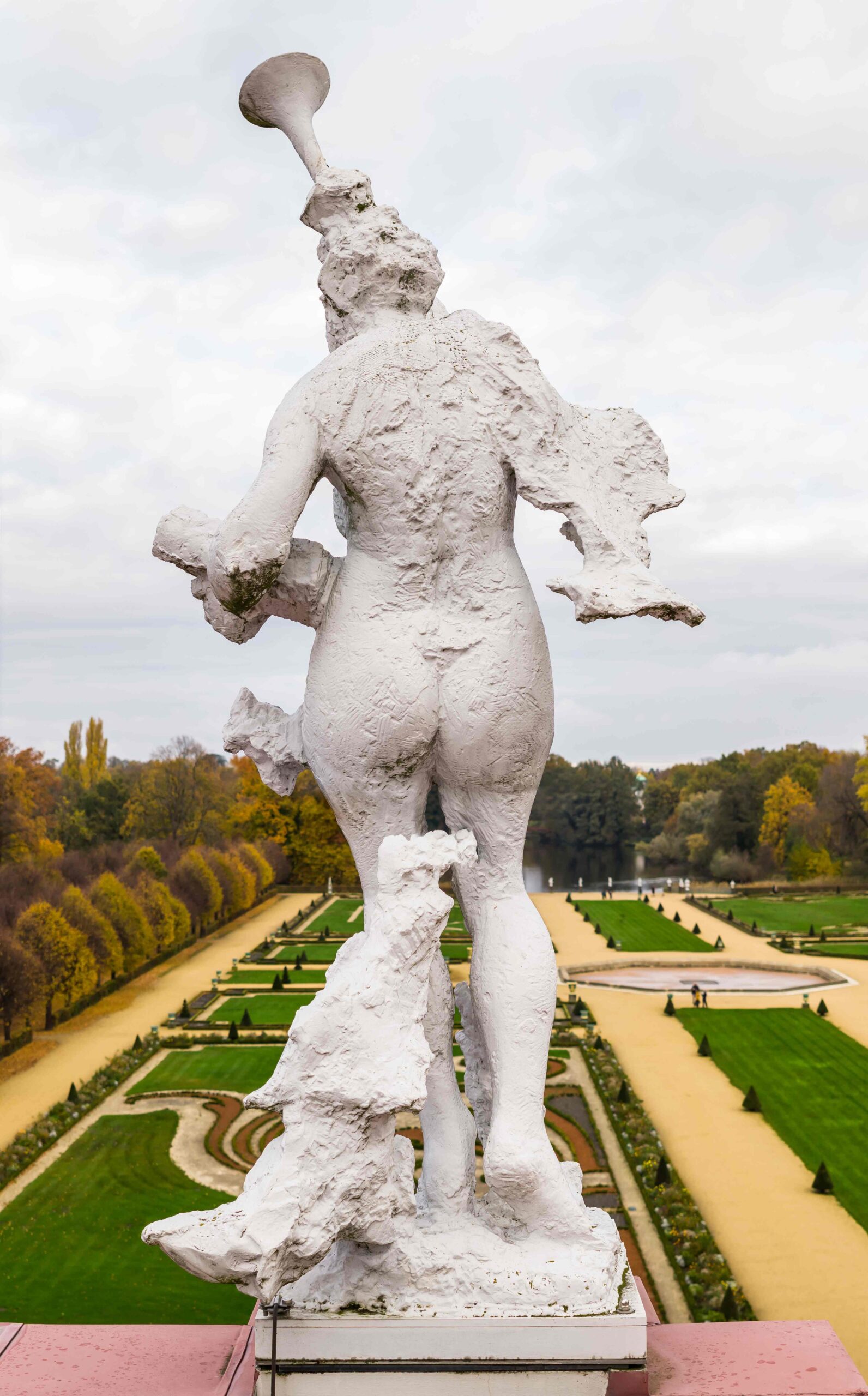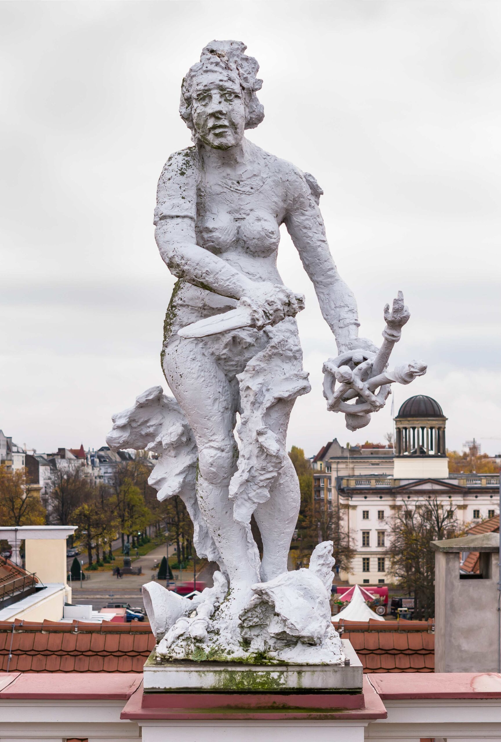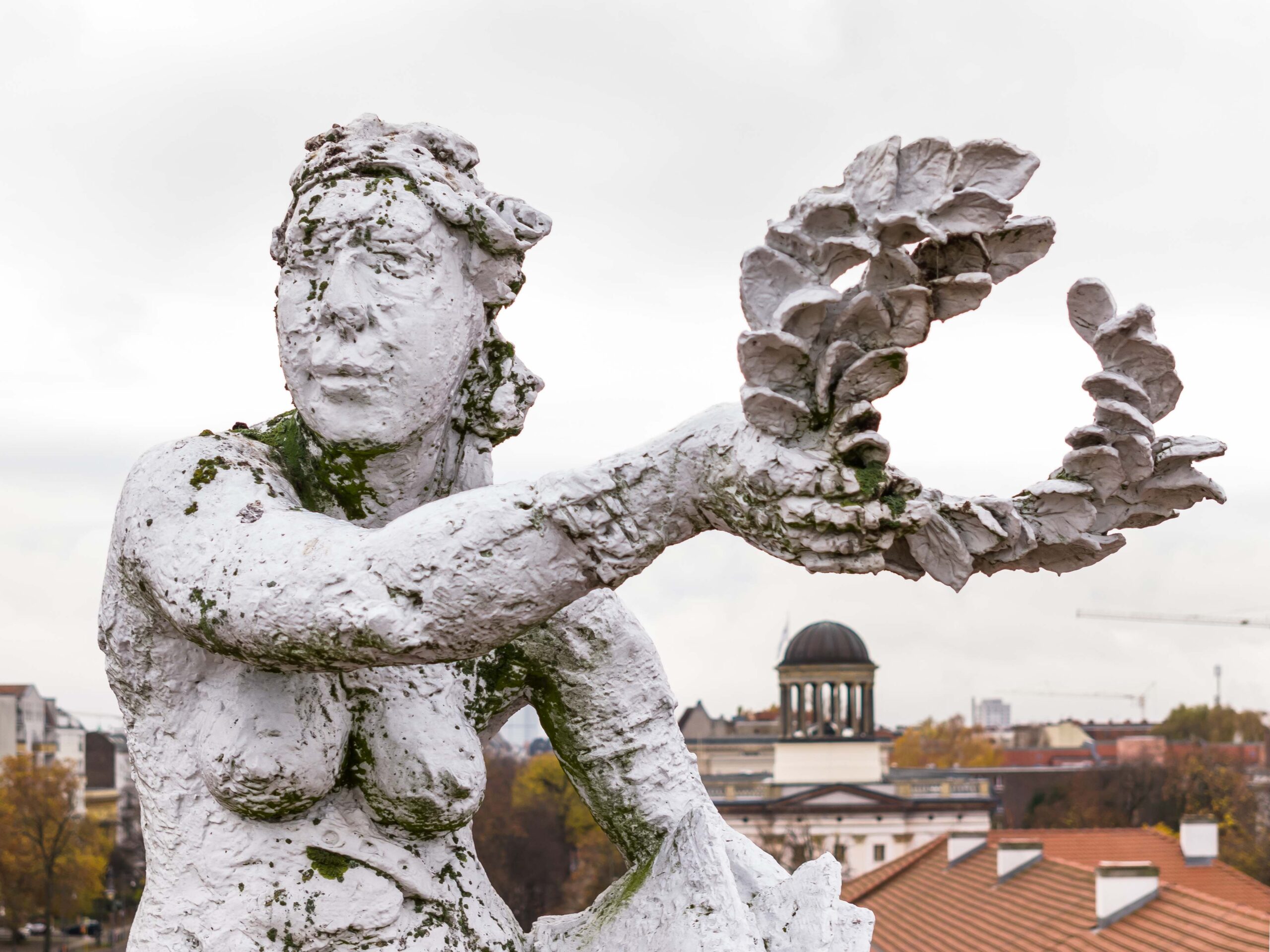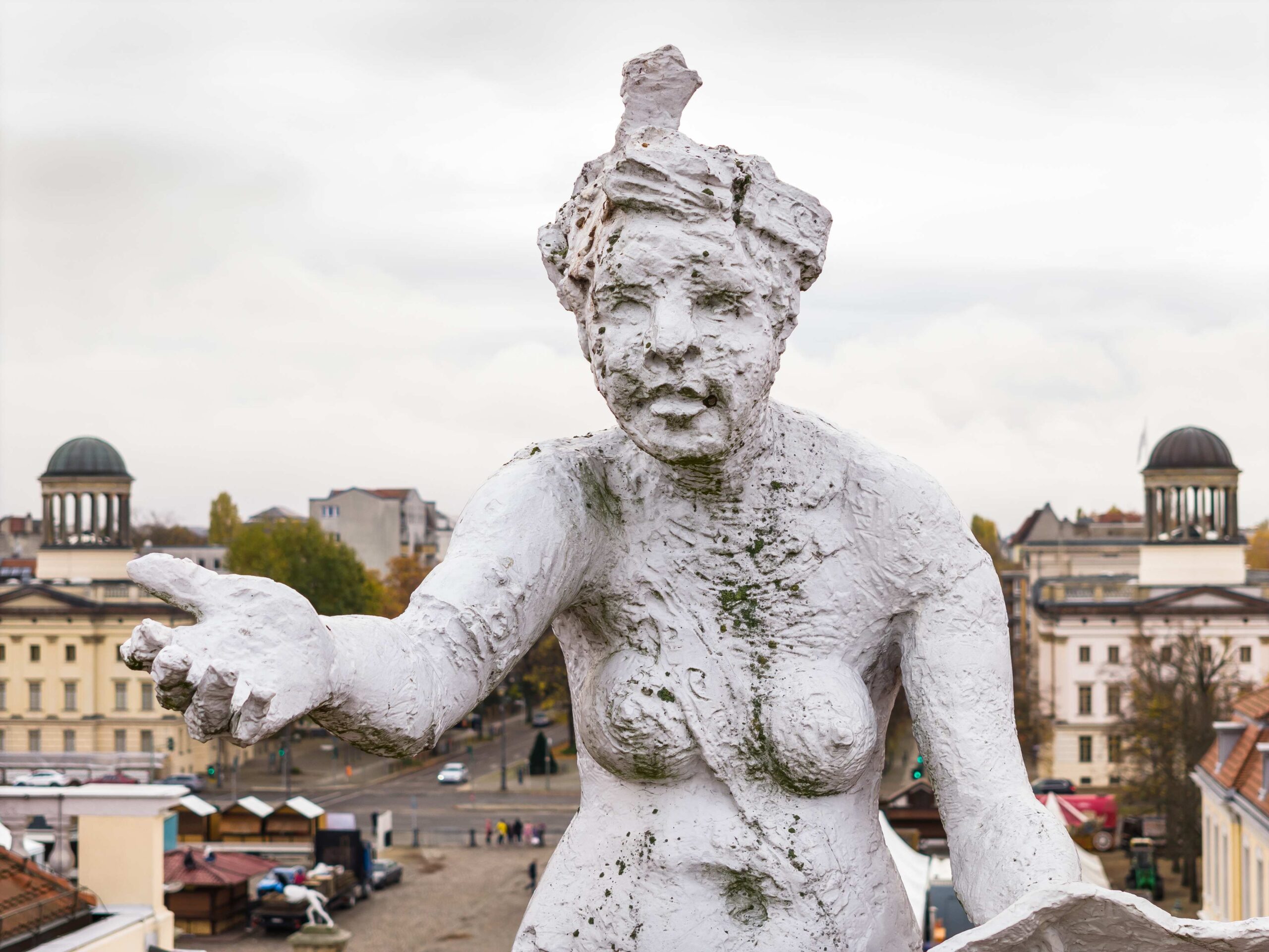 Vier Attikafiguren in Gestalt impressionistisch interpretierter barocker Plastik, nach Modellen in Aluminiumguss ausgeführt und als Teil der Attikagestaltung weiß gefasst. Joachim Dunkel gestaltete die Themen Klio, Melpomene, Polhymnia und Kalliope (Marc Wellmann).