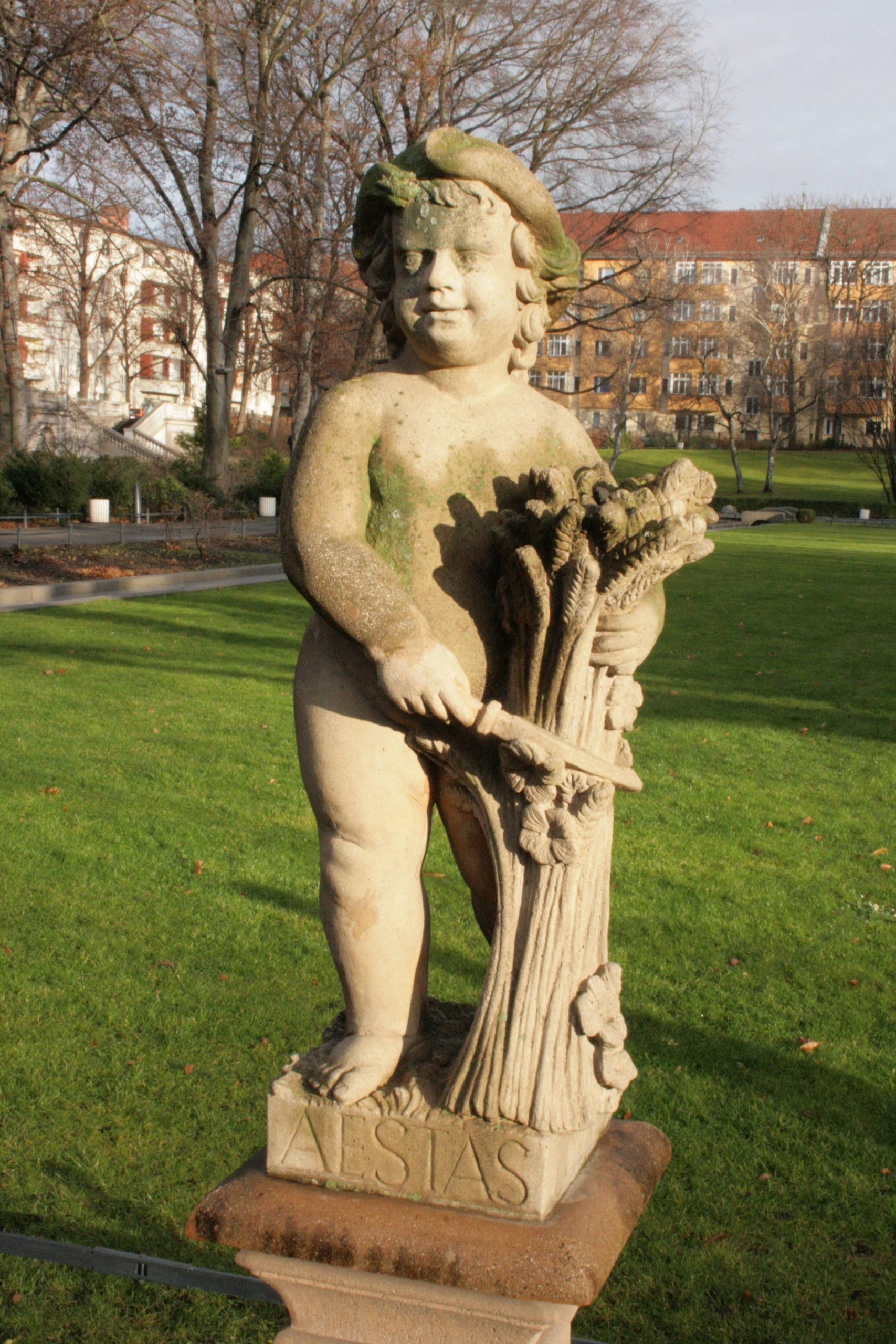 Die vier Allegorien der Jahreszeiten sind in Gestalt von barocken Putten auf geschweiften Sockeln formuliert. Sie halten die für die Jahreszeitenfolgen des 18. Jahrhunderts typischen Attribute (Blumen, Korn, Weintrauben, Feuer/wärmende Decke) und sind zur weiteren Kennzeichnung mit Bezeichnungen an den Plinthen ausgestattet. Der Frühling, mit dem die Reihe von links beginnt, zeigt das Kürzel VER für Vertumnus, die folgenden Figuren tragen die Bezeichnung AESTAS (Sommer), AUTUMNUS (Herbst) und der Winter HIEMAS. Die Figuren sind aus sandsteinfarbenem Kunststein (Beton) gearbeitet (Susanne Kähler, Jörg Kuhn).