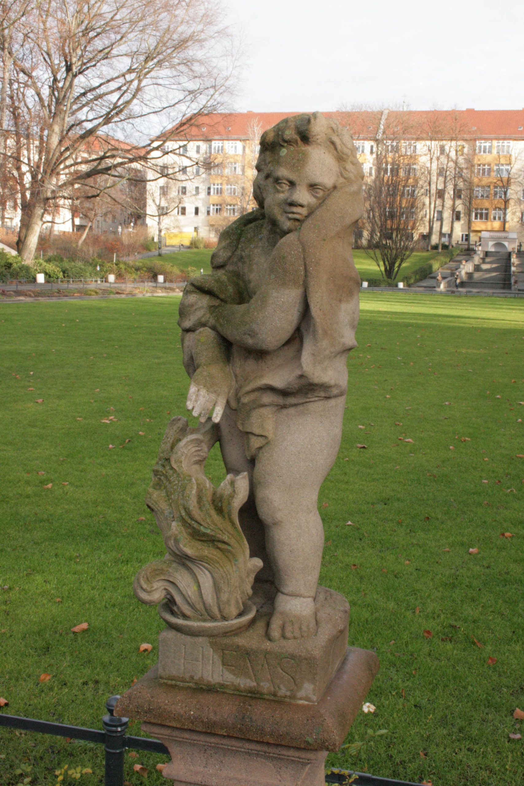 Die vier Allegorien der Jahreszeiten sind in Gestalt von barocken Putten auf geschweiften Sockeln formuliert. Sie halten die für die Jahreszeitenfolgen des 18. Jahrhunderts typischen Attribute (Blumen, Korn, Weintrauben, Feuer/wärmende Decke) und sind zur weiteren Kennzeichnung mit Bezeichnungen an den Plinthen ausgestattet. Der Frühling, mit dem die Reihe von links beginnt, zeigt das Kürzel VER für Vertumnus, die folgenden Figuren tragen die Bezeichnung AESTAS (Sommer), AUTUMNUS (Herbst) und der Winter HIEMAS. Die Figuren sind aus sandsteinfarbenem Kunststein (Beton) gearbeitet (Susanne Kähler, Jörg Kuhn).
