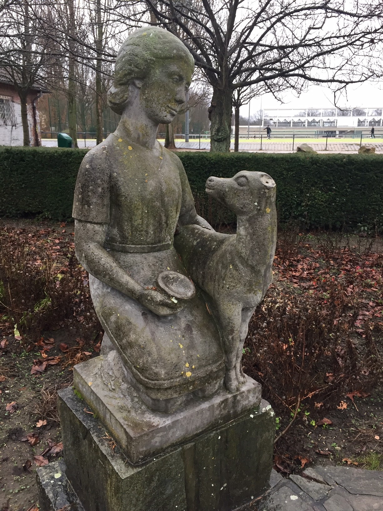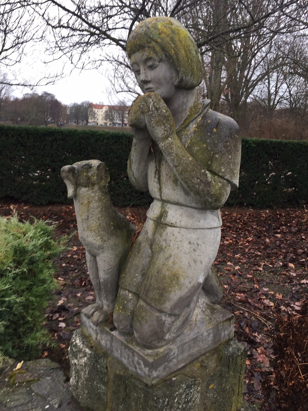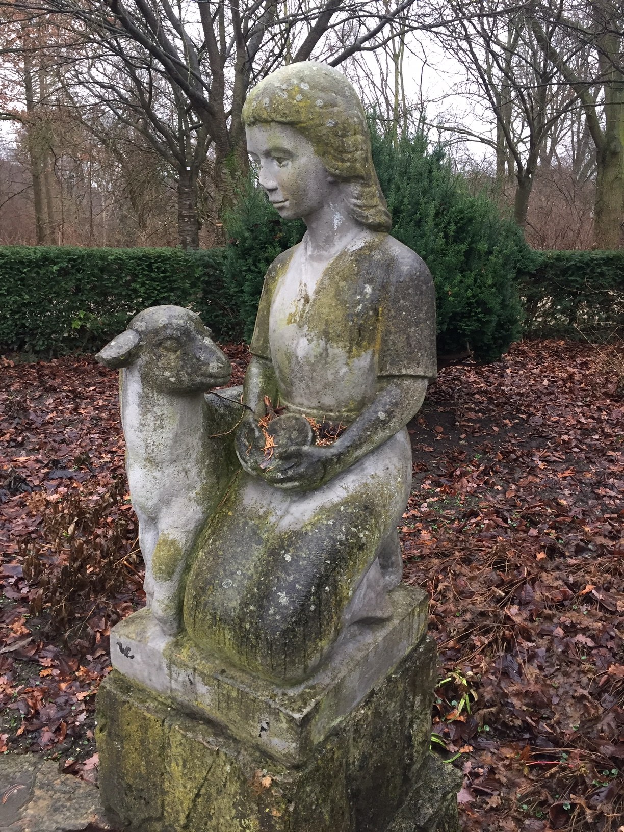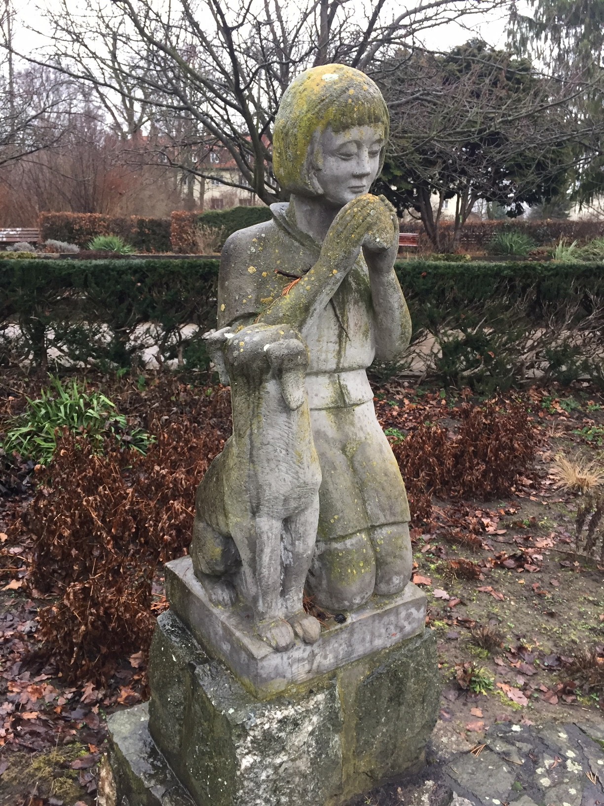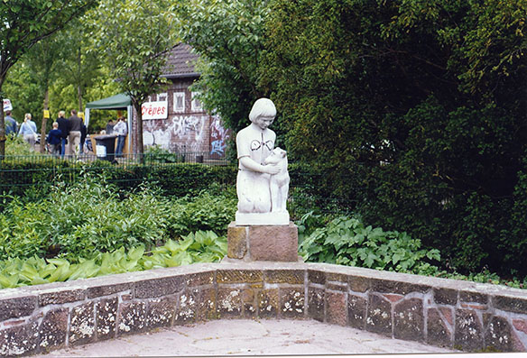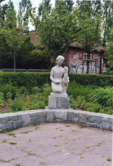 Die vier Ecken, des sich östlich des Blümelteichs (Modellbootteichs) befindlichen Staudengartens im Volkspark Mariendorf sind durch viereckige natursteingepflasterte Plätze betont, die jeweils durch zur Mitte hin offene niedrige Bruchsteinmauern eingefasst werden. Auffällig ist allerdings, dass bei den jeweiligen Ecken unterschiedliche Bruchsteine verwendet worden sind. An den äußeren Ecken der Mauern steht jeweils ein annähernd quadratischer Bruchsteinsockel und jeweils einer der vier Kinderfiguren aus hellgrauem Gussstein. Folgende Figuren sind vorhanden: Mädchen Reh (nordöstliche Platzecke), Knabe mit Hund (südöstliche Ecke), Mädchen mit Lamm (südwestliche Ecke), Knabe mit Ziegenböckchen (nordwestliche Ecke). Alle vier Kinderfiguren sind knieend dargestellt, rechts oder links von ihnen steht oder sitzt jeweils das Tier. Kinder- und Tiergestalten wenden sich jeweils einander zu. Die beiden Mädchenfiguren halten jeweils eine Schale zur Fütterung der Tiere, der Knabe mit Ziegenbock streichelt seinen Begleiter mit beiden Händen und der Knabe mit Hund ist gleichzeitig als Okarina-Spieler dargestellt, er hält die zapfenförmige tönerne Gefäßflöte an mit beiden Händen an seinen Mund.