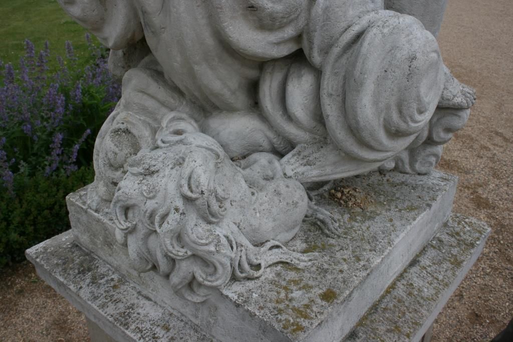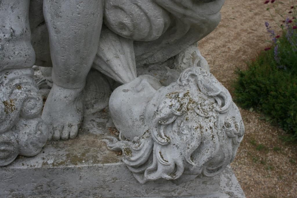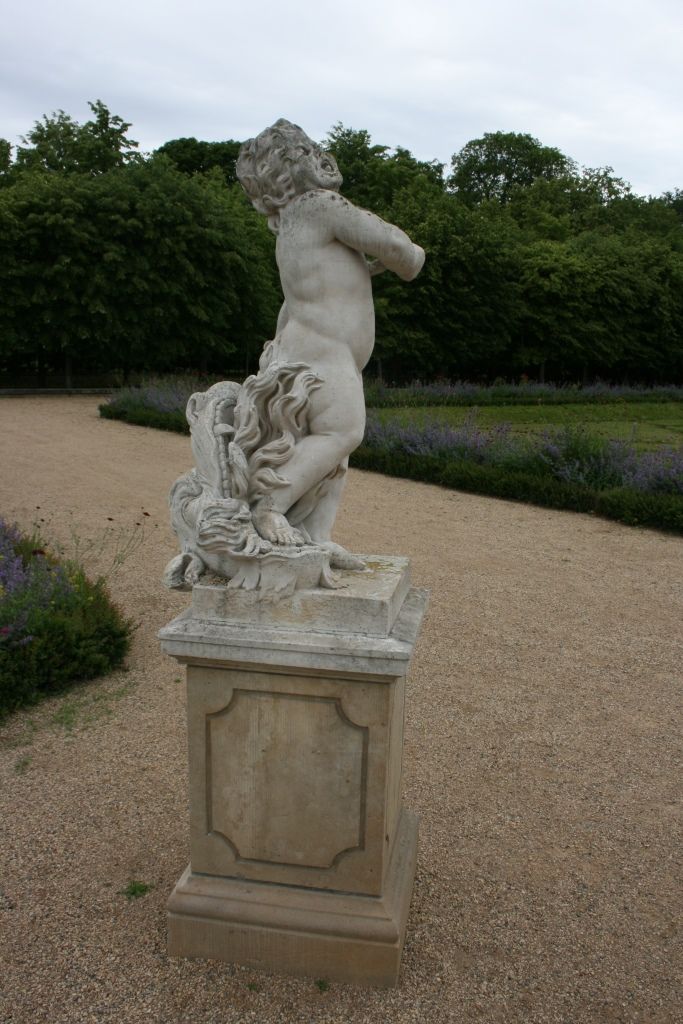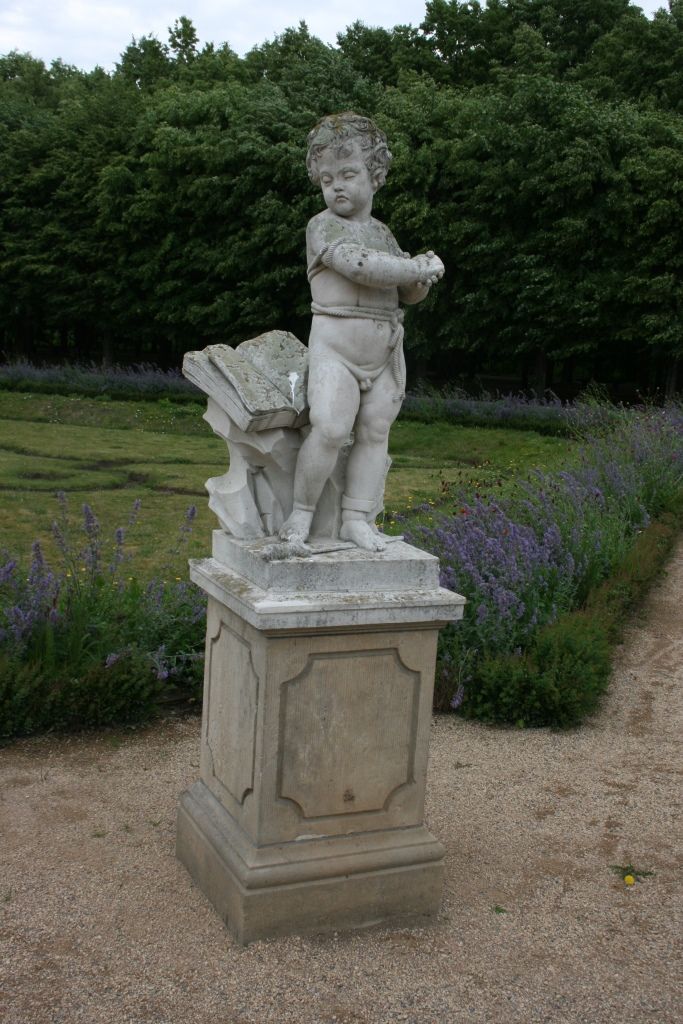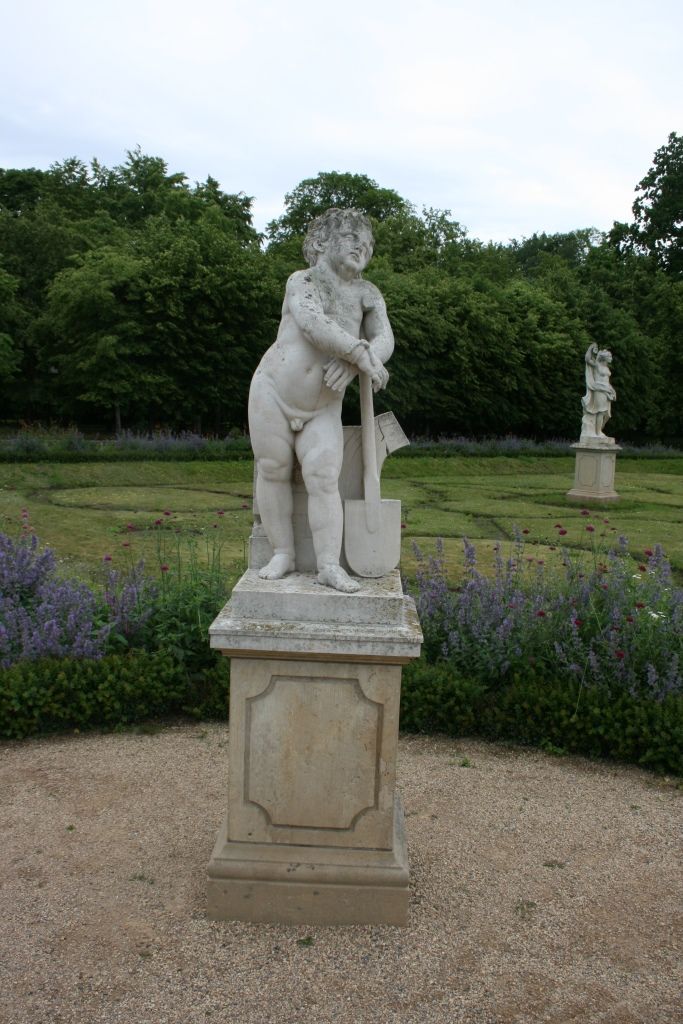 Nach Vorbildern des frühen 18. Jahrhunderts; 1987 aufgestellt. "Kopien nach Originalen aus der Skulpturensammlung der Staatlichen Museen Berlin, die in der 1. Hälfte des 18. Jahrhunderts entstanden sein dürften. Die Originale standen einst vermutlich im Schlosspark Niederschönhausen, die Kopien schuf in den (19)70er Jahren die Bildhauerwerkstatt des VEB Stuck und Naturstein Berlin" (Stefanie Endlich, 1990). "Die gelungenen Putten, die die vier Temperamente darstellen, wurden von Gottfried Knöffler geschaffen (...) Die Figuren entstanden 1763-(17)70 in Berlin für den Schloßpark Niederschönhausen (...) Die Originale befinden sich im Bodemuseum zu Berlin" (E. Matthies, 2009, S. 75). Zutreffend ist, dass sich die Originale der vier Putten im Bode-Museum aufbewahrt werden. Die barocken Originale standen viele Jahrzehnte im Vorgarten des so genannten Kavalierhauses in der Breitestraße 45 in Berlin-Pankow (vgl. Gerhard Kapitän: "Vier Gartenplastiken des Berliner Barock", in: Bildende Kunst, Jahrgang 1955, Heft 1, S. 130-133; Eva Mühlbächer: "Gottfried Knöffler als Bildhauer der 'Pankower Putten'", in: Forschungen und Berichte, Hg. von den Staatl. Museen zu Berlin Preußischer Kulturbesitz, Bd. 31 (1991), S. 211-220). Das in der zweiten Hälfte des 18. Jahrhunderts errichtete eingeschossige Gebäude mit Krüppelwalmdach diente ab 1866 als Wohnhaus der Familie des Schokoladenfabrikanten Richard Hildebrand (1858-1937) und wurde als "Hildebrandsche Villa" bekannt. Wann die barocken Putten in den Vorgarten gelangten, scheint ungeklärt zu sein. Im Jahr 2000 wurden im Garten Breitestraße 45 vier Kopien aufgestellt. Die Kopien im Schloßpark Friedrichsfelde sind also etwa 20 Jahren früher entstanden. Die am - vom Schloss aus gesehen - hinteren Platz an einer Wegekreuzung im Bereich der Mittelachse des Nordparterres aufgestellten Putten stellen allegorisch die vier menschlichen Temperamente dar. Der Choleriker steckt in einem Drachenmaul, aus dem die Flammen emporzüngeln. Er schreit mit weit geöffnetem Mund und hält einen Dolch gegen den Oberkörper gerichtet. Diese Figur lässt sich zusätzlich auch als Allegorie des Feuers beschreiben. Der Sanguiniker wird offenbar von den heftig blasenden Windgöttern zu leidenschaftlichem Tun getragen. Hier wird auch eine Allegorie der Luft mitillustriert. Dem Melancholiker sind Attribute beigelegt, die Schwermut andeuten können: Buch, Fesseln, Dolch. Der Phlegmatiker hält zwar einen Spaten, der Arbeit anzeigen könnte, doch lässt das ruinöse oder unvollendete Bauwerk als Hinweis auf reichlich verflossene Zeit ohne Einsatz lesen, da dem Phlegmatiker scheinbar die Hände gebunden sind. Gleichwohl die Nachricht vorliegt, dass die Figuren aus Sandstein gearbeitet seien, haben sie die Anmutung von Kunststeinfiguren. Dies könnte an der Fassung/Lasur liegen (Jörg Kuhn, Susanne Kähler, Nicola Vösgen).