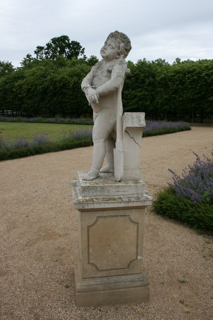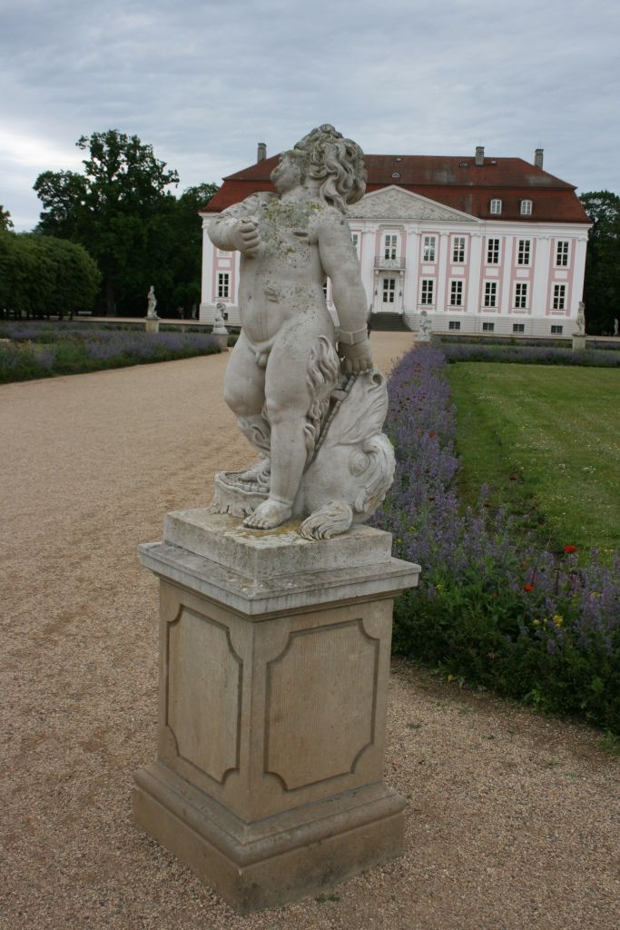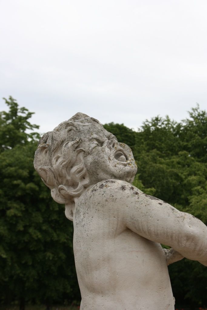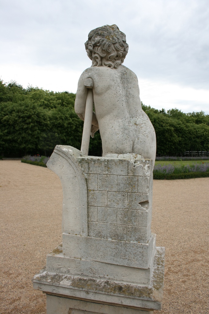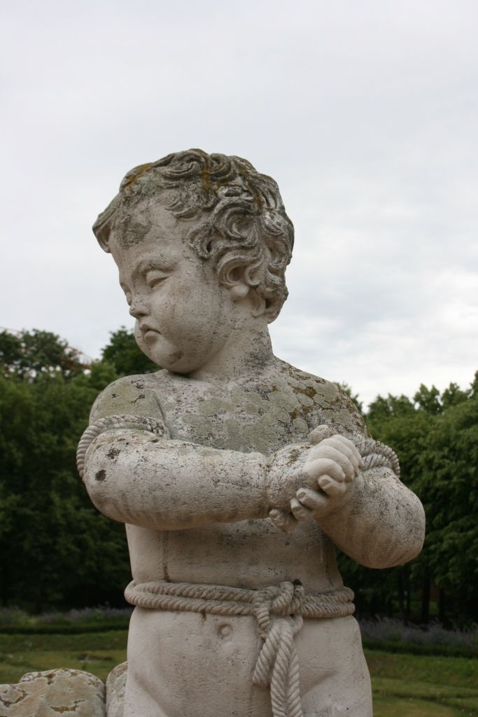 Nach Vorbildern des frühen 18. Jahrhunderts; 1987 aufgestellt. "Kopien nach Originalen aus der Skulpturensammlung der Staatlichen Museen Berlin, die in der 1. Hälfte des 18. Jahrhunderts entstanden sein dürften. Die Originale standen einst vermutlich im Schlosspark Niederschönhausen, die Kopien schuf in den (19)70er Jahren die Bildhauerwerkstatt des VEB Stuck und Naturstein Berlin" (Stefanie Endlich, 1990). "Die gelungenen Putten, die die vier Temperamente darstellen, wurden von Gottfried Knöffler geschaffen (...) Die Figuren entstanden 1763-(17)70 in Berlin für den Schloßpark Niederschönhausen (...) Die Originale befinden sich im Bodemuseum zu Berlin" (E. Matthies, 2009, S. 75). Zutreffend ist, dass sich die Originale der vier Putten im Bode-Museum aufbewahrt werden. Die barocken Originale standen viele Jahrzehnte im Vorgarten des so genannten Kavalierhauses in der Breitestraße 45 in Berlin-Pankow (vgl. Gerhard Kapitän: "Vier Gartenplastiken des Berliner Barock", in: Bildende Kunst, Jahrgang 1955, Heft 1, S. 130-133; Eva Mühlbächer: "Gottfried Knöffler als Bildhauer der 'Pankower Putten'", in: Forschungen und Berichte, Hg. von den Staatl. Museen zu Berlin Preußischer Kulturbesitz, Bd. 31 (1991), S. 211-220). Das in der zweiten Hälfte des 18. Jahrhunderts errichtete eingeschossige Gebäude mit Krüppelwalmdach diente ab 1866 als Wohnhaus der Familie des Schokoladenfabrikanten Richard Hildebrand (1858-1937) und wurde als "Hildebrandsche Villa" bekannt. Wann die barocken Putten in den Vorgarten gelangten, scheint ungeklärt zu sein. Im Jahr 2000 wurden im Garten Breitestraße 45 vier Kopien aufgestellt. Die Kopien im Schloßpark Friedrichsfelde sind also etwa 20 Jahren früher entstanden. Die am - vom Schloss aus gesehen - hinteren Platz an einer Wegekreuzung im Bereich der Mittelachse des Nordparterres aufgestellten Putten stellen allegorisch die vier menschlichen Temperamente dar. Der Choleriker steckt in einem Drachenmaul, aus dem die Flammen emporzüngeln. Er schreit mit weit geöffnetem Mund und hält einen Dolch gegen den Oberkörper gerichtet. Diese Figur lässt sich zusätzlich auch als Allegorie des Feuers beschreiben. Der Sanguiniker wird offenbar von den heftig blasenden Windgöttern zu leidenschaftlichem Tun getragen. Hier wird auch eine Allegorie der Luft mitillustriert. Dem Melancholiker sind Attribute beigelegt, die Schwermut andeuten können: Buch, Fesseln, Dolch. Der Phlegmatiker hält zwar einen Spaten, der Arbeit anzeigen könnte, doch lässt das ruinöse oder unvollendete Bauwerk als Hinweis auf reichlich verflossene Zeit ohne Einsatz lesen, da dem Phlegmatiker scheinbar die Hände gebunden sind. Gleichwohl die Nachricht vorliegt, dass die Figuren aus Sandstein gearbeitet seien, haben sie die Anmutung von Kunststeinfiguren. Dies könnte an der Fassung/Lasur liegen (Jörg Kuhn, Susanne Kähler, Nicola Vösgen).