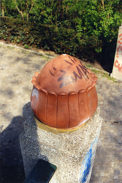 Diese die Pfeiler krönenden Schmuckformen sind nach der Wiederherstellung der Parkanlage im Jahre 1986 - nach den Plänen Erwin Barths von 1914 - vom Hochbauamt Charlottenburg bei dem Künstler Gerald Matzner in Auftrag gegeben worden. Es handelt sich um freie Gestaltungen Matzners, für dessen Werk surreale, humorvolle Elemente und Phantasien sowie die Verwendung menschlicher Körperteile typisch sind. Die vier Schmuckelemente sind aufgrund von Vandalismusschäden 1992 durch Kunststeinkopien mit Terracottafärbung ersetzt worden (Susanne Kähler).
